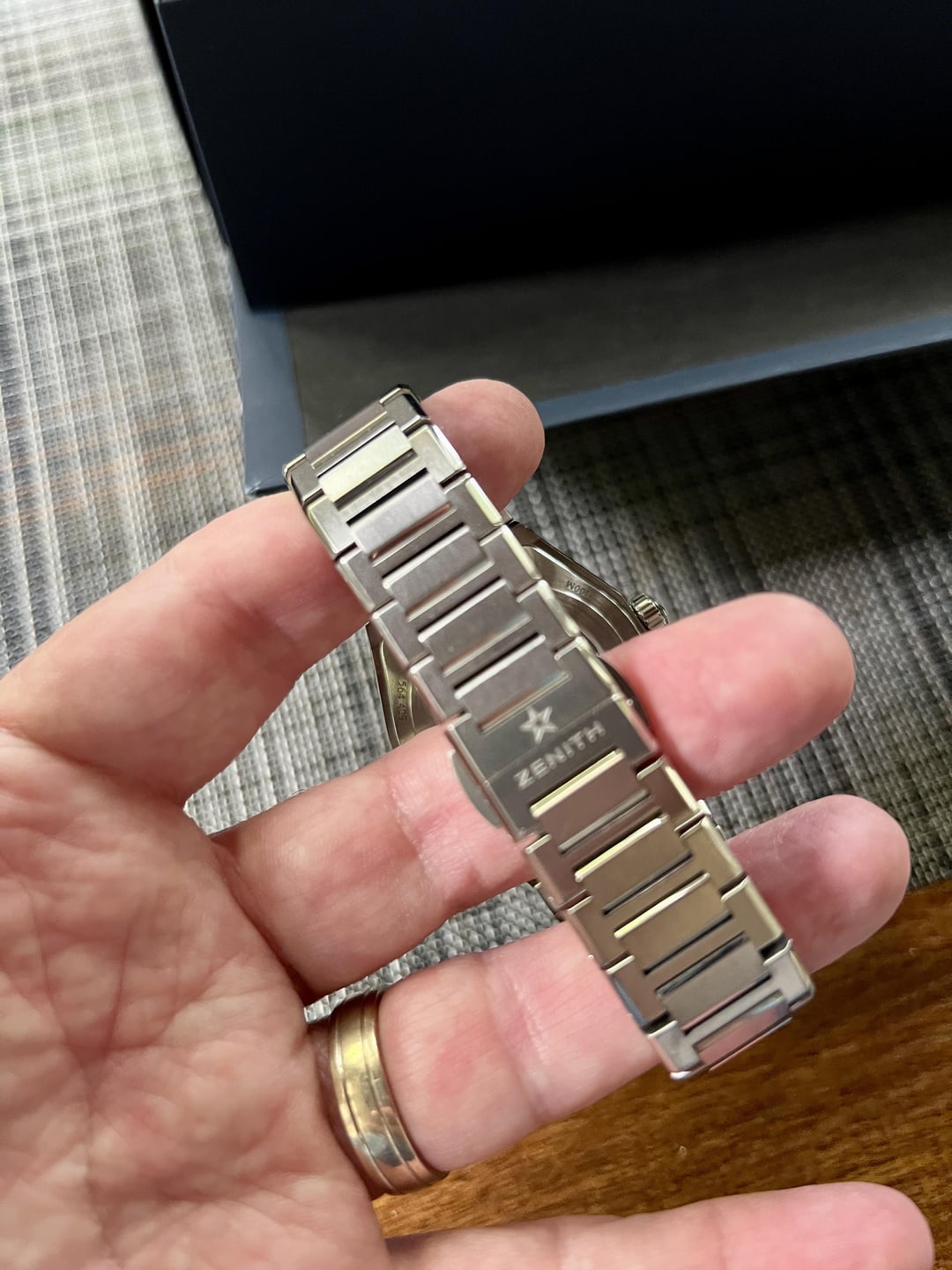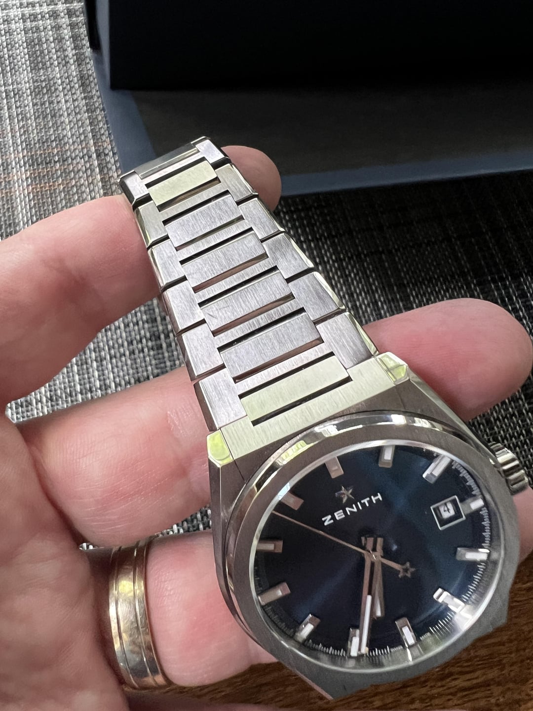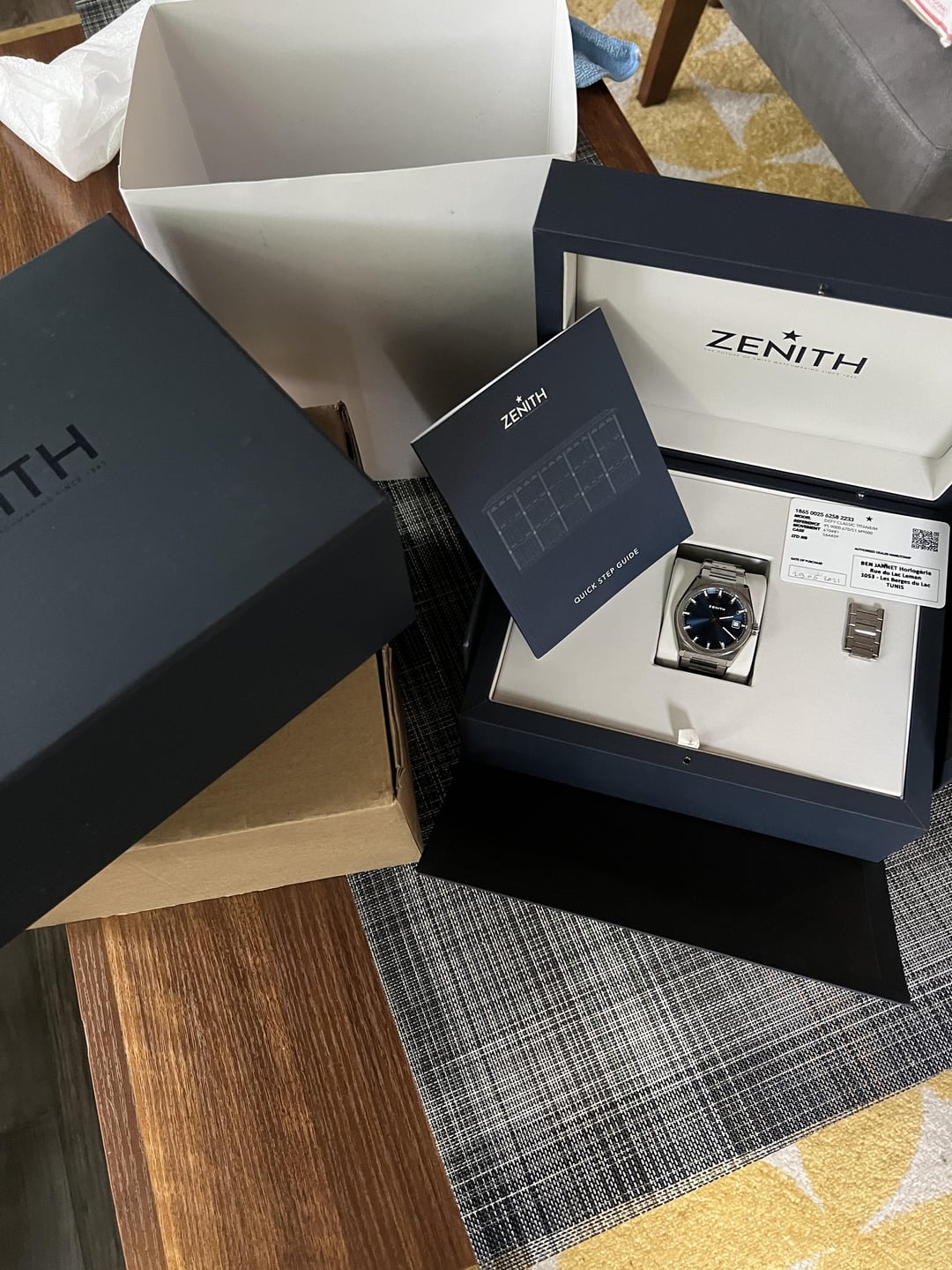 Trying to slim down the collection and putting up a few watches for sale for others to enjoy. Up for sale (or trade down) is my Zenith Defy Classic with blue sunray (or sunburst) dial. In full titanium with titanium bracelet, this is a dream on the wrist - plus, it's the goldilocks 41mm diameter. It looks like an integrated bracelet, but it's detachable with lugs of 22mm. Excellent condition, save for a slight mark on one of the links on the 12:00 side (only viewable in certain light, and of course not seen if you're wearing it.) Currently sized for a 7.3" wrist and comes with all links and triple-boxed full kit. It's pretty much an underrated future classic (feel free to google video reviews) and I can attest. Breaks my heart a little to have to sell. Asking $4,300 with a sale preferred but open to trades down (no micros, please.) Zelle, wire, F2F in Chicago accepted. Staying away from PayPal these days! Feel free to chat me here with questions. Thanks!