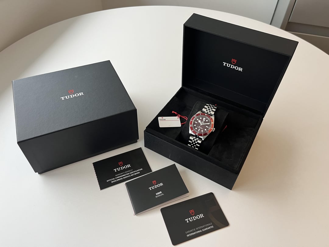Up for sale is a Tudor Black Bay 58 - Burgundy Dial - 39mm - M7939A1A0RU - Full Set - BRAND NEW Watch functions perfectly mechanically, without issue. Includes watch (fully linked), box (inner & outer), user manual, warranty manual, serialized hang tag, & warranty card (Dated 04/2025). Pristine unworn, brand new condition with no hairlines on clasp, case, and bracelet. Stickers still on inside of clasp. $4450 plus shipping Thanks!