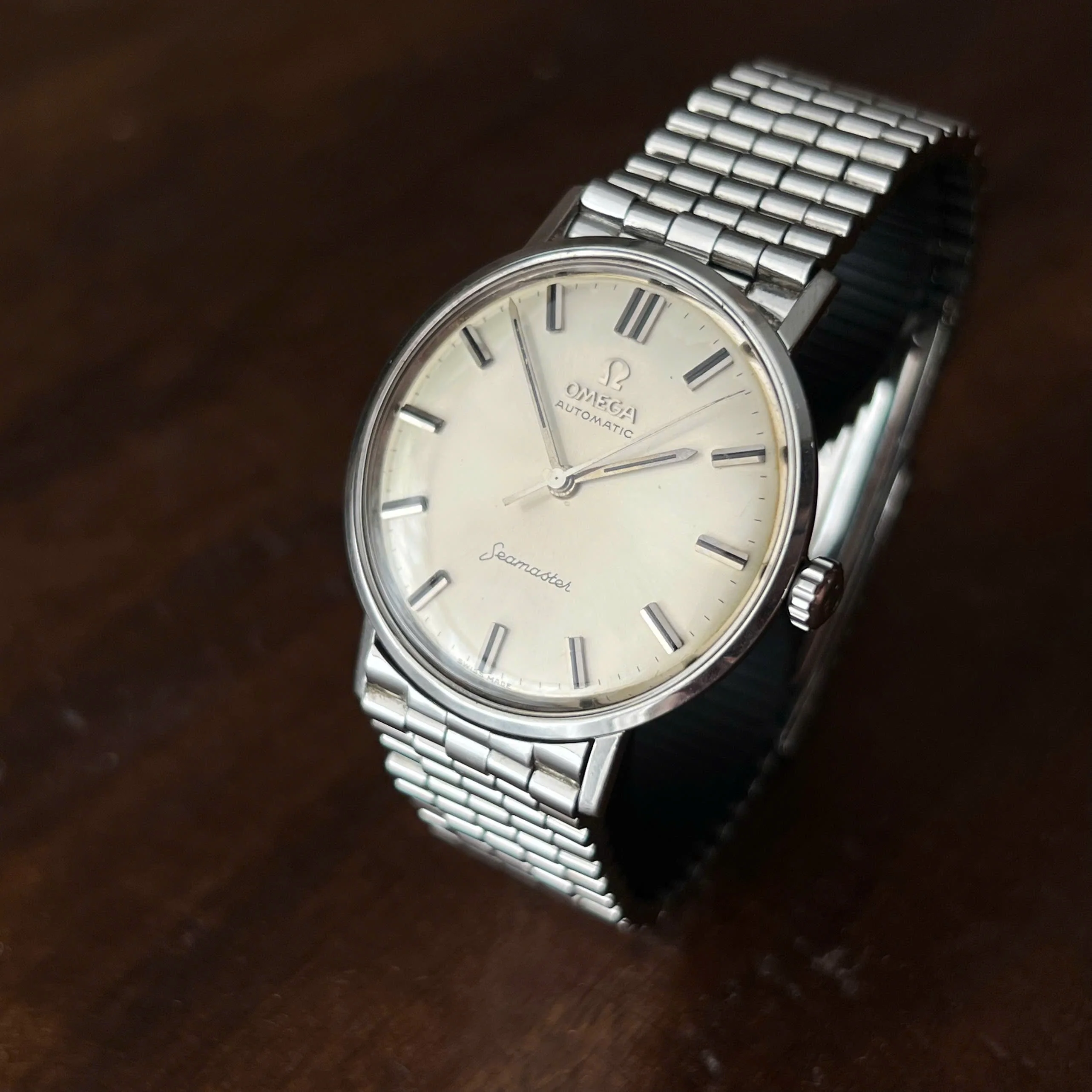 1961 Omega Seamaster ref. 14765 no-date, Cal. 552 – on 8260 “peanut” bracelet – $950