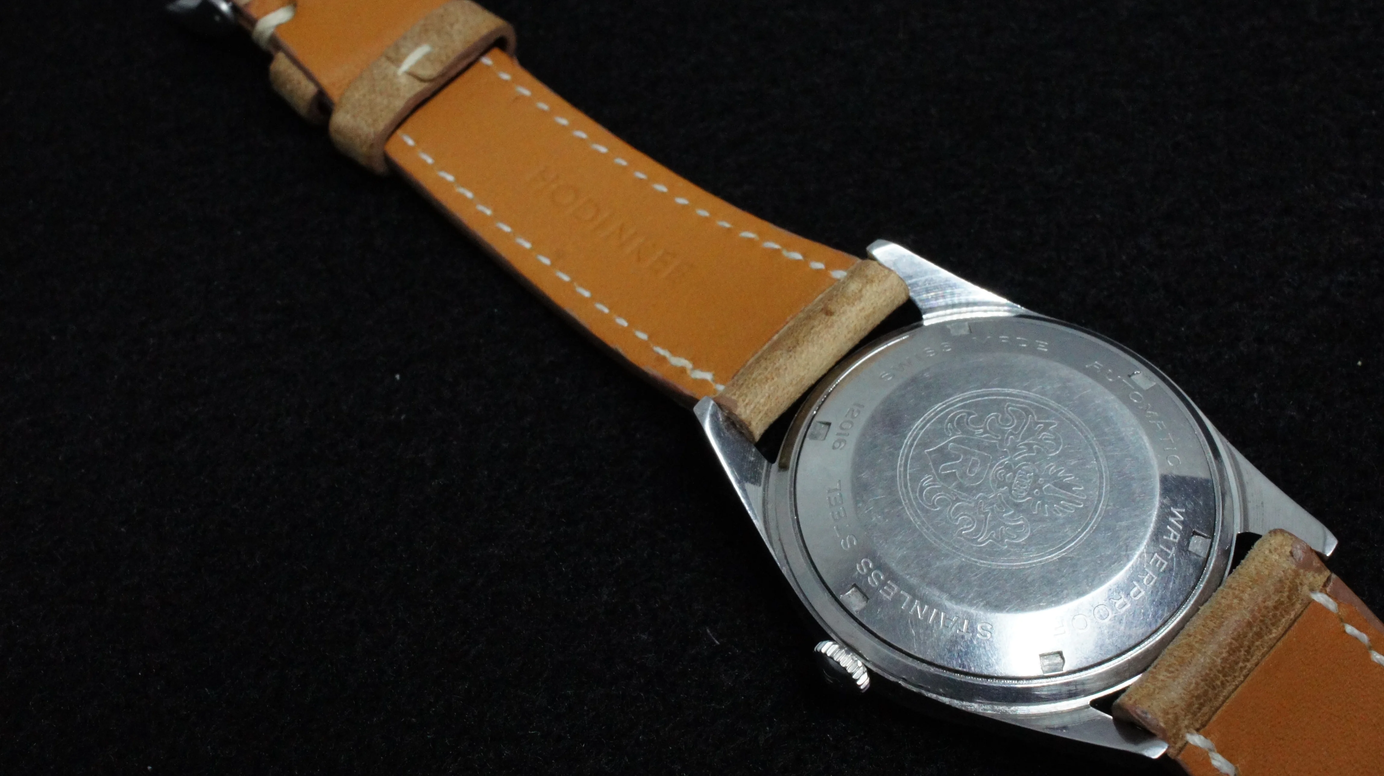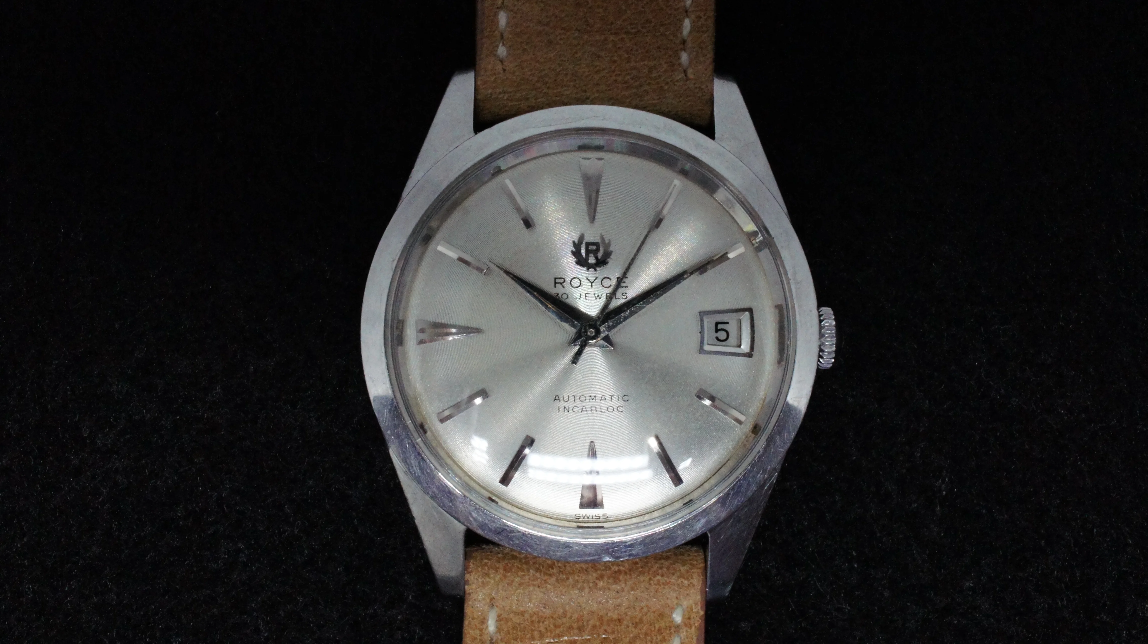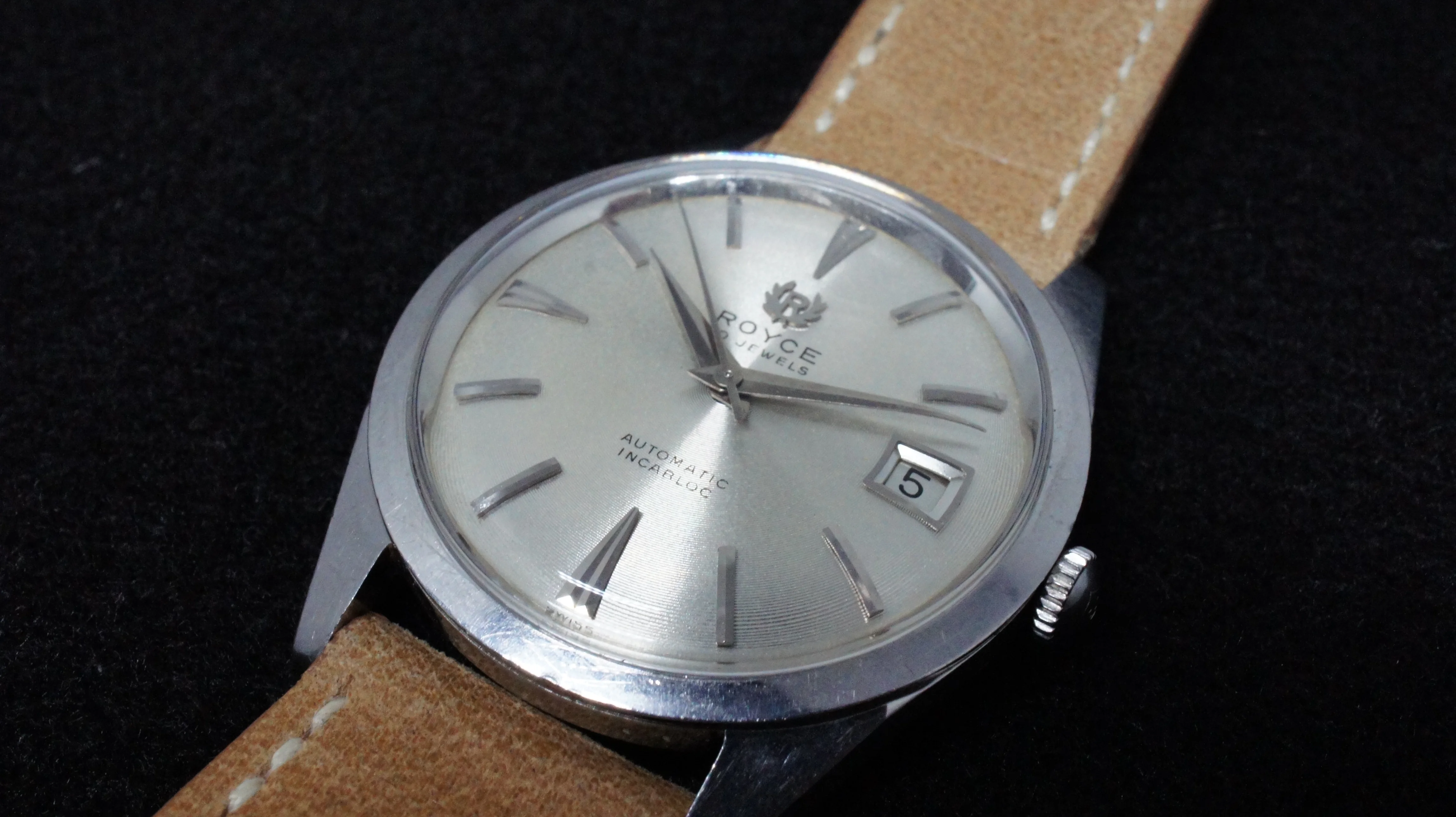 This is a vintage 1962 Royce, featuring a 30 jewel automatic movement and beefy all steel case, 36mm excluding crown. I had the watch serviced by a professional Swiss-trained watchmaker (details to buyer upon request) about a year ago and is in excellent working order. Dial has beautiful fine concentric rings, similar to a vinyl record. It comes on a new Hodinkee leather strap, regular length, in the correct 19mm width. Below is a 1962 Royce ad, featuring this model. Watch has a nice wrist presence. A classy piece. US$450, includes paypal/shipping USA/ Canada.
