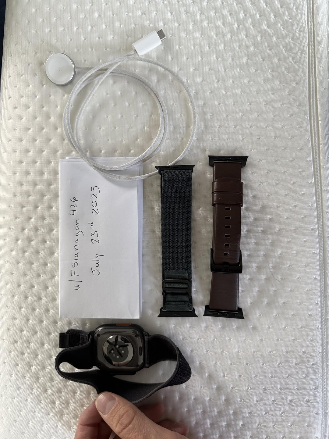 Apple Watch Ultra 2 for sale. For everything in the picture asking $800, via PayPal. Price includes shipping costs. The Alpine loop band and Trail band were both purchased from Apple directly ($99 per band). The leather band is from Nomad goods. Watch works perfectly fine, no issues or scratches. I am just trying to save for a Tudor Pelagos. Only thing I don’t have any more is the box for the watch. But if interested, send me a DM, and I can send you videos or additional pics of the watch and gear. Thank you.