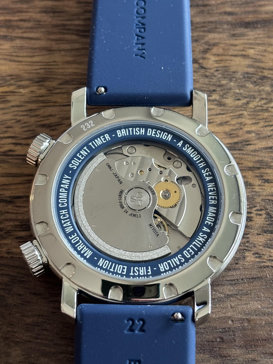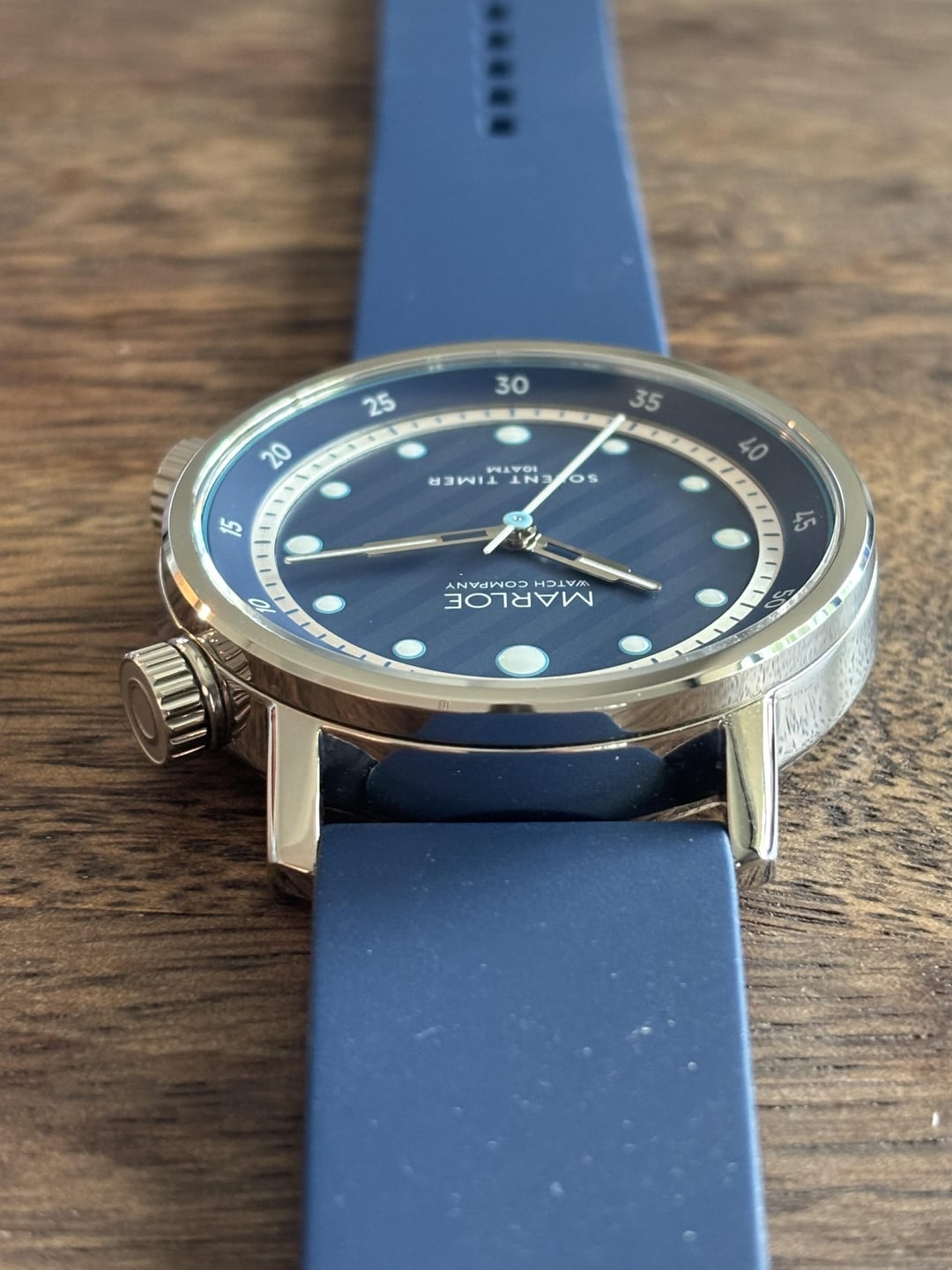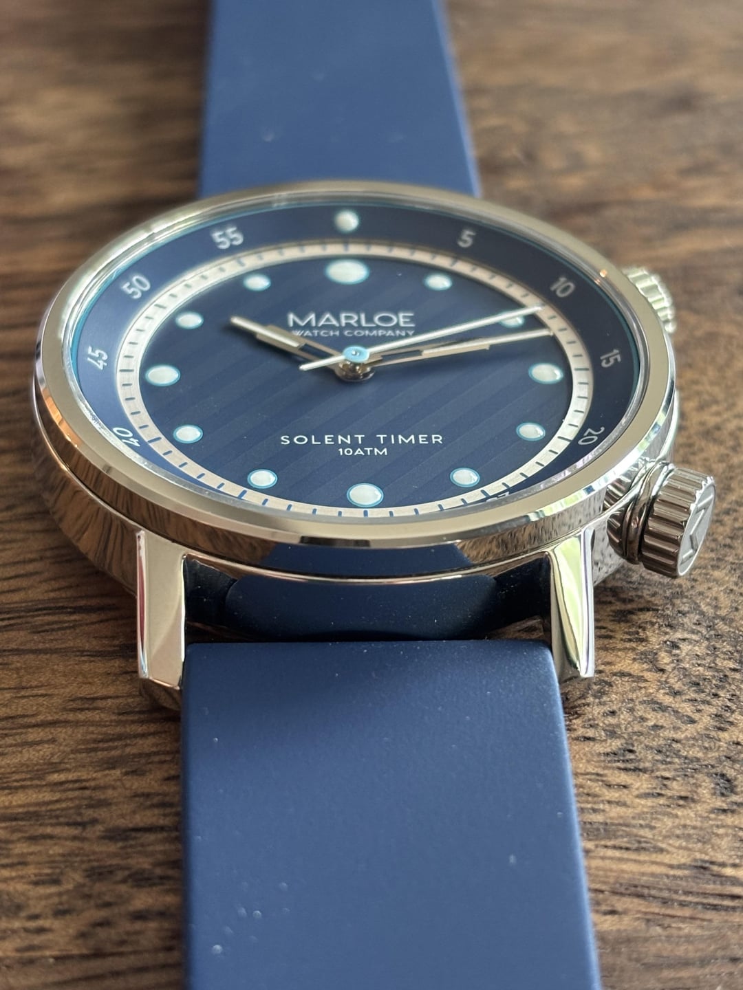 Happy Friday! Relisting a Marloe Solent Timer in the Oceanic colorway, with a reduced asking price. This interesting diver from the British microbrand has a striped dial pattern and unique lumed indices. The watch also includes an internal rotating bezel, with a screw down crown. As I've worn maybe a dozen times, I'd say the watch is in fantastic condition with no noticeable blemishes to my eye. Watch comes with full kit as shown in timestamp, including: OEM navy silicone strap, box, certificate of authenticity, and user manual. Additional info and a link to Marloe's site below (for reference): — Case Size: 42mm — Case Thickness: 12mm — Lug Width: 22mm — Crystal Material: Sapphire — Water Resistance: 100m, with screw down crown — Movement: Miyota 9039, behind a display caseback Timestamp: [https://www.flickr.com/photos/199566568@N08/54654453567/in/album-72177720326764981](https://www.flickr.com/photos/199566568@N08/54654453567/in/album-72177720326764981) [https://www.marloewatchcompany.com/products/solent-timer-oceanic](https://www.marloewatchcompany.com/products/solent-timer-oceanic) Asking **~~$270~~** **$245** shipped within the CONUS. Preferred payment methods are Venmo, Zelle, or Paypal F&F. Please feel free to reach out with any questions!