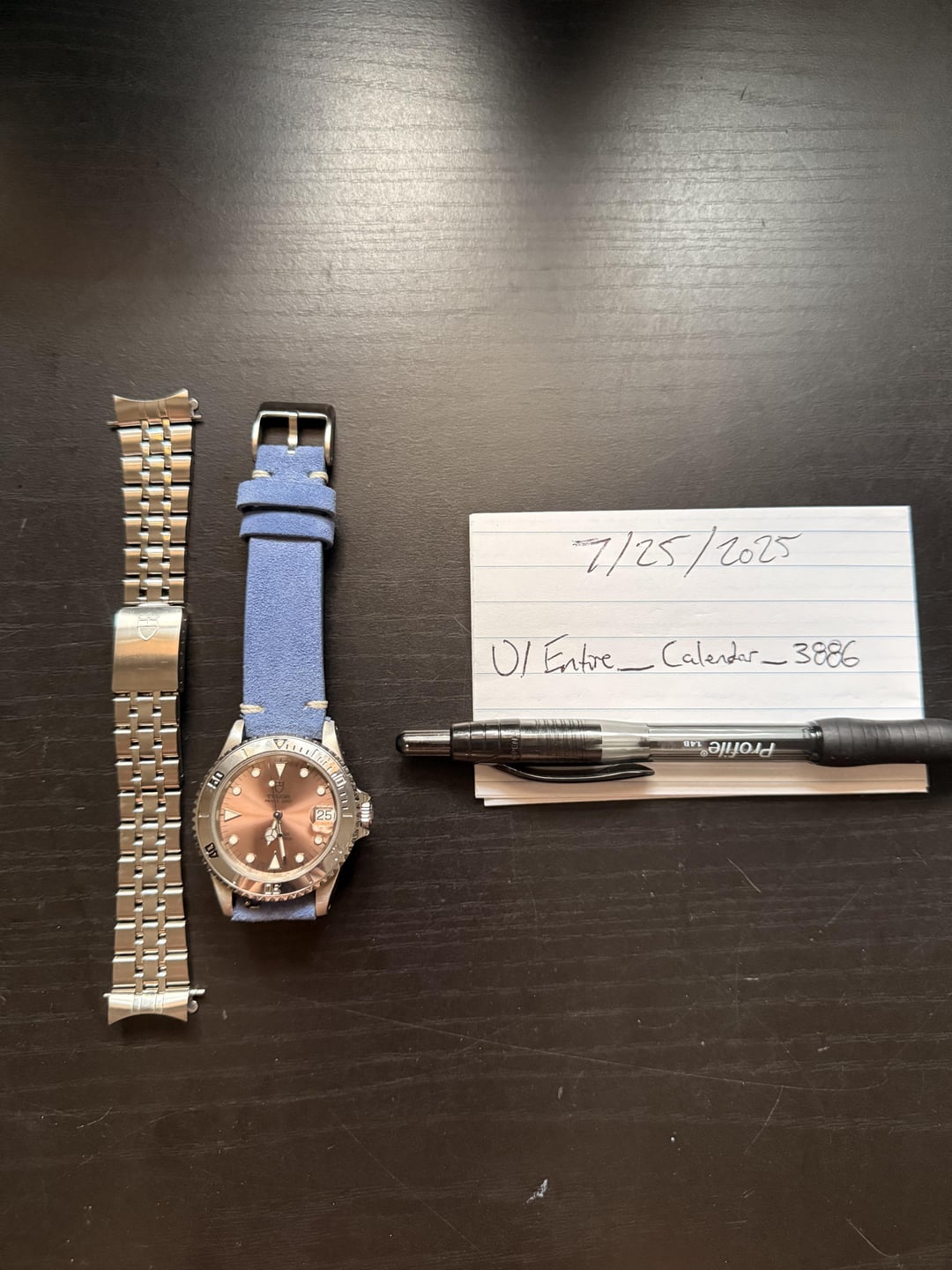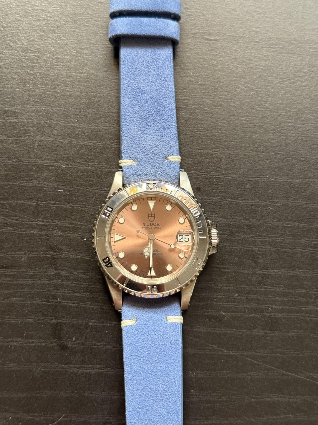 **AVAILABLE** **1997 Tudor Prince Date Submariner 75190, Salmon Dial** I absolutely love this watch, it's been recently serviced. It is currently on a light blue suede strap. It is a B serial so it was made between 1995-1997. Outside of the picture with the stainless steel band I have 2 more links for the watch. There are light scratches on the watch, to be expected with the nature of it being 30 years old. Outside of that it is in great shape, the band has no major scratches. What makes this so unique is it was made during a period when Tudor was still part sharing with Rolex. Which you can see in the crown, hands, and hour markers. I think it's such an interesting period in watch history. * **Condition:** Pre-Owned; what * **Includes:** Watch Only * **Reference Number:** 75190 * **Case:** 36mm Stainless Steel * **Dial:** Salmon Pink Dial with Lumed Dial * **Bracelet:** Light Blue Suede Strap, Fully-Linked Stainless Steel Band * **Movement:** ETA 2824-2/Automatic **Price:** $3,950 USD **Location:** Maryland/DMV Area **Shipping:** Fully insured As this is my first post I am absolutely happy to get on a FaceTime to talk more about the watch and ensure that you feel comfortable purchasing from me. Thanks for your interest, DM for questions or additional photos!