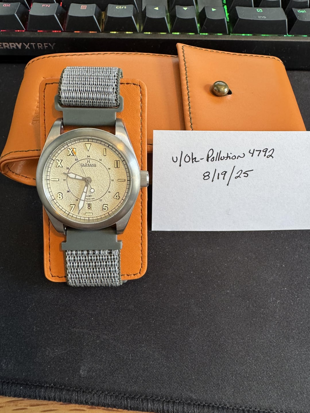 Hello WatchEx, Selling my Dufrane Mabry. It is a great-looking field watch from an excellent boutique watchmaker. The quality for the spend is truly amazing. Comes on a comfortable sailcloth strap. Original straps, papers included. **$375 shipped CONUS**. Not looking for trades, thanks. PayPal F&F or G&S +3% If you have any questions or concerns please feel free to DM me. This is a beautiful watch, it just isn’t getting the wrist time that it deserves. So I figured I would let it go. Bought on WatchEx a few months ago. Here’s the specs: * 39mm case * 47mm lug to lug * 10.4mm thin * 20mm strap width * Swiss Sellita SW200-1 Auto