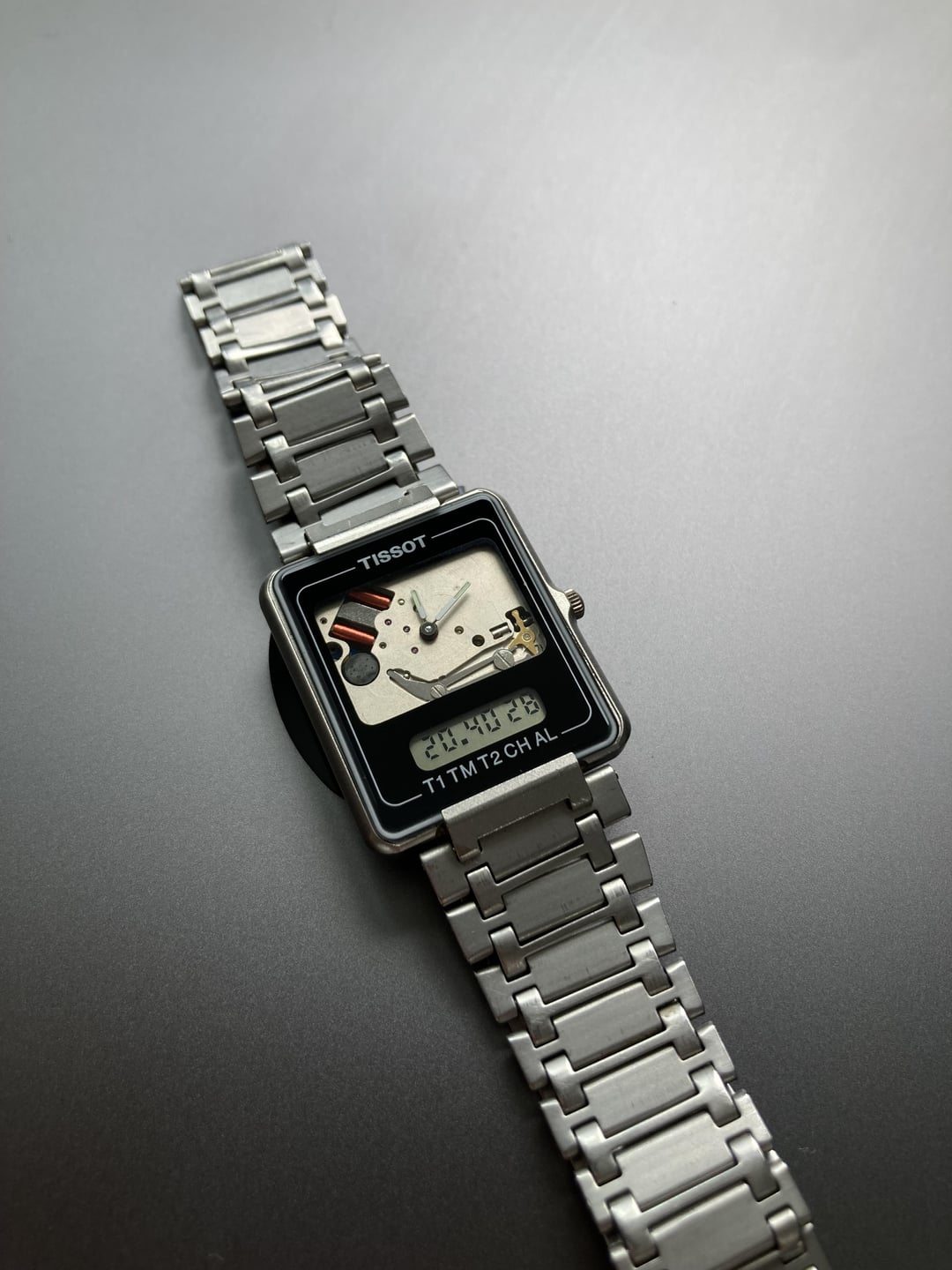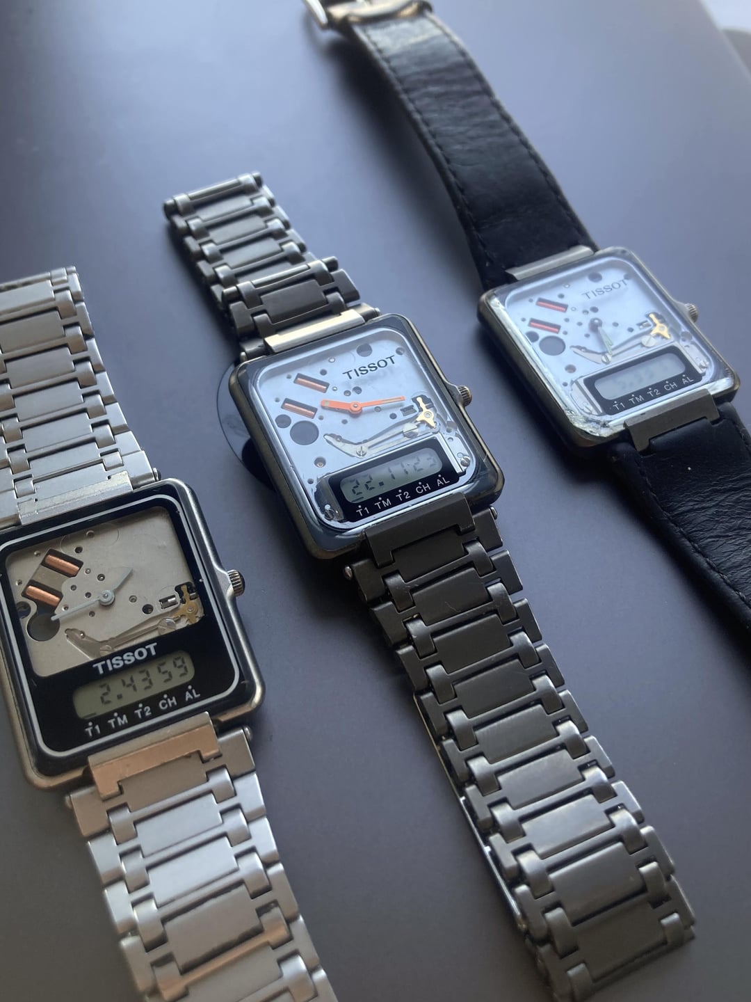 Selling these beautiful late 19980s or early 1990s Vintage Tissot Two Timers. **All watches are in fully functional condition and prices are slightly negotiable and net to me. All watches are true vintage with ranging levels of condition.** FULL ALBUM AND TIMESTAMP: [https://imgur.com/a/7ZhECtm](https://imgur.com/a/7ZhECtm) Worldwide shipping available at buyers cost. Payment via Wire, Wise or PayPal G&S (+fees) for established users. \#1 Silver Two Timer Skeleton with a Tissot printed crystal, a silver metal bracelet and white hands. Asking: 260€ \#2 Gunmetal Two Timer Skeleton with a Tissot printed ghost crystal, a gunmetal bracelet and signal orange hands. Asking: 280€ \#3 Silver Two Timer Skeleton with a Tissot printed ghost crystal, a black leather strap and grey and white hands. Chip on the bottom left corner, but still sealed and usable. Asking: 190€ \#4 Silver Two Timer Skeleton with a Tissot printed crystal, a silver metal bracelet and grey and white hands. Asking: 260€ \#5 Silver Two Timer Skeleton with a Tissot printed crystal, a black leather strap and signal orange hands. Asking: 230€ \#6 Gold Two Timer Skeleton with a Tissot printed crystal, a gold rubber strap and gold hands. Strap is a bot stiff due to age. Asking: 230€ \#8 Gunmetal Two Timer Skeleton with a Tissot printed crystal, a black leather strap and black and grey hands. Asking: 220€ \#9 Gold Two Timer Skeleton with a Tissot printed crystal, a black leather strap and black hands. Asking: 230€ \#10 Shiny Gunmetal Two Timer Skeleton with a Tissot printed crystal, a grey leather strap and black and grey hands. Asking: 220€ \#10 Gunmetal Two Timer with a Tissot printed crystal, a black dial with red Tissot printing, a black rubber strap and black hands. Asking: 220€ \#11 Grey Two Timer with a printed crystal, a creme dial, a black rubber strap and silver hands. Asking: 130€ \#12 Black Two Timer with a printed crystal, a yellow tapisserie dial, a black leather strap and black hands. Asking: 90€