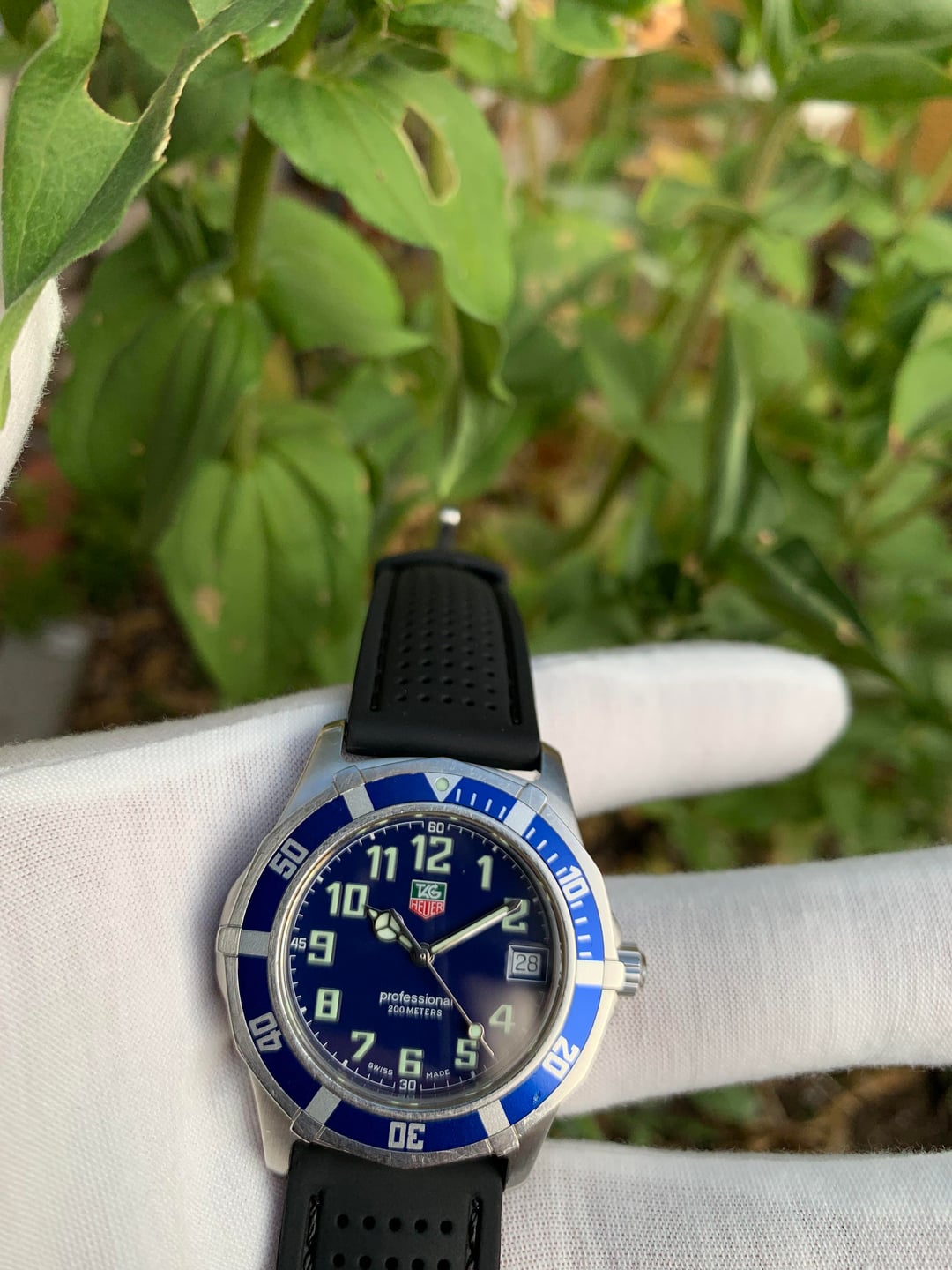 For sale is a TAG Heuer WM1113 Professional 200m. It’s a fun piece from the 2000 series era that doesn’t look like your typical TAG diver. The full Arabic numeral dial gives it more of a field-watch feel while still keeping the dive functionality. Between the blue bezel, slim case, and strong lume, it’s an easy GADA watch. Details: • Reference: WM1113 • Case size: ~38mm • Lug width: 20mm • Dial: Blue with luminous Arabic numerals, date at 3 o’clock • Bezel: Blue unidirectional diver’s bezel • Crystal: Sapphire • Crown: Signed screw-down • Strap: Aftermarket perforated black rubber (comfortable and fits the style well) Condition: • Case in good shape with light wear consistent with use • Bezel retains good color, rotates correctly, with nice tactile clicks • Crystal is clean • Lume is strong and evenly applied (see last pic) What’s included: Watch only, on aftermarket strap (no box/papers). Price: $400 shipped CONUS (insured USPS Priority) • Payment: Zelle, Venmo, or PayPal F&F • FaceTime available for serious buyers References: Plenty of feedback here, r/pmsfeedback and on Whatnot under levydeals (4,000+ 5⭐ sales).