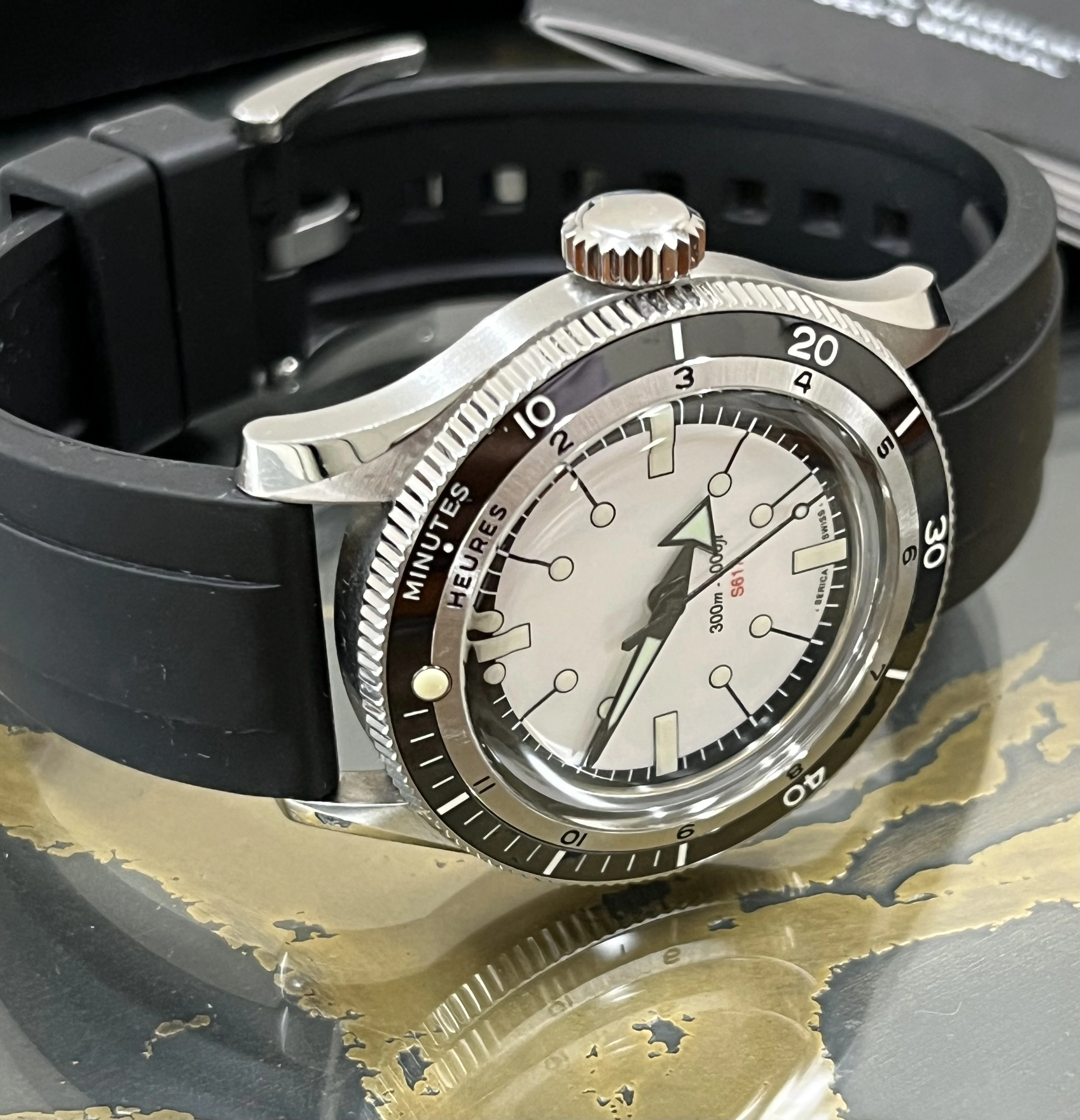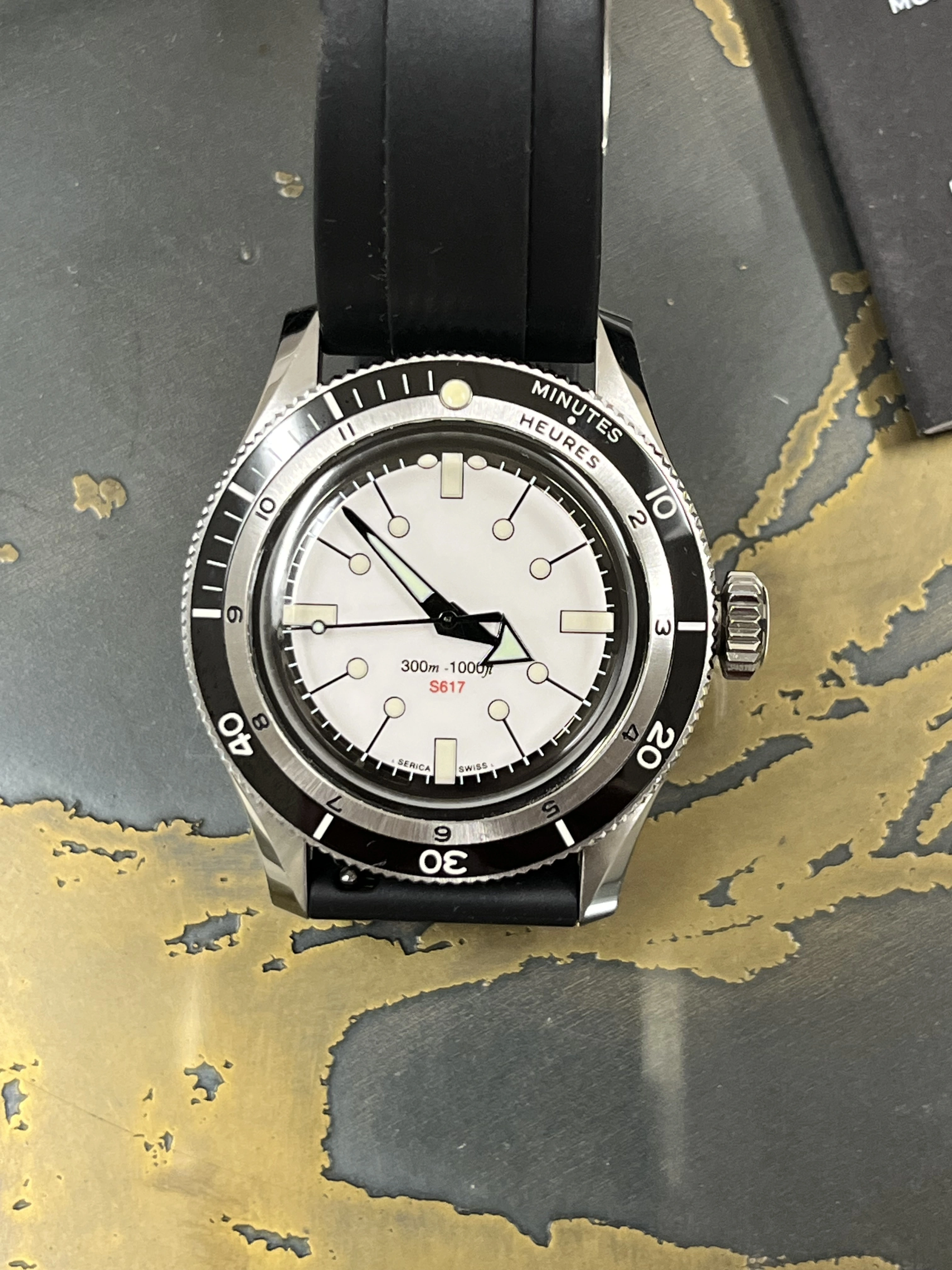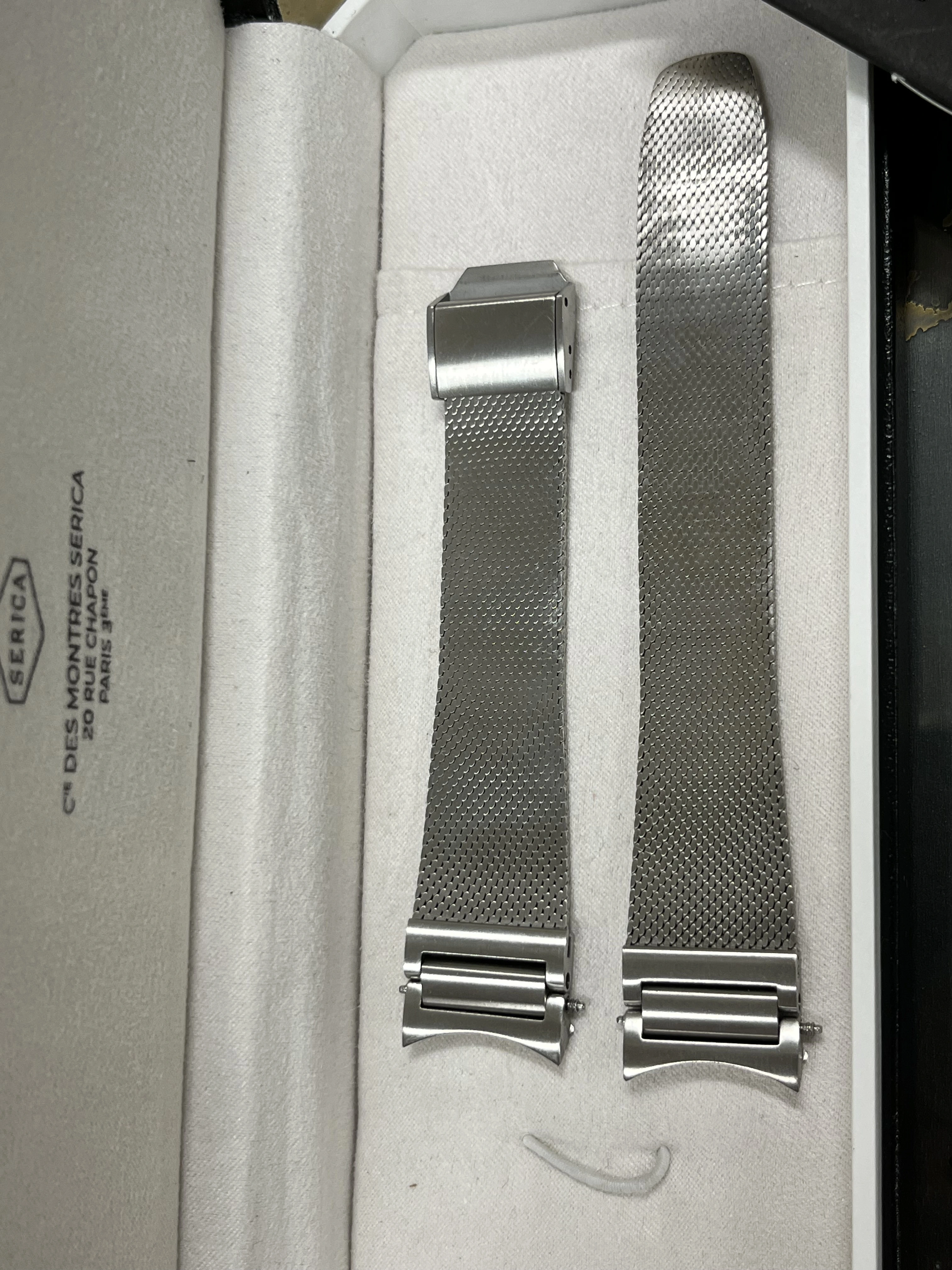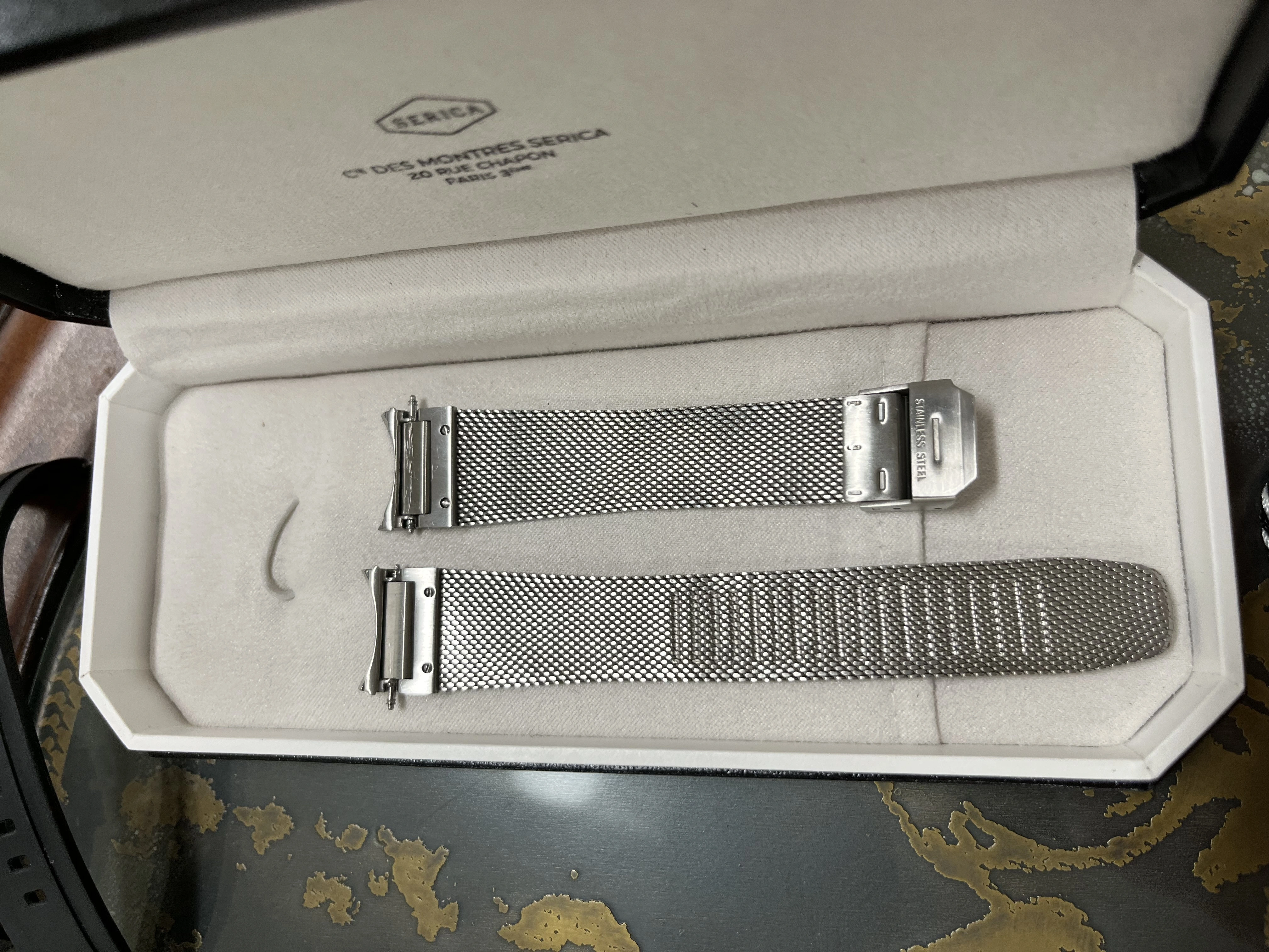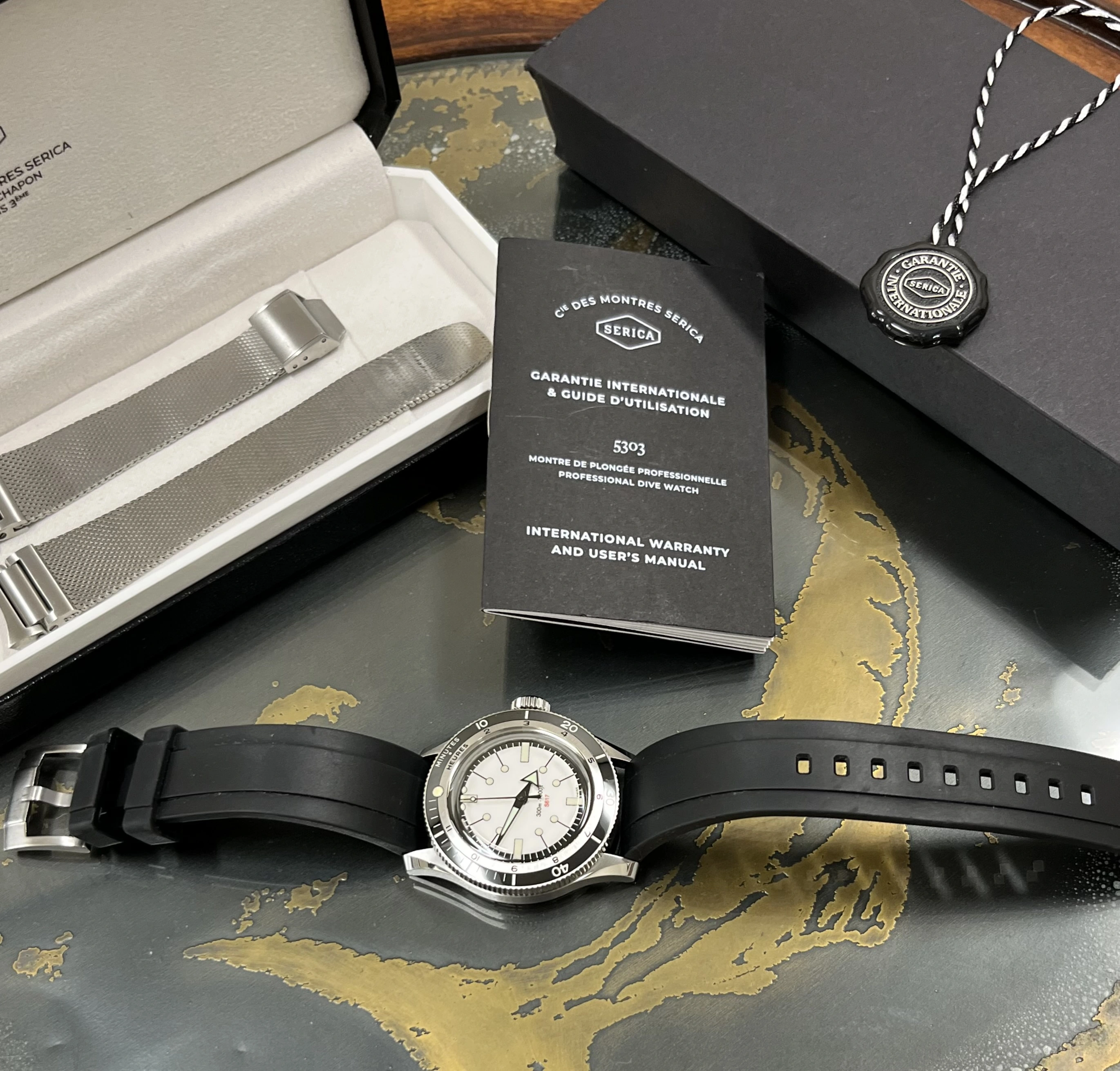 Hello up for sale is my early execution Serica 5303-2 39mm. This is a full set; Included in the sale is outer box, presentation box, warranty booklet, hang tag, original stainless mesh bracelet (20mm lugs), and aftermarket black rubber strap.
