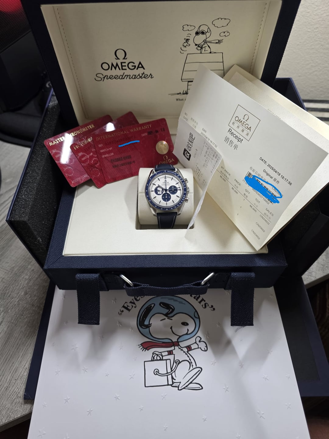 **Omega Speedmaster “Silver Snoopy Award”** **Ref: 310.32.42.50.02.001** This 2025 Silver Snoopy is in excellent condition with minimal to no visible signs of wear. Professional aftermarket stickers are applied to the case for protection. The watch will come complete with: * Outer and inner boxes * Travel case * Special Snoopy mission book * Original purchase receipt * 3 pictogram cards * Dated and stamped warranty card (4/18/2025) **Note:** Red Omega manual book is missing. Price = $14,400 shipped FIRM Pics & Timestamp = [https://imgur.com/a/BsQw04O](https://imgur.com/a/BsQw04O) IG = watchfornia Cheers, Adam