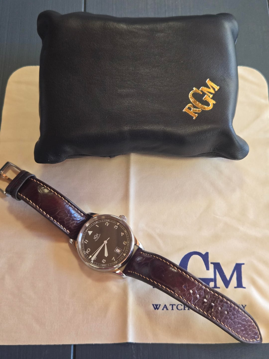 For sale RGM 151-P The 151 models have an American-made case in either stainless steel or titanium. Any stainless steel version can be polished, brushed, or a combination of both finishes. Titanium cases have a brushed finish only. The thin bezel and large dial are a hallmark of the 151 models; in fact, the dial is larger than watches of a much greater size. The case is thin for its diameter and curves comfortably to the wrist. Movement Caliber: RGM- Sellita SW300-1 - Swiss-made automatic, 25 jewels, 28,800 vph. Rhodium finish - Côte de Geneve lines and perlage. 52 to 56-hour power reserve. Functions: Hour / Minute / Second / Date on some models Case: American Made 316L Stainless Steel or CP-2 Titanium, 38.5 mm x 9.9 mm. Sapphire crystal front and back, 20mm lug width, and water-resistant to 5-ATM. Case length from lug end to lug end: 48mm This is the steel version, black dial with date window. Piece is in amazing shape with only light signs of wear. Comes on a dark brown ostrich leg strap. Watch comes with RGM branded cleaning cloth and watch pillow. No box, no papers. I am asking 2200.00 OBO, no trades , shipping to US only. Payment via PayPal or Venmo. I have a few transactions here but most are on eBay under gilnh2o. I am open to FaceTime or provide other pics upon request.