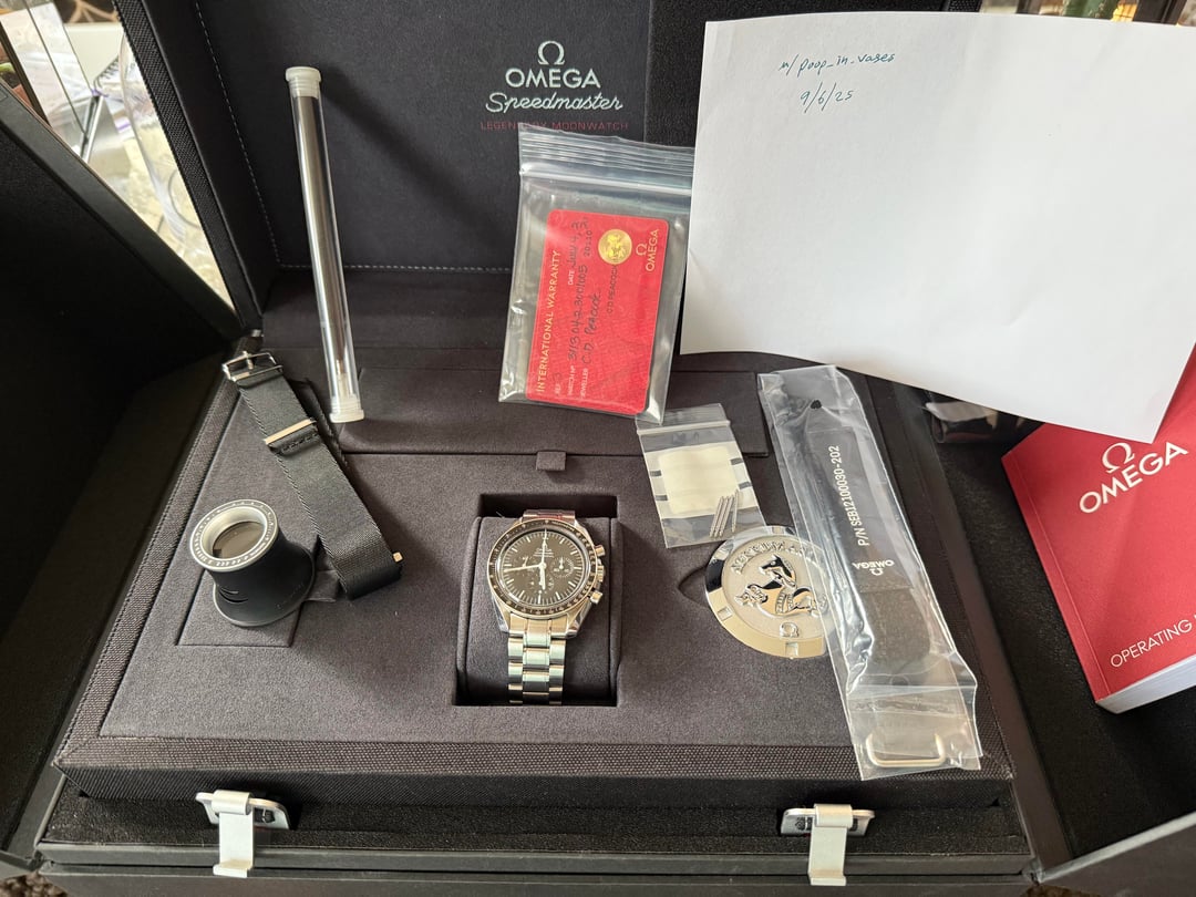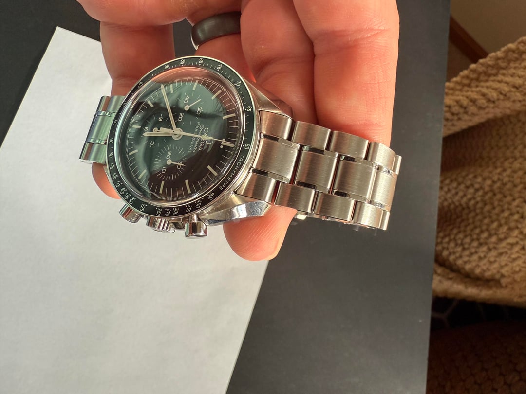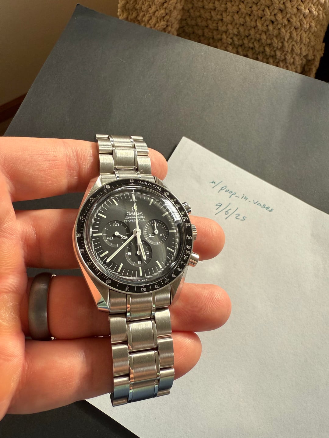 **Overview:** I have for sale my Omega Speedmaster Professional with the hesalite crystal. This was my first luxury watch purchase. I bought this on July 4th, 2020 from an AD, so it’s the one generation older discontinued model. It’s one of my favorite watches in my collection (I mean, it’s a speedy!). However, I’ve kept thinking about selling this in order to be able to try out some other watches I’m interested in (I actually already purchased another watch!). So as a result, this is going up for sale. **Condition:** The watch and bracelet are in good condition. There are some scratches behind the lugs where the spring bars slide when installing straps during strap changes (I mostly wore this on a NATO strap). Also, there are minor scratches kind of all around due to three and a half years of wear, but no major dings or anything like that. Please see the pictures in the album. The watch is currently running without issue within spec (at about +7 spd when I checked last). **Specs:** Model: 311.30.42.30.01.005 Movement: 1861 (manual wind) Crystal: Hesalite crystal Case Diameter: 42mm Lug Width: 20mm **What You Get:** Watch Original bracelet with all links Warranty card (dated 7/4/2020) Original big box and everything that came with the watch: Booklets 4 extra spring bars Omega NATO strap Omega velcro strap Omega spring bar tool Omega loupe Seahorse Medallion **Price:** $4700 shipped CONUS, PayPal G&S I am located in northern Illinois, so could be open for a face-to-face sale within an hour’s drive. **My Credibility:** I have sold and traded a few watches on this subreddit before with no issue. Also, before I got into watches I was really into fountain pens. Back then, I sold/traded fountain pens on [r/pen\_swap](/r/pen_swap/) as well with no issue. Do not hesitate to reach out with any further questions, comments, or concerns via chat/PM on here!