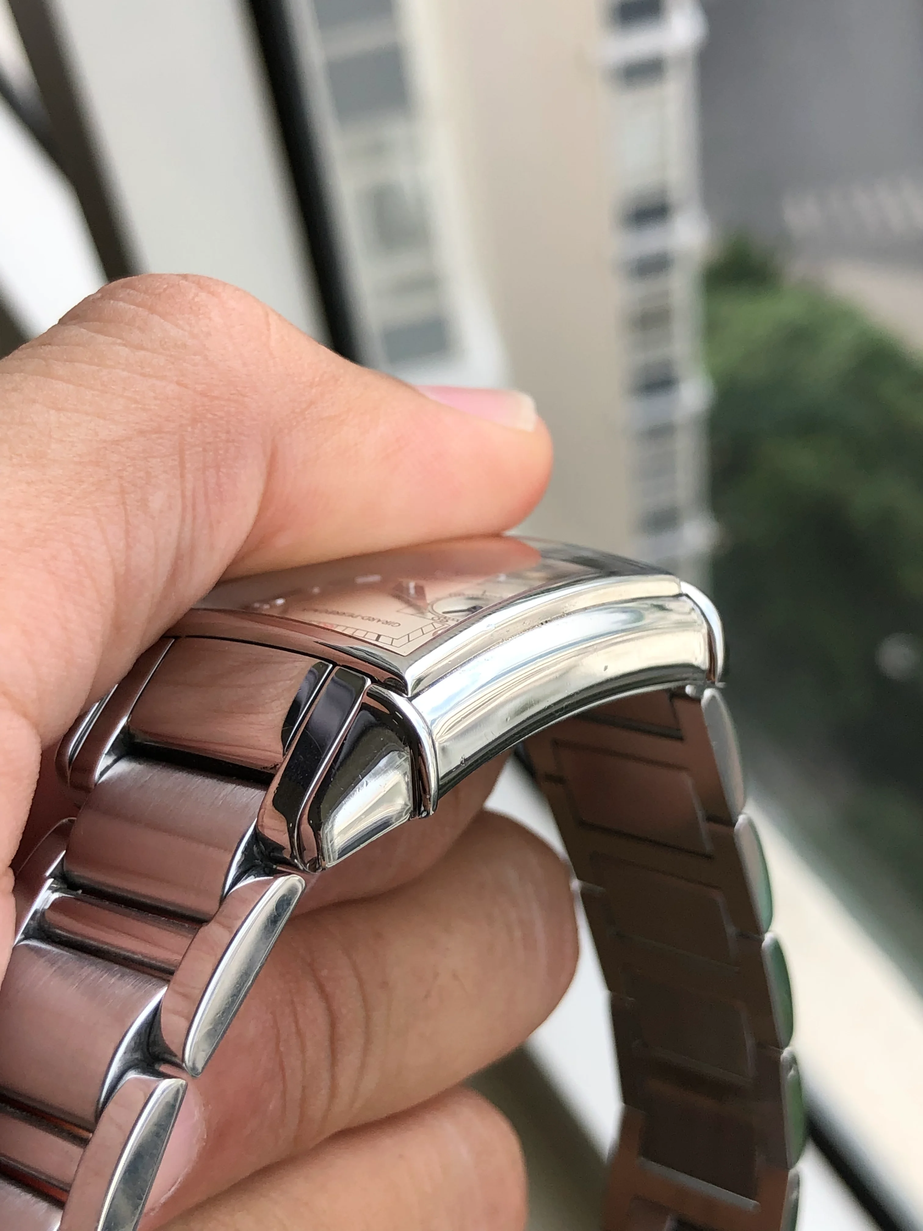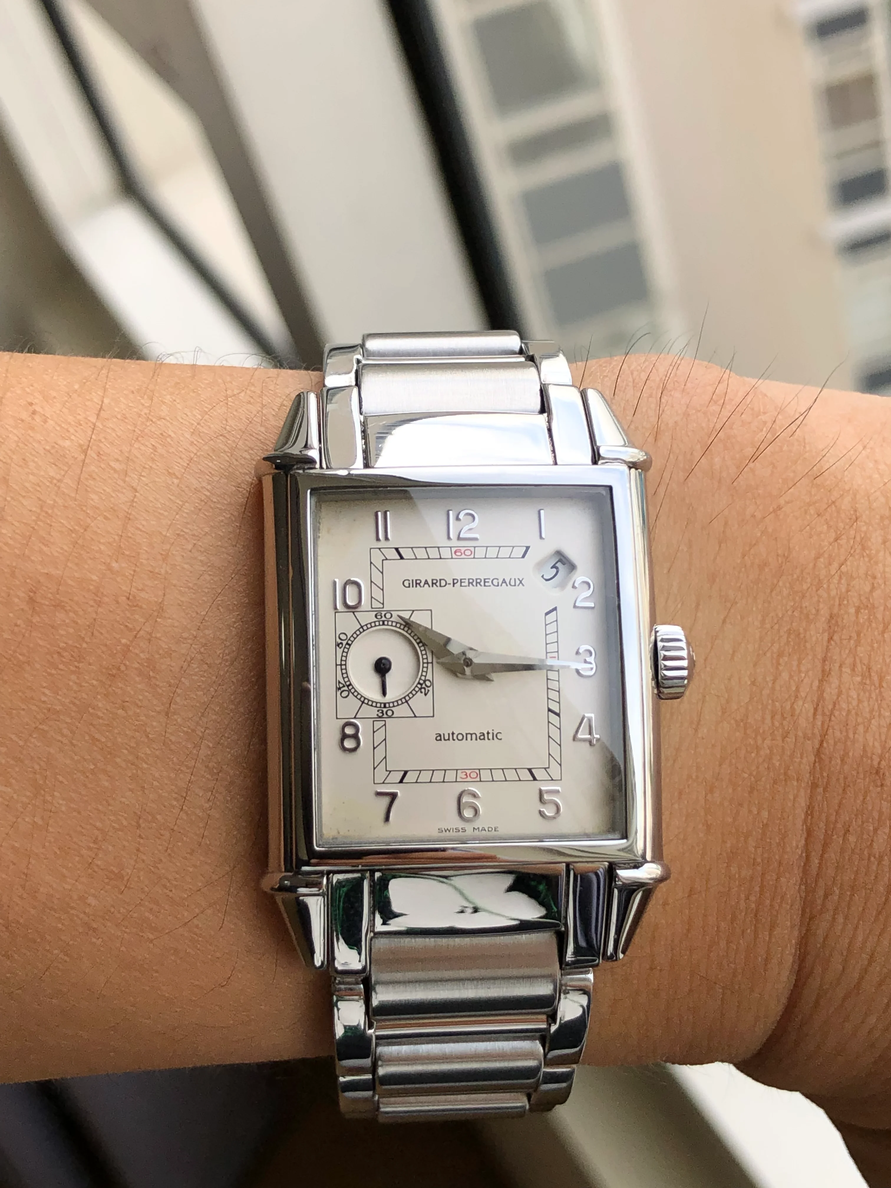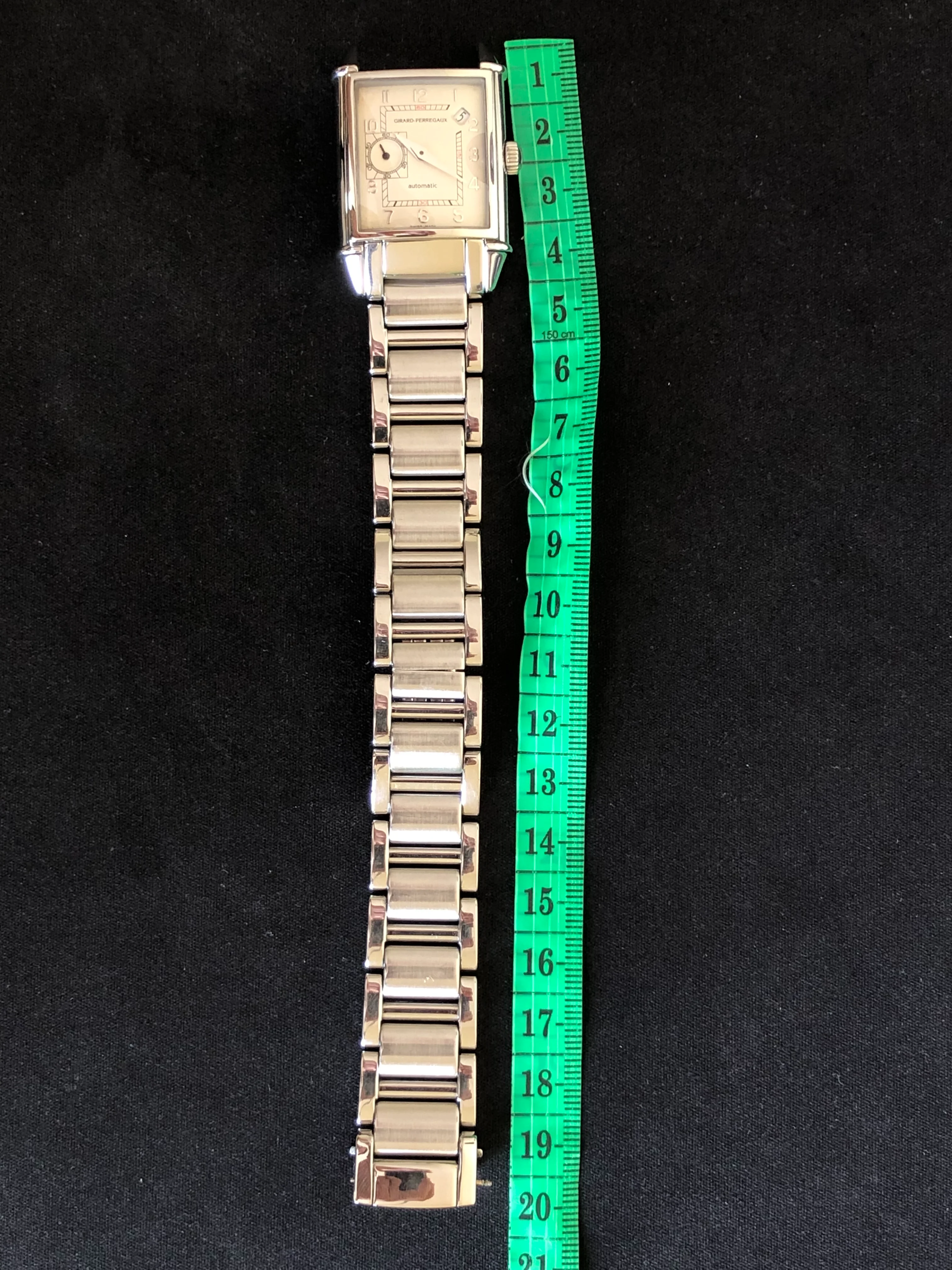 A stainless steel Girard Perregaux 1945, ivory rectangular dial, curved case, date, small second, original bracelet, handmade leather strap, serviced, shipping fee with insurance in EU/US included.