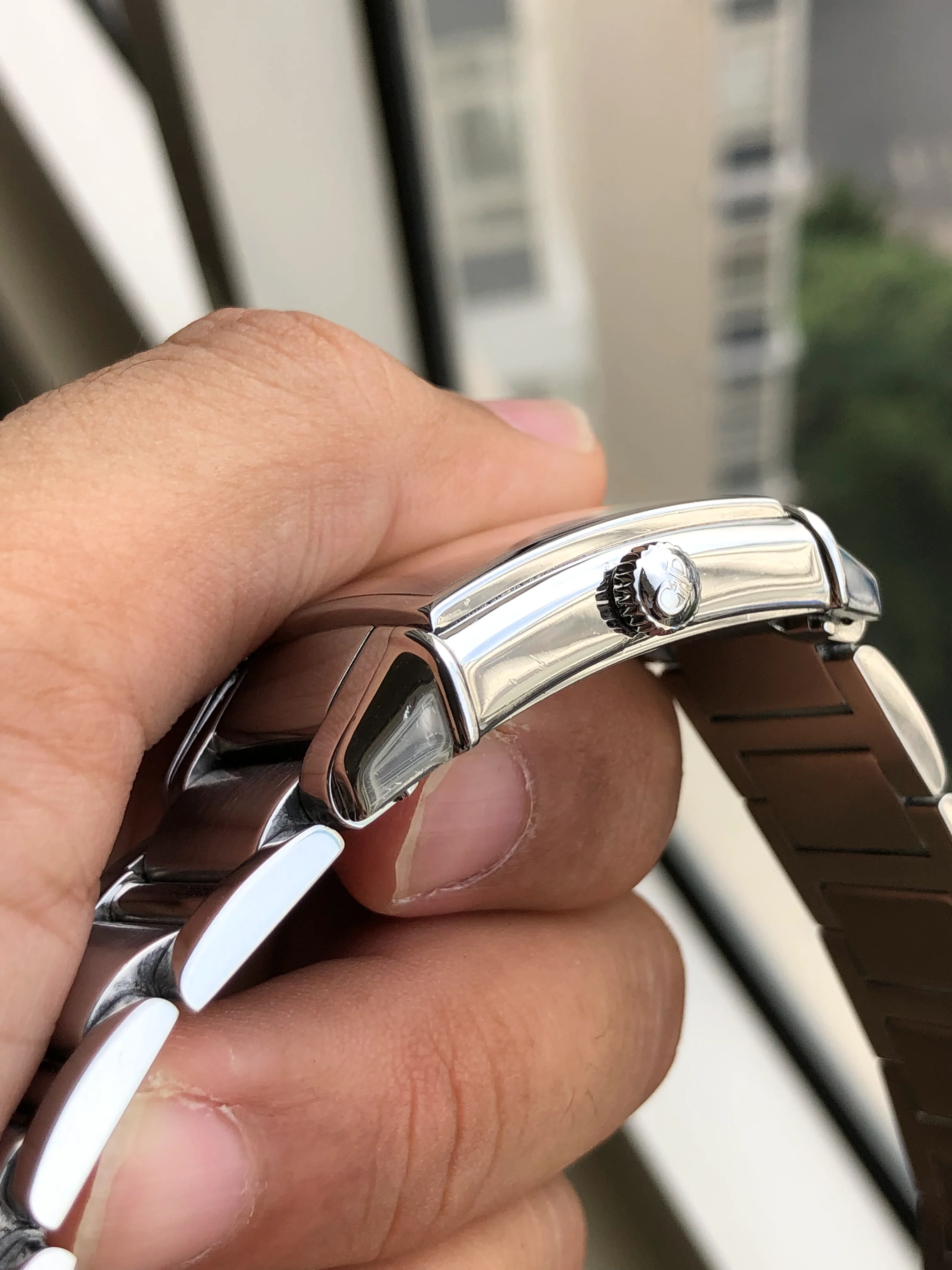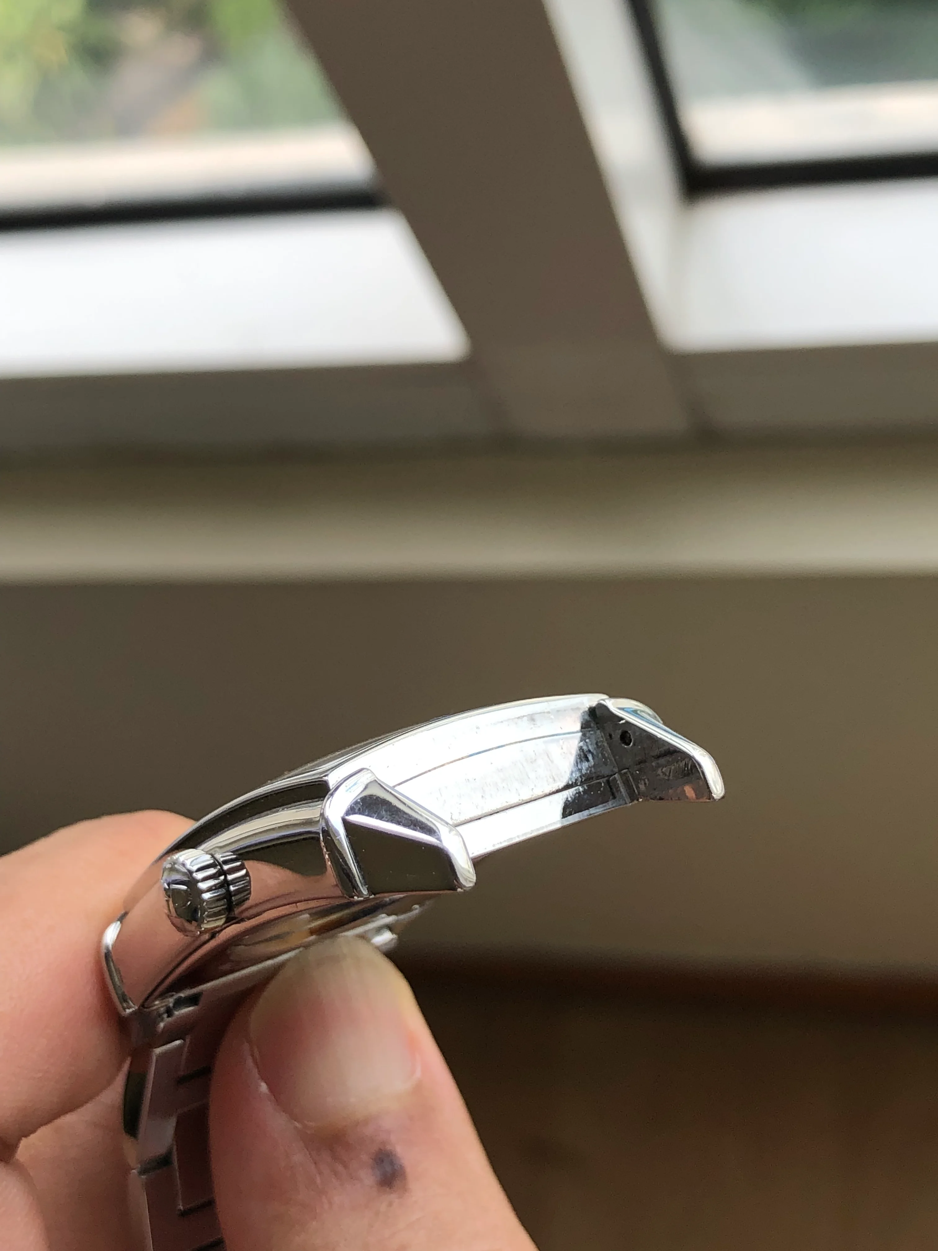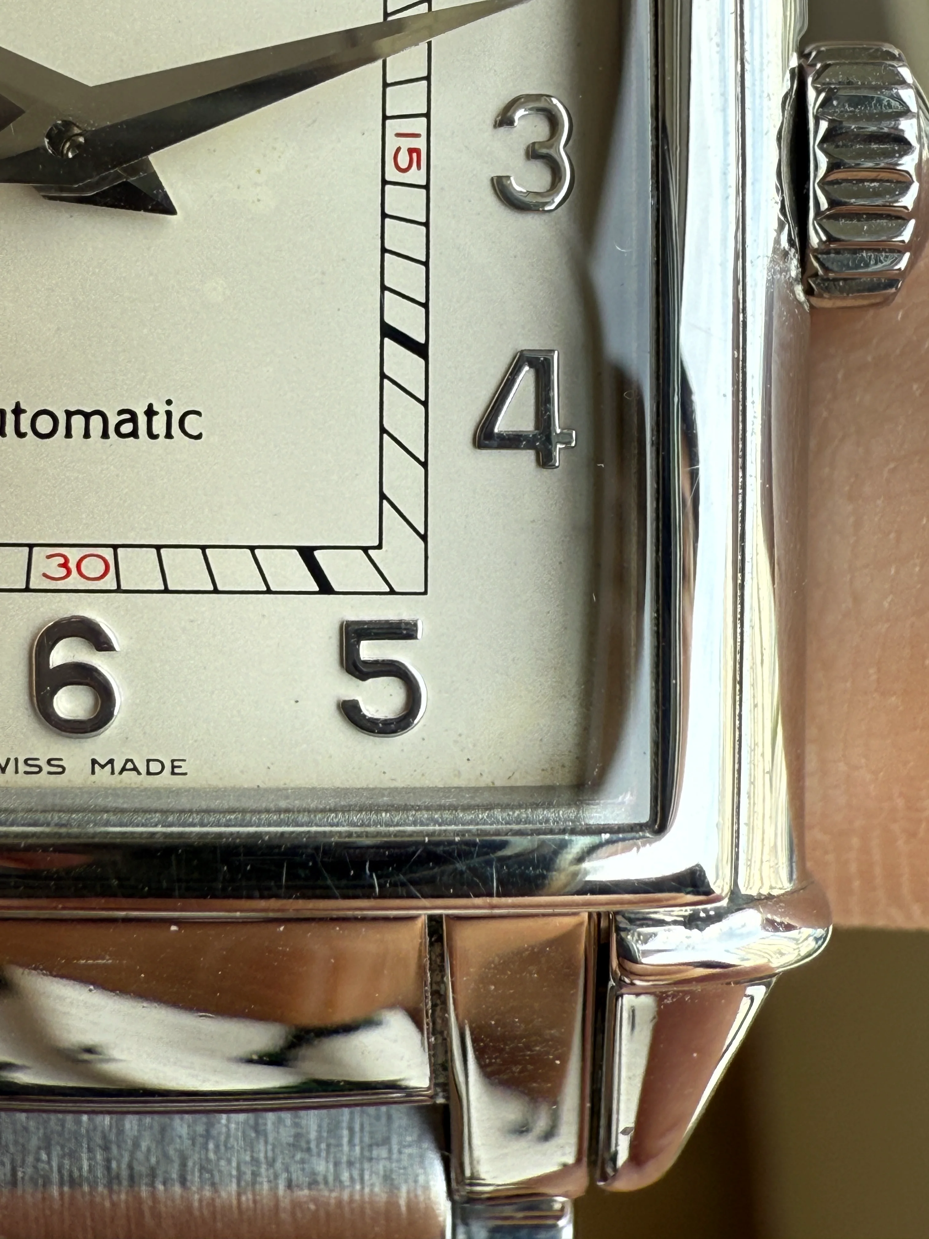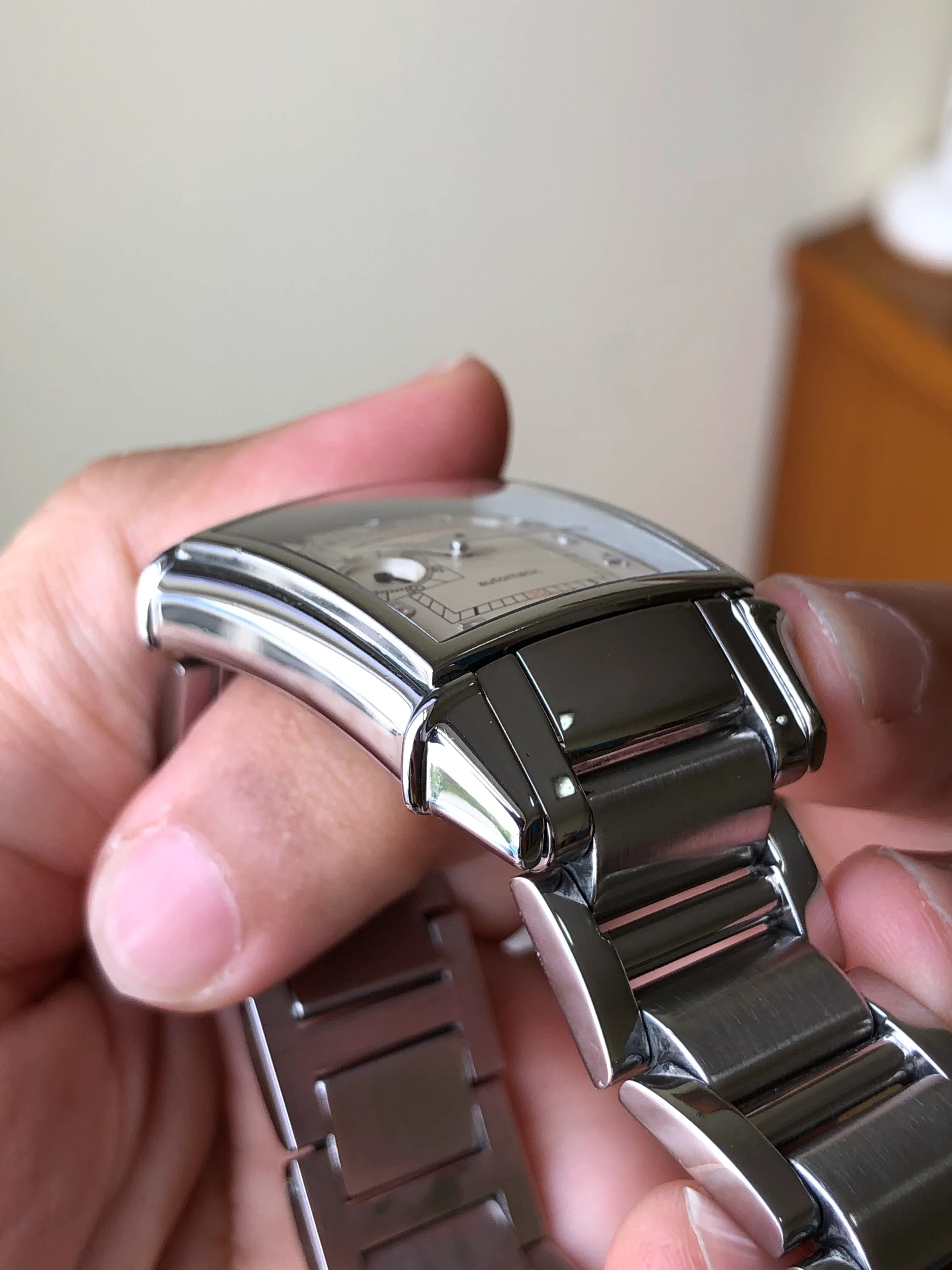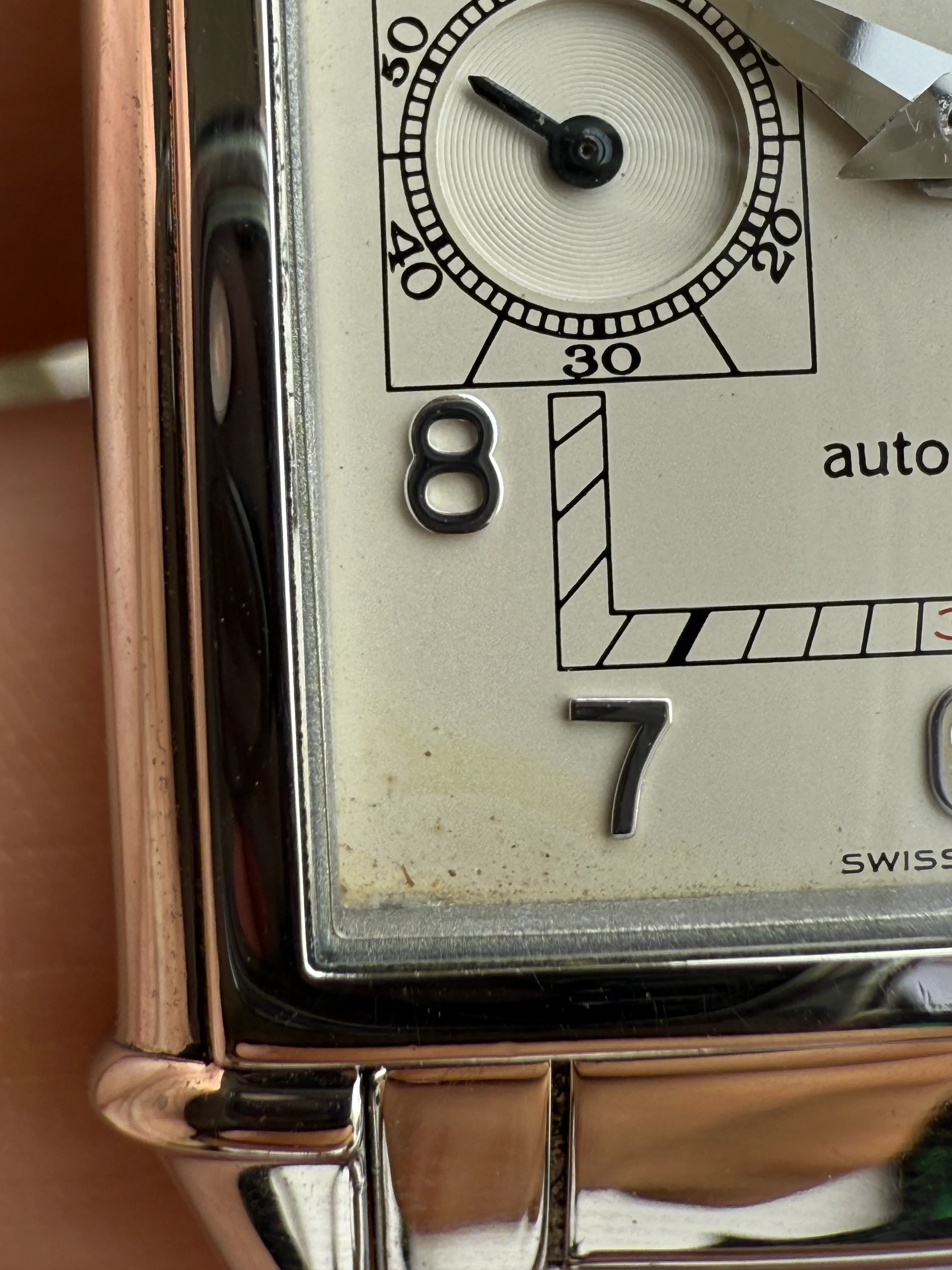 - Dial: Original ivory rectangular dial with applied arabic hour markers; date-aperture frame at 1; small second at 9; dauphine hands; prints, hands and hour markers are all good. The dial has signs of moisture, mostly at 4 corners as shown in photos.