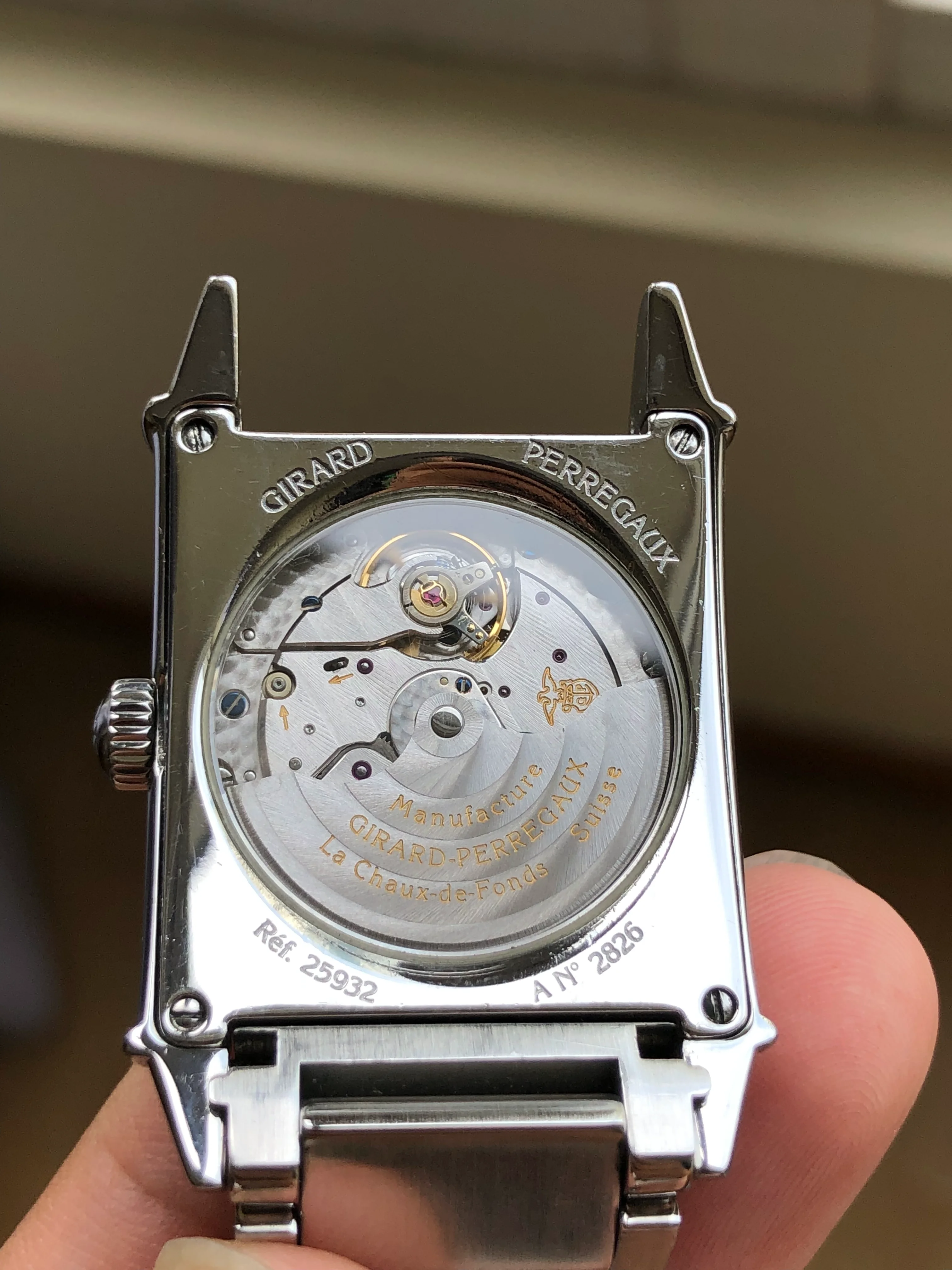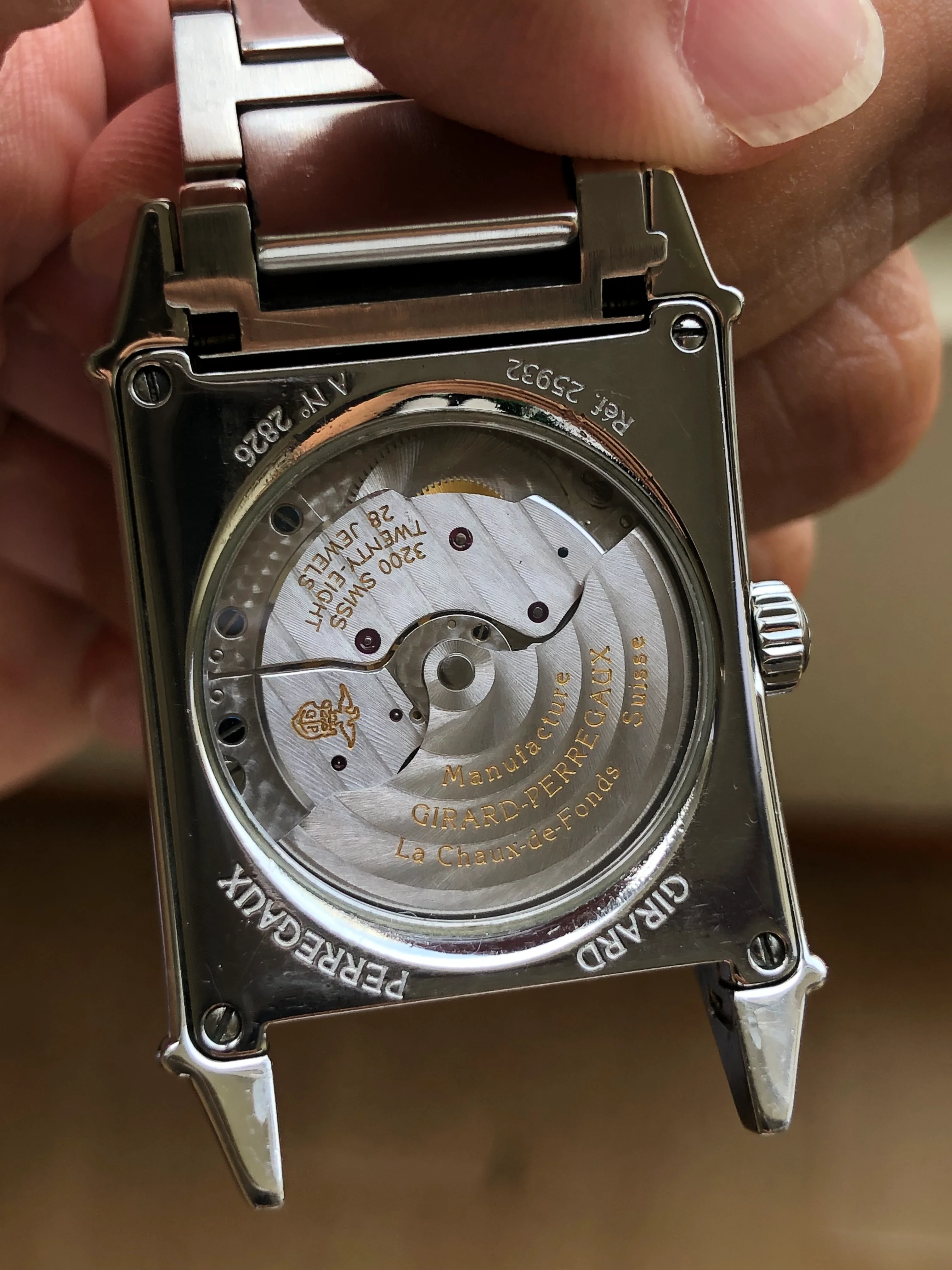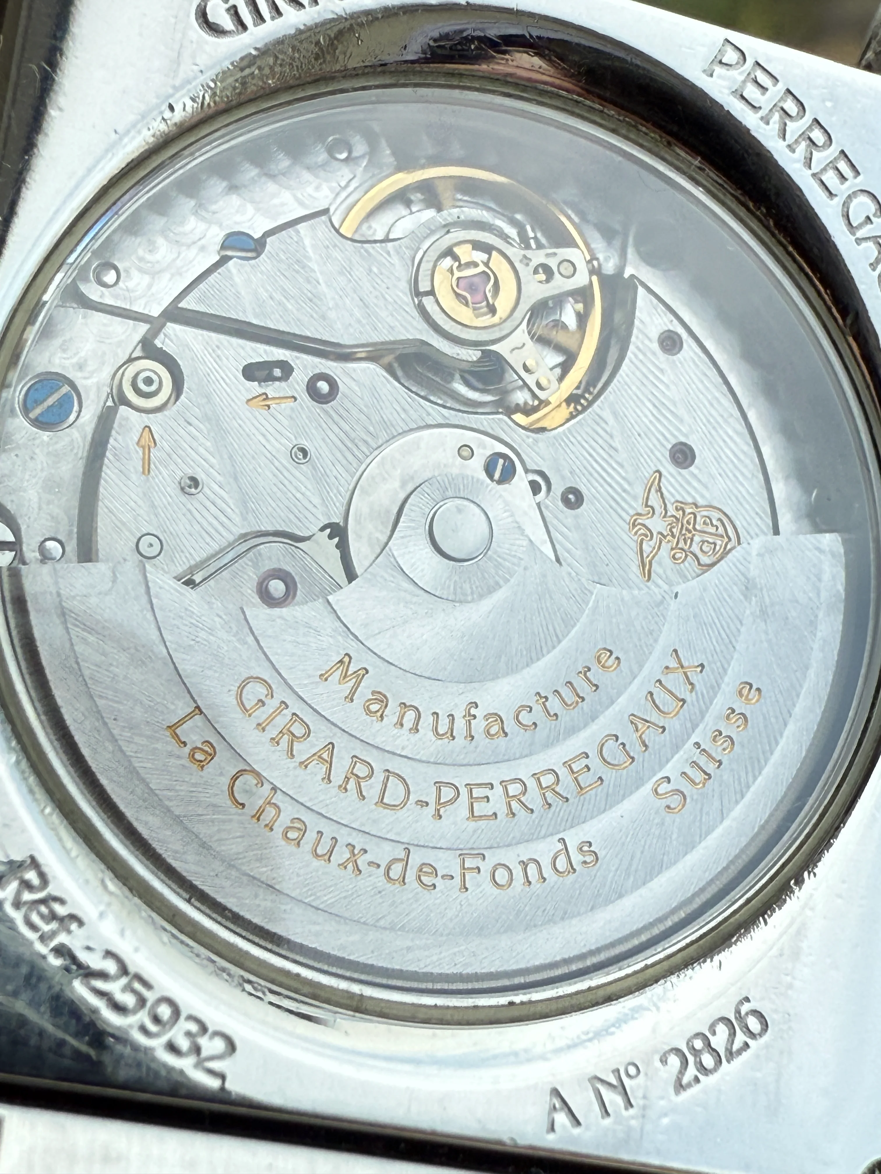 - Case: The diameter is 28x44mm without the crown. The case is curved and fits nicely on the wrist. Original case is in very good condition. Original GP crown. The case back has saphire glass; the reference 25932 and A No.2826 can be seen there.