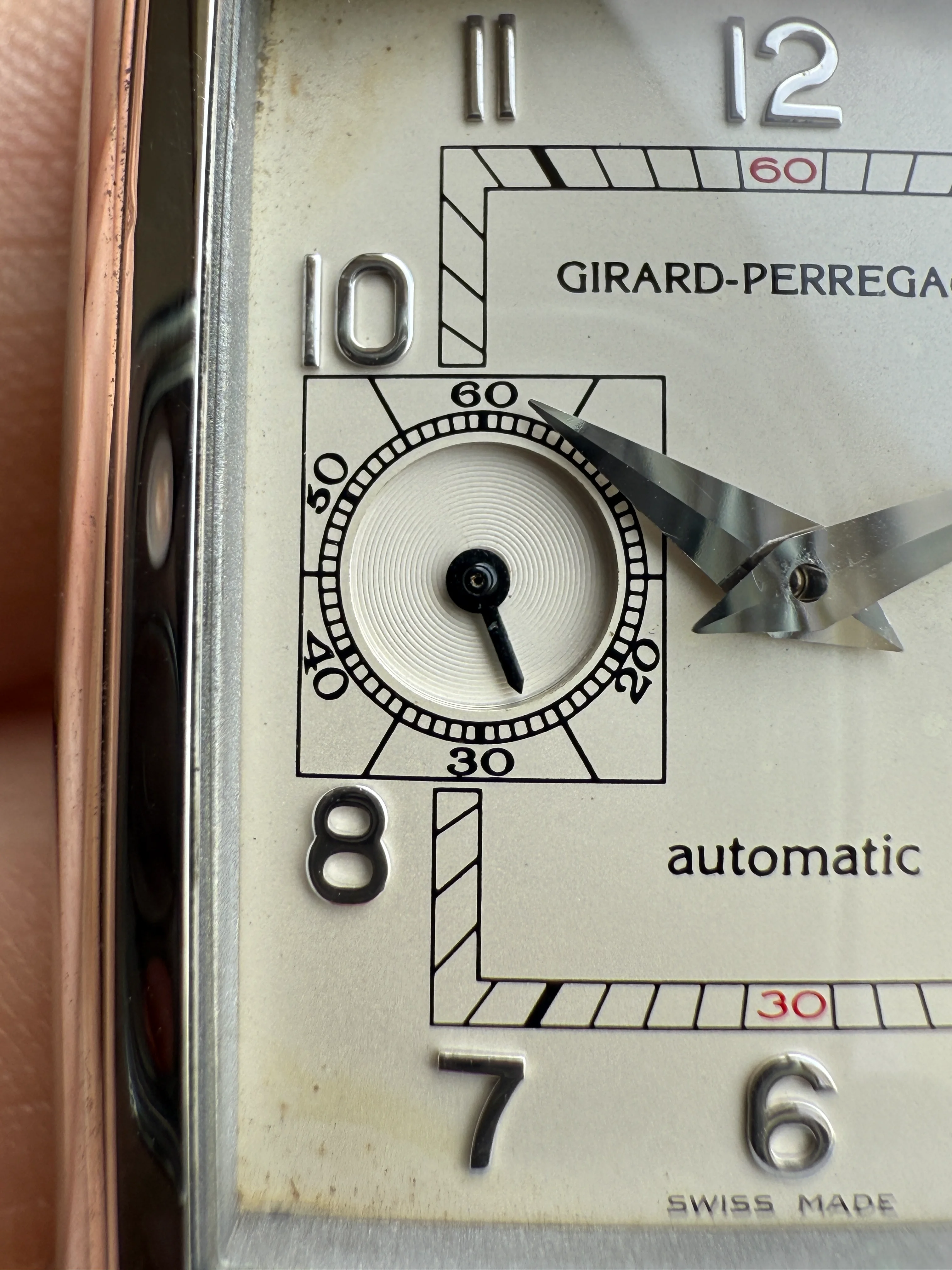 (Price reduced) Girard Perregaux 1945, tank curved case, date, small second, original bracelet, handmade strap, serviced, free shipping