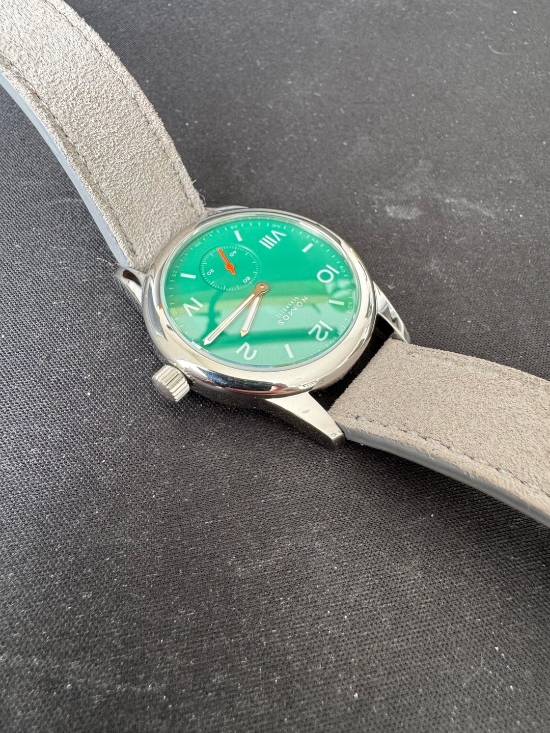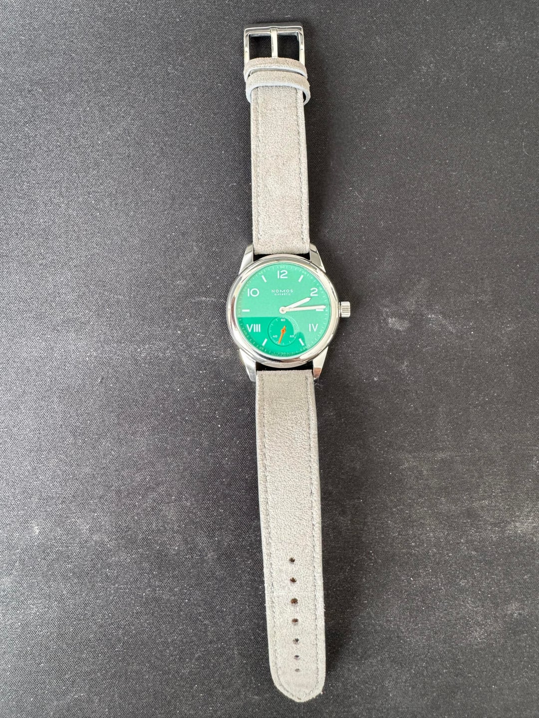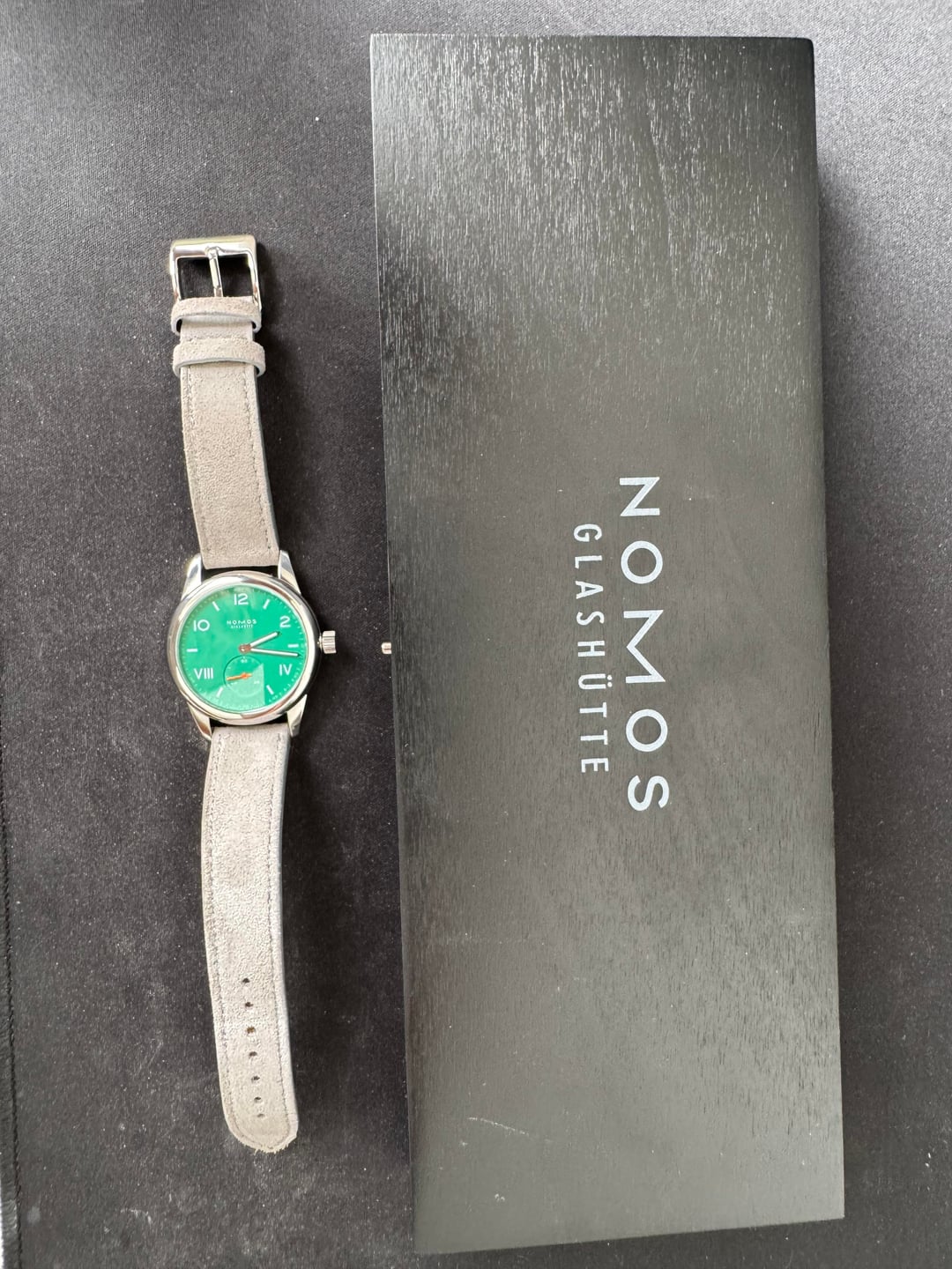 Condition: For sale is Nomos Club Campus 36 with Electric Green dial. This one is a bit of a catch and release for me as I bought from another user here on watchexchange just a few months ago, just ultimately deciding it’s not for me. The watch is running great with no problems that I can tell with the movement, winds beautifully and keeps good time. There are some notable signs of wear particularly on the back of the case (see photos), but that’s to be expected with a fully polished case and normal wear. The gray strap that comes with the watch is not the Nomos original, but rather a Tuns light gray suede strap in M/L (120/70mm) size. Features: * Model: Nomos Club Campus 36 * Dial: Electric Green * Case: Stainless Steel, polished * Movement: Nomos Hand-Wound Alpha Movement * Case Diameter: 36mm * Lug-to-Lug: 47.5mm * Thickness: 10.00mm * Power Reserve: 43 Hours * Water Resistance: 100m (10 ATM) * Crystal: Double-Dome Sapphire Extras: Includes original box Price: $800.00 (includes fully insured shipping to CONUS) Payment: Zelle or PayPal preferred. No trades