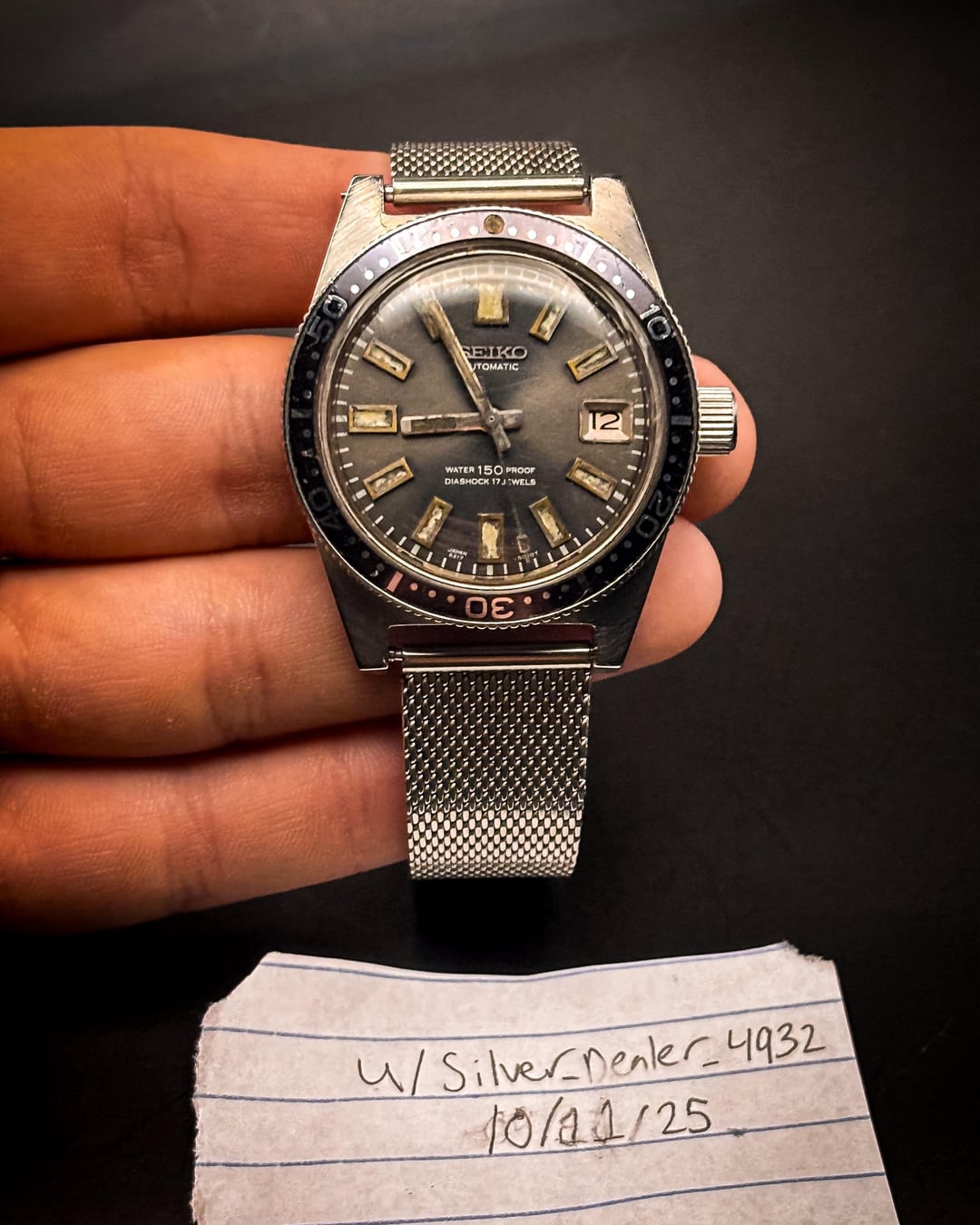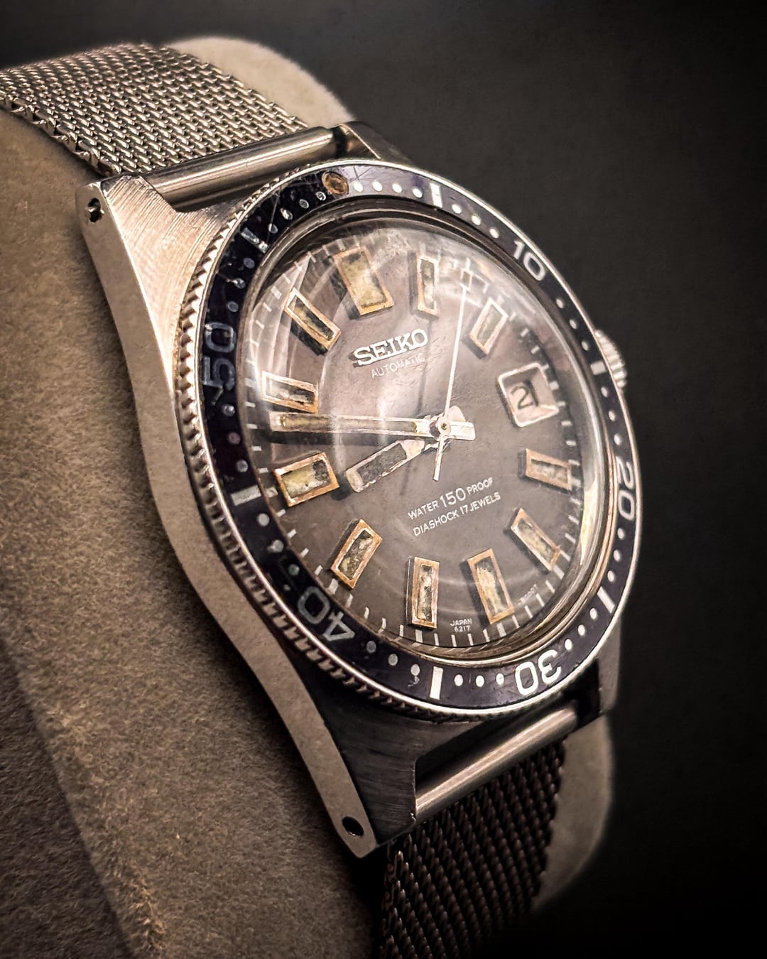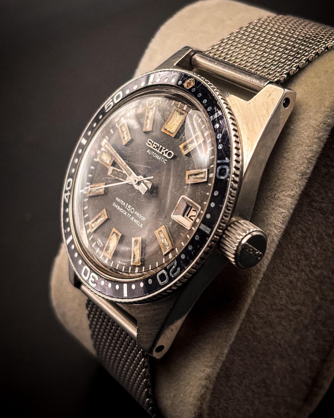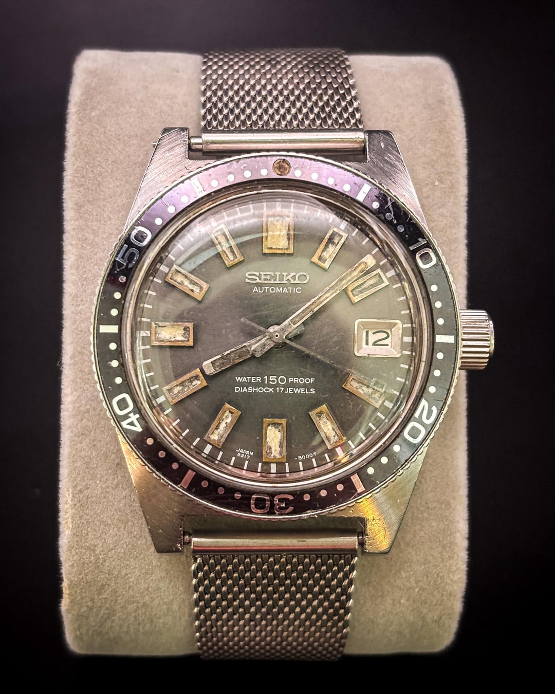 Condition – Very good vintage condition overall for this reference. The dial shows beautiful even aging, with creamy lume plots that have developed warm patina consistent with early 1960s Seiko divers. Hands retain their original tritium with matching tone. The bezel insert shows light wear with subtle fading that adds character but no major chips or cracks. The stainless-steel case remains sharp with honest wear and hairlines from age. Crystal shows light marks typical for its age but remains clear and legible. The aftermarket mesh strap is clean and comfortable, with minimal wear, and fits a ~7.4 inch wrist. The movement winds smoothly and runs well for its age. Box & Papers – Watch only. No original box or papers. Price – $2299 shipped via Zelle or bank wire. Add $15 for Apple Pay, $25 for Venmo, or 4% for PayPal G&S. No trades. Shipping – Ships same business day via FedEx Express. Signature required for PayPal G&S. Additional shipping options available upon request. Timestamp – Included in the attached photo set. Overview – Vintage Seiko 6217-8001 “62MAS”, the first professional diver from Seiko and the foundation of all modern Prospex models. This early example features the original 150 m “Water Proof” dial, automatic Caliber 6217A, and clean case geometry. Its naturally aged dial and bezel create a striking vintage aesthetic that collectors seek. A true piece of Seiko dive-watch history and an excellent candidate for any vintage-tool-watch collection.