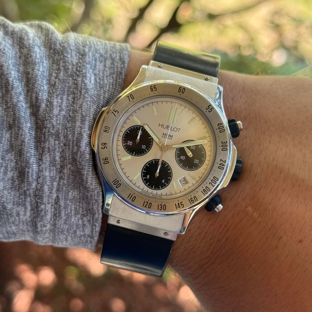 Hublot Super B MDM Chrono Info: 42mm case size. 42hr power reserve. Rubber covered bezel. Thin hardened Rubber strap. 330ft water resistance. Screw down crown. Included: Watch/ Box (box peeling as per usual with these) Condition: Good preowned shape. Some light marks on case, especially side. Runs well, OK band condition, but has some cracking. clasp is in good shape, and will fit a 7.1” MAX wrist. Winds well. Price: 💲2️⃣8️⃣9️⃣9️⃣ + Ship cost Payment: Zelle or Bankwire accepted Tagged Photo: https://imgur.com/a/SPNZo7U#95i88tO