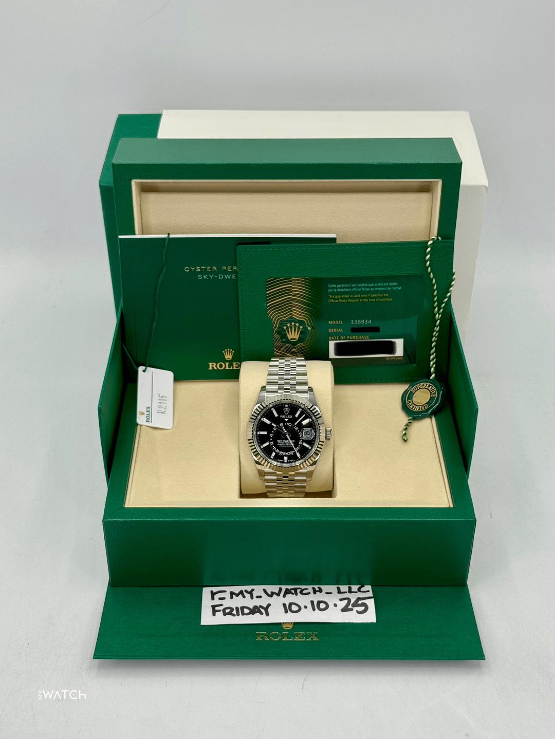 **🔵NEW 2025 Sky-Dweller 42mm 336934 Oystersteel and 18KT White Gold Fluted Bezel with a Jubilee Bracelet and Black Dial** **🔵TRADE or SELL us your luxury watch, all brands considered. Message me details.** **Includes the following:** **✔️BRAND NEW 2025 UPDATED ROLEX BOX (Double Boxed)** **✔️Box and Papers - Yes** **✔️Warranty card dated 2025** **✔️5 year warranty from date on warranty card** **✔️Manual and Warranty booklets** **✔️Green and White Hang Tags included** **✔️Size: 7.75inch wrist (Full Links)** **✔️Stainless Steel and 18K White Gold Fluted Bezel** **✔️Watch is BRAND NEW/UNWORN** **✔️Trades welcome** **Location: Oak Park, MI** Business Name: **My Watch LLC** LOCATION: Oak Park, Michigan ✔️[MyWatchLLC.com](http://mywatchllc.com) for current inventory ✔️Google Business Listing [https://g.co/kgs/Cmd6FPW](https://g.co/kgs/Cmd6FPW) ✔️Business Hours M-F 9-6 ✔️Facetime/Video chat/calls welcome to view the watch interested. ✔️Contact: 248-422-0909 via text or call for quickest response. 🟢TERMS: Visit [MyWatchLLC.Com](http://mywatchllc.com) for payments accepted 🟢REFERENCES/REVIEWS: We are well reviewed on all platforms from google, trust pilot, rolexforums, additionally we have 300+ reference in multiple FaceBook watch groups, reference checks welcome. 🟢SHIPPING: If you are not local, we offer Fully Insured FedEx overnight shipping in the USA for a fee. International shipping available.