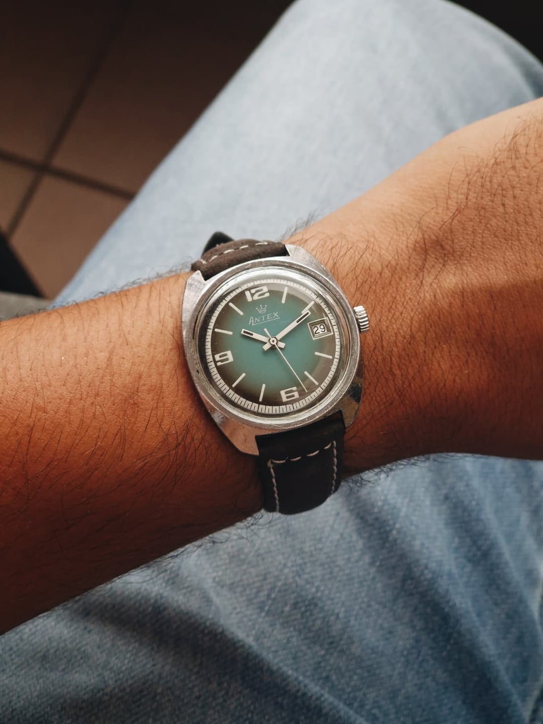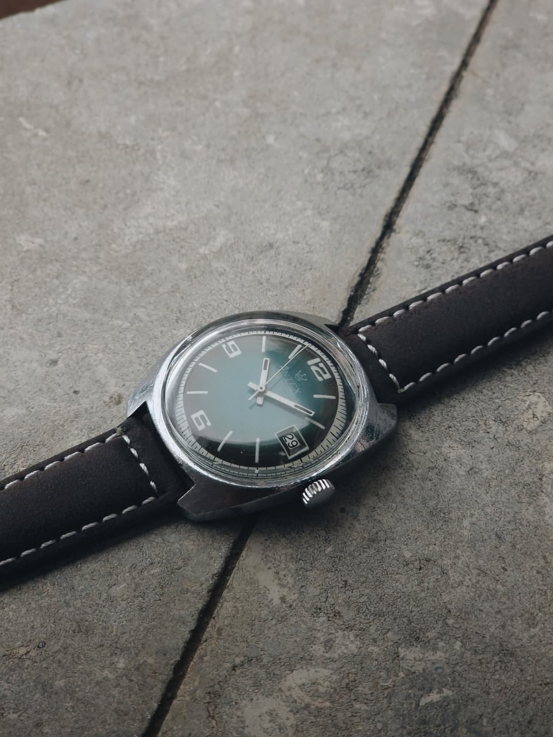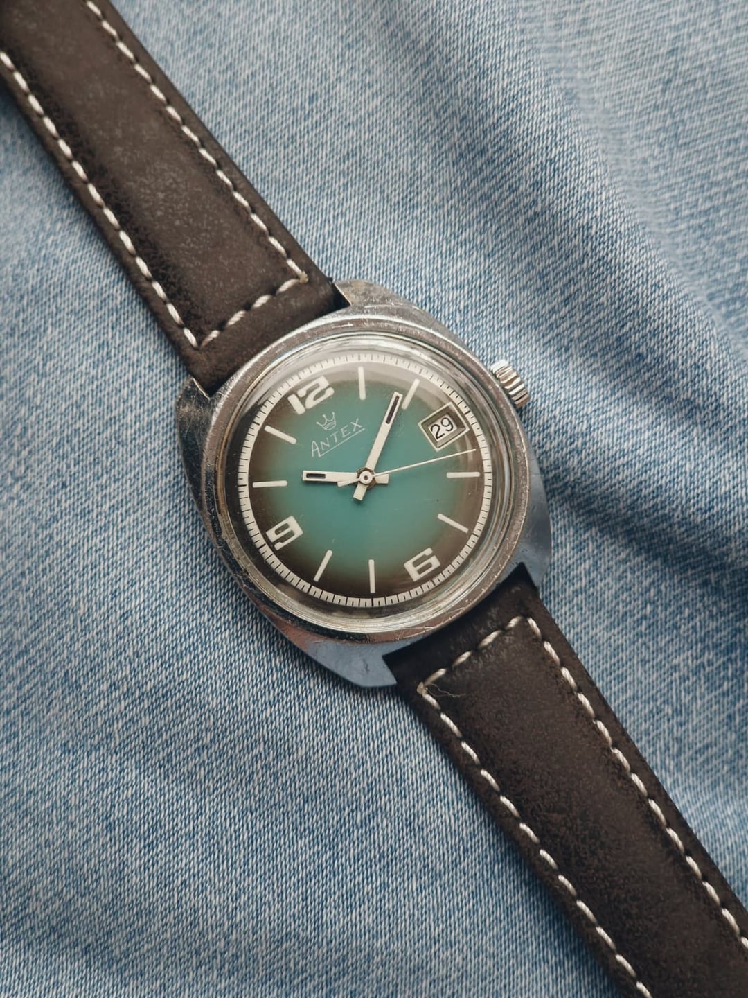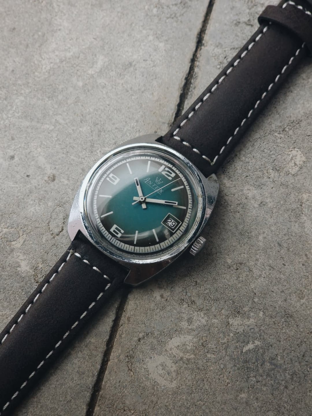 Antex was a French brand best known for its funky fumé and ombré dials, usually powered by robust FE manual-wind movements. This example stands out with its teal dial, contrasting white numerals, and matching white outer track. **Condition:** Okay. The case is showing some signs of age, especially in the sides and back. The dial looks excellent. Please see the pictures for full condition and clarity. **Case Size:** 35 x 40.1mm, with a thickness of 11.3mm and an 18mm lug width. **Movement:** FE 140-1, manual wind with 17 jewels, 21,600 bph, and a 47-hour power reserve. Service history is unknown, but it works well. **Other Information:** Includes a new leather strap. **Price:** Asking $60. Please add $20 for worldwide shipping. Payment methods include Wise, ACH transfer, Revolut, Bitcoin (On-Chain or Lightning), or PayPal G&S for buyers with solid references. Add +7.5% for currency conversion fees on the latter. Portugal has suspended all shipments to the US, but I can still ship to other countries. Established seller with over 220 transactions – buy with confidence! Make sure to follow me on Instagram (@daily.worn) to check out the newest additions. Happy to answer serious inquiries. No trades, no lowballs. [Pictures](https://imgur.com/a/KavrJrV) [Timestamp](https://imgur.com/a/h1aIh6r)