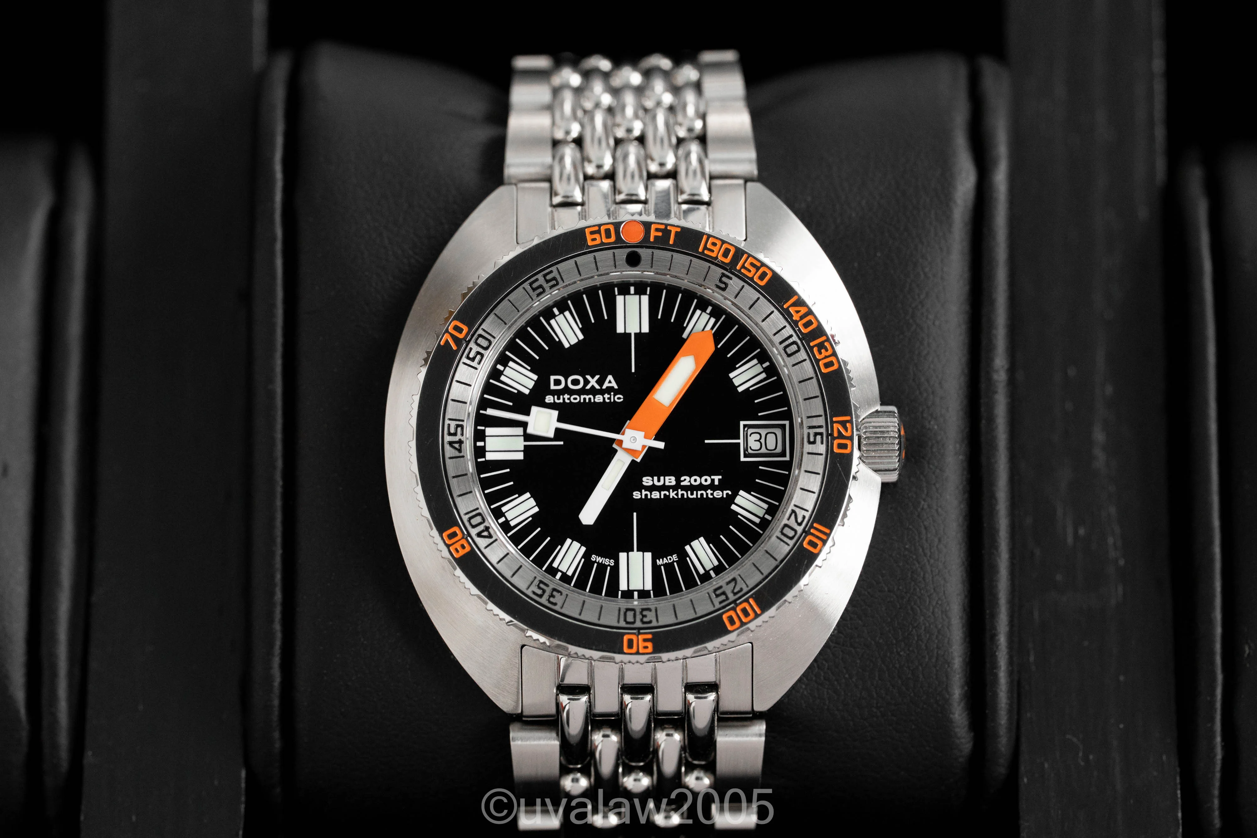 For sale is my black iconic dial DOXA SUB 200t Sharkhunter on OEM bracelet. Light surface wear to the polished surfaces and clasp; bracelet has never been removed. Comes with inner/outer box, manual, hang tag, all bracelet links, original sales receipt, and two-year warranty card good through May 2026.