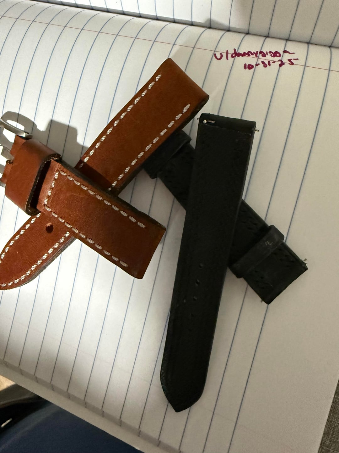 1. Europelli 22mm Cognac Horween w/ titanium stitching. Very soft and comfortable. Worn 2 or 3 times. Paid $165 asking $65 shipped 2. Unknown maker (I forgot)20mm matte anthracite gator w/ black double stitch. Excellent quality piece. Worn once. Paid $155 asking $45 shipped