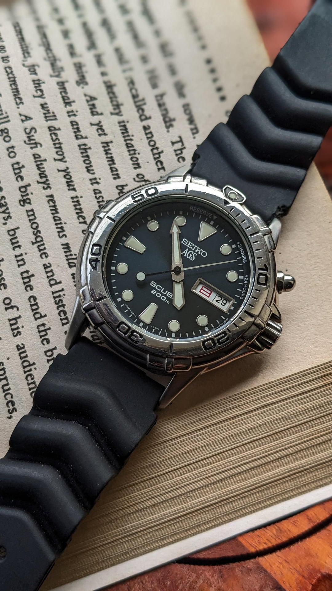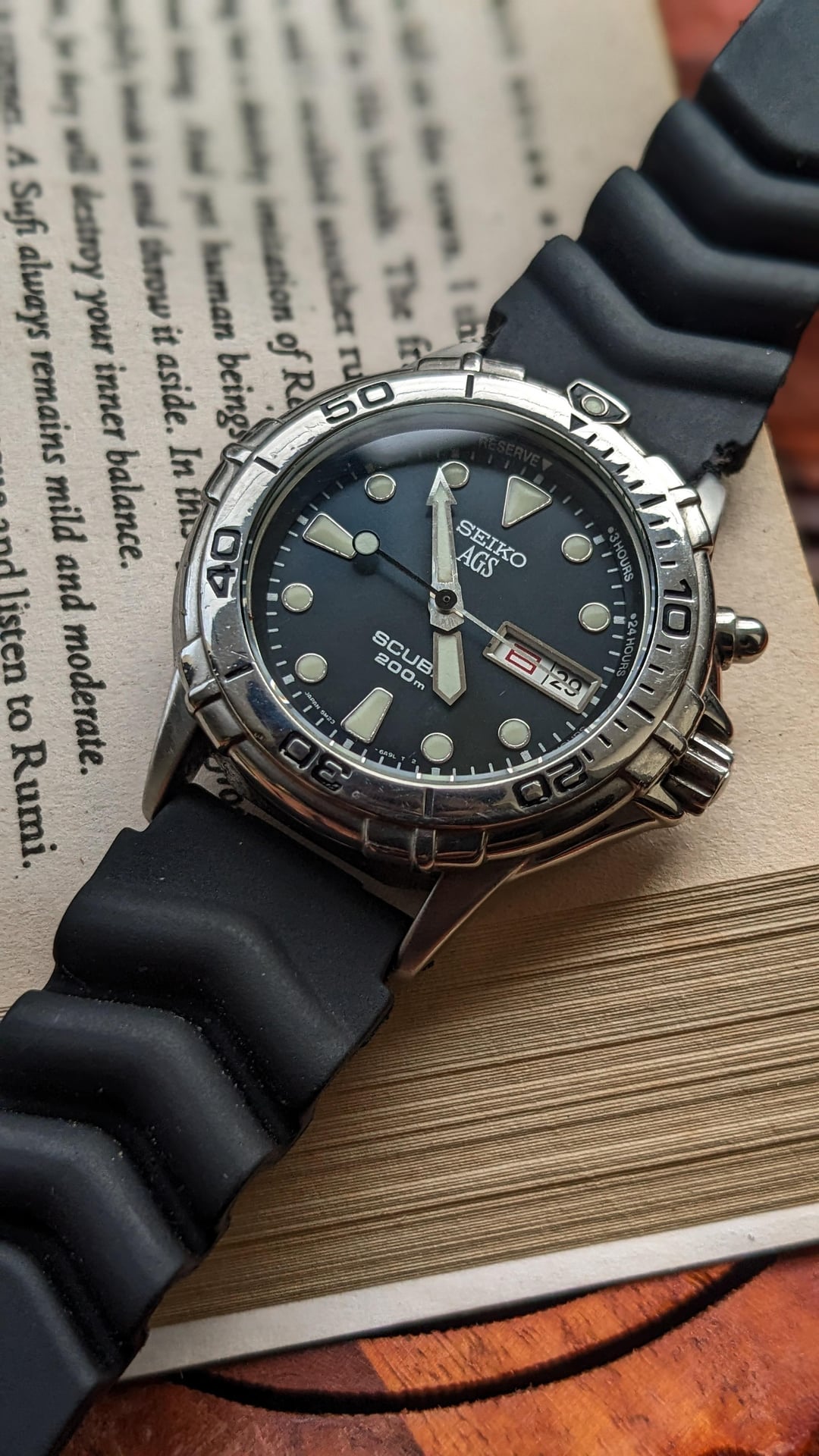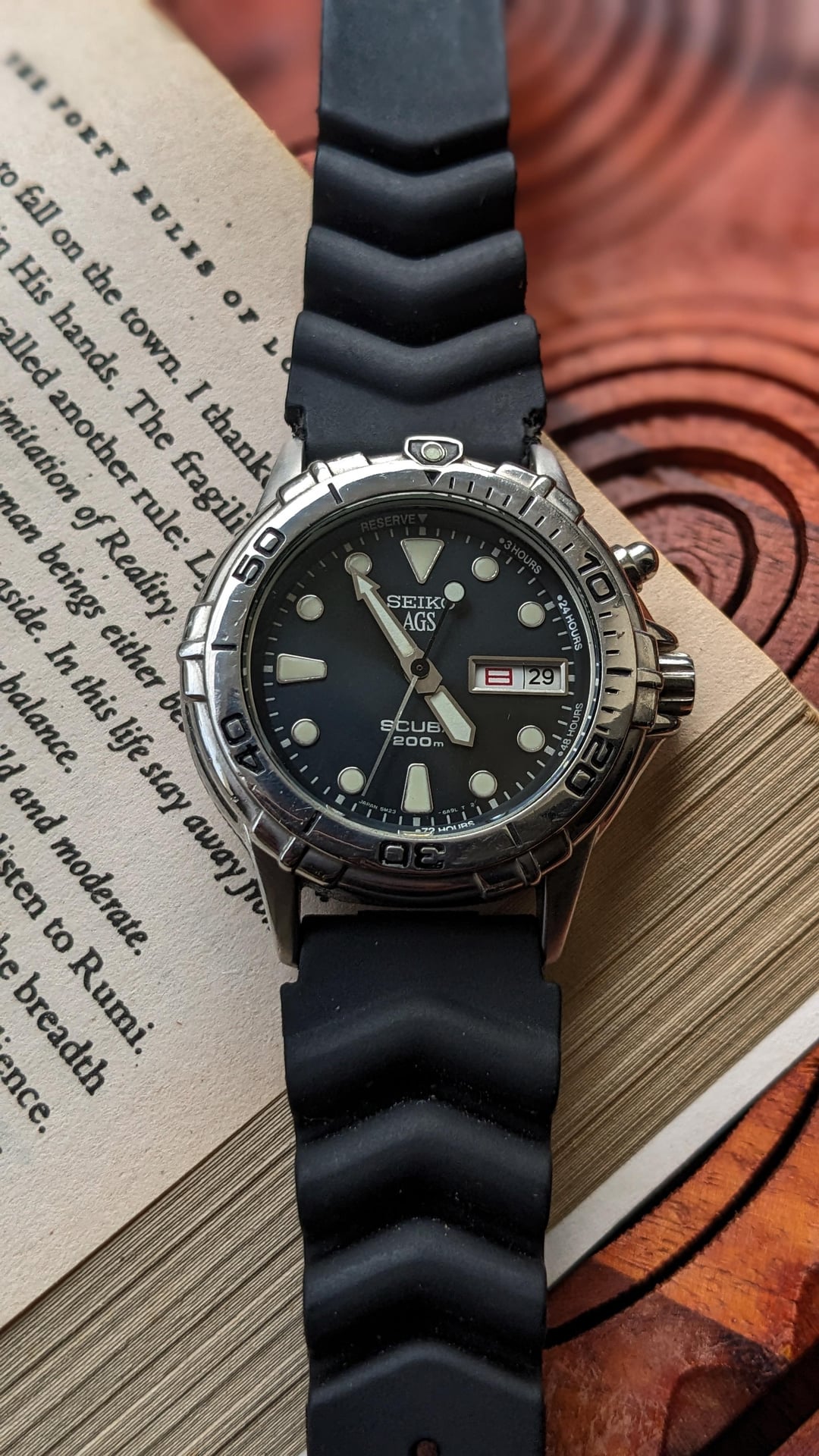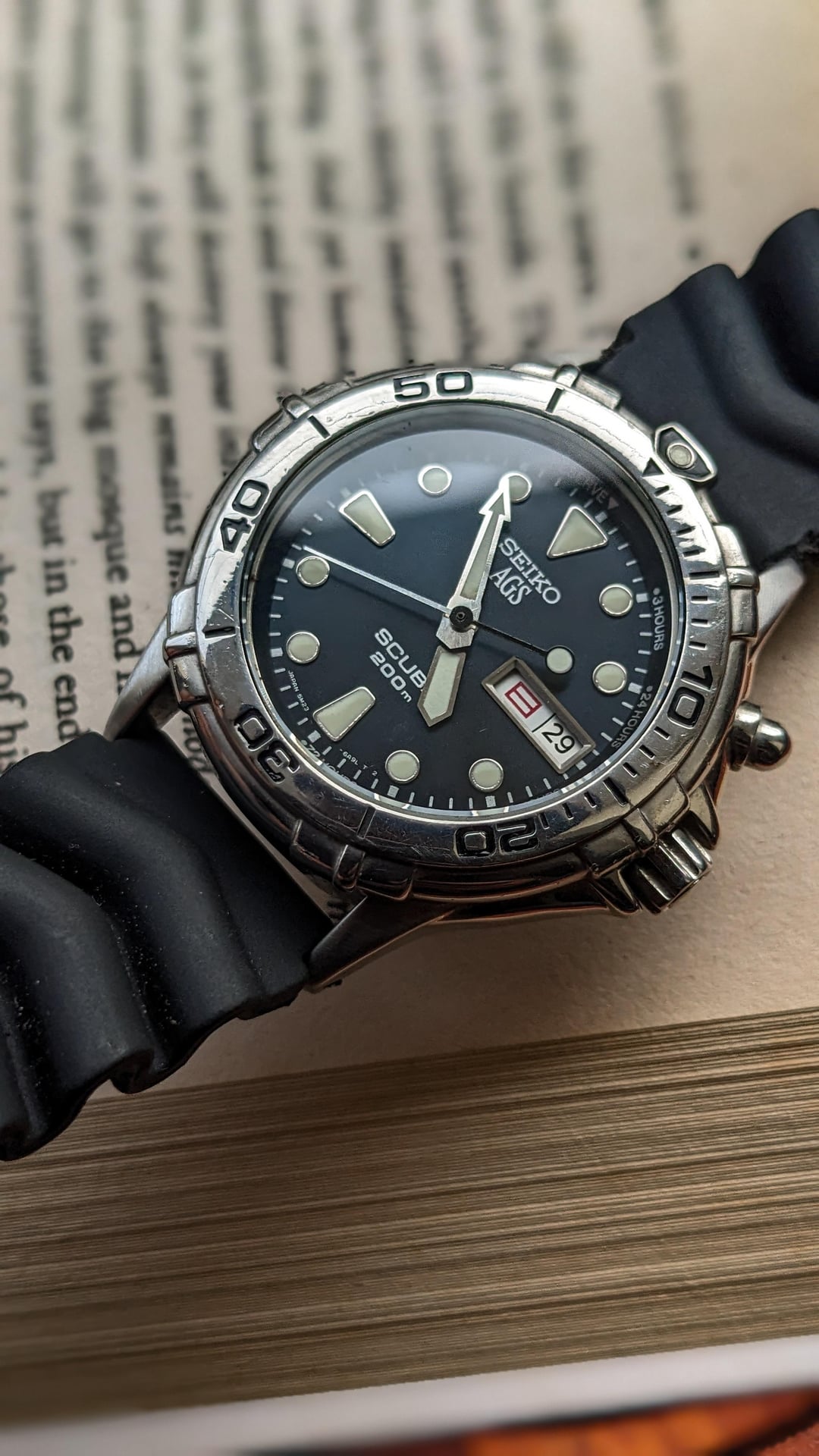 Vintage Seiko AGS Scuba Diver's Watch Brand: Seiko Model: AGS Scuba Reference Number: 5M23-6A60 Case Size: 38mm This Seiko AGS Scuba Diver features a striking Roman numeral dial and the rare 5M23 movement. The watch is in excellent working condition and comes with its Seiko rubber strap. Perfect for collectors or as a unique gift, this vintage timepiece is a rare find. Price : 165$ Timestamp: [https://imgur.com/a/joT06i0](https://imgur.com/a/joT06i0) dm or comment if interested