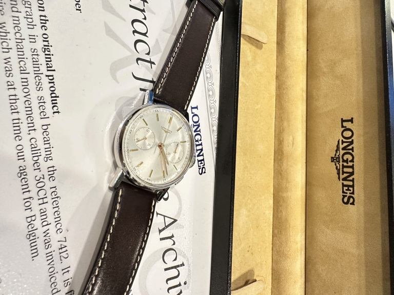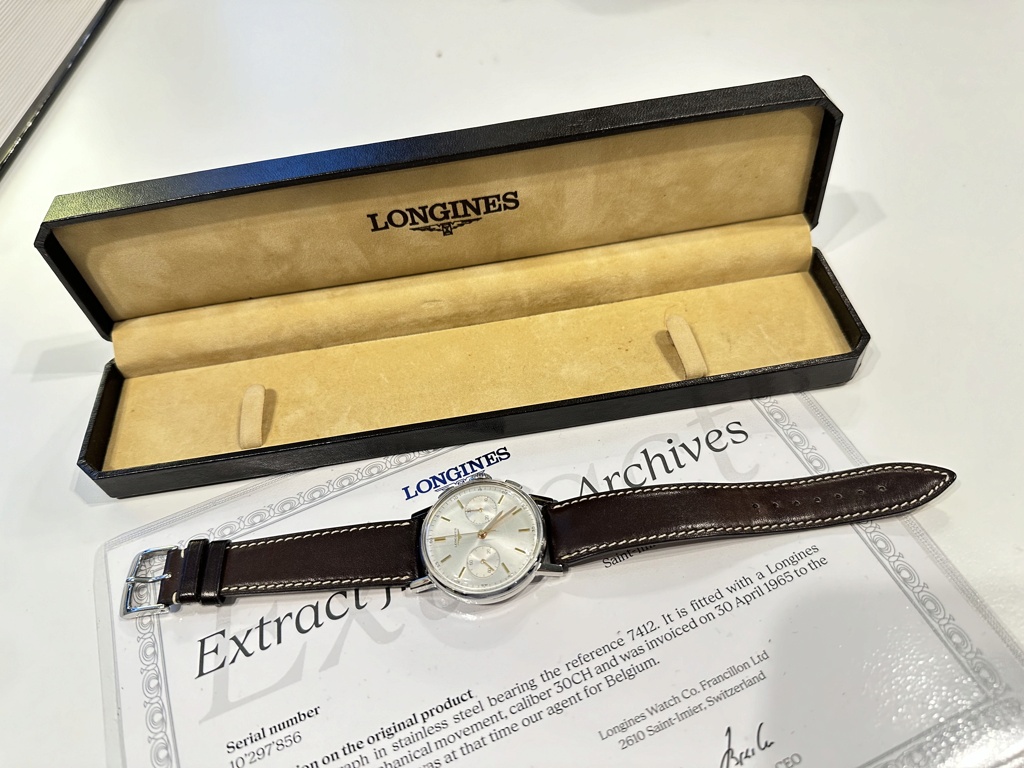 Je vends cette superbe Longines 7412, équipé du mythique calibre fly-back 30CH, créé par la marque de St Imier à la fin des années 40.