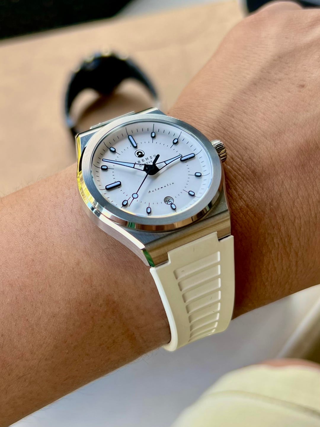Hello, up for sale is the sleek Direnzo Mondial DRZ 04R in White, a beautifully executed modern sports watch that blends bold design with refined finishing. Direnzo is known for its meticulous attention to detail and thoughtful engineering, and the Mondial exemplifies that perfectly, from the sculpted case lines to the elegant dial symmetry and superb wrist presence. This version features a crisp matte white dial with applied indices, striking hands, and a balanced date display. The integrated case design gives it a unique, cohesive look that wears incredibly comfortably, especially thanks to Direnzo’s customizable bracelet system, you can fine-tune the fit for maximum comfort. And if you prefer a sportier vibe, it looks fantastic on the included rubber strap, making it versatile enough for almost any occasion. Powering the Mondial is the Sellita SW200-1 Elabore Grade movement, ensuring reliable and accurate timekeeping with a smooth sweep and solid feel throughout. (See link below for time graph data) Timegraph data: https://imgur.com/a/W6DLnLv Specs: - 40mm stainless steel case - Integrated bracelet design - Automatic Sellita SW200-1 Elabore Grade - 100m water resistance - Sapphire crystal front and back - 20mm lug width equivalent - Interchangeable clasp Set includes: - Full kit (box, papers, and warranty card dated 06/2021) - Stainless steel bracelet with both butterfly clasp and fold-over clasp options - Direnzo rubber strap - Embroidered Direnzo logo patch Condition is great overall, with light signs of wear. Everything functions perfectly and the attention to design and finishing really stands out in person, it’s a seriously impressive independent piece for the money. Asking $850 shipped CONUS, no trades please. Thanks for looking, and feel free to message me for timestamp pics or additional details!