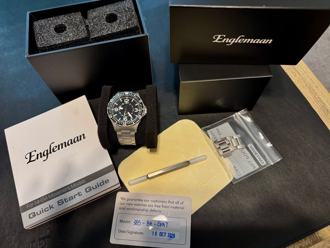 Up for sale is my (newly purchased) Englemaan Wraith UTC, an automatic GMT diver powered by the reliable Seiko NH34 movement. It’s built like a tank, with excellent finishing, a ceramic bezel, and extremely bright HyperGlow lume. Amazing watch, it's just not my style. Only resized and tried on. Never worn outside of my house. Warranty card purchase date Oct 2025. Includes: \[box, papers, extra links, warranty car, branded microfiber cloth, branded bracelet tool\] Asking just $225 including FREE Shipping to CONUS. Zelle Preferred. PayPal FF possible. Product Page: [https://englemaan.com/products/wraith-utc-40mm-black](https://englemaan.com/products/wraith-utc-40mm-black) Review: [https://www.youtube.com/watch?v=F57rk9UiS8o](https://www.youtube.com/watch?v=F57rk9UiS8o) Album/Timestamp: [https://imgur.com/a/69nWXdM](https://imgur.com/a/69nWXdM) Specs: ====== Movement: Seiko NH34 Automatic (UTC/GMT) Case: 316L Stainless Steel w/ Hardened Coating (900–1000 HV) Diameter: 40mm. Lug-to-Lug: 48mm Lug Width: 20mm Water Resistance: 200m Crystal: Sapphire w/ AR Coating Bezel: Ceramic Insert, 120-Click Uni-Directional Crown / Caseback: Screw-Down Bracelet: Solid Stainless Steel, fits wrists up to 180mm + 10mm micro-adjustment Lume: Custom HyperGlow® (25C Dial / 10C Hands) – super bright Anti-Magnetic: 80,000 A/m (≈1000 Gauss)