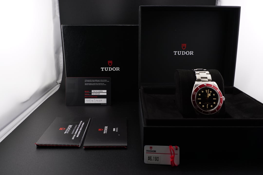 **Good condition** only a few light scratches | **Warranty Through 10.2028** | 37% off MSRP | **Complete Set** | Ref: 7941A1A0RU Asking: $3,205 MSRP: $5,100 + tax. Fits 8" wrist The Tudor Black Bay (7941A1A0RU) comes with a 41mm steel case and a captivating red bezel with a dive scale. The black dial houses luminous "Snowflake" hands and dotted markers for easy reading in low-light conditions. This classic and refined design is completed with a steel bracelet and a folding clasp. Although in good condition item has been previously worn .Please set expectation accordingly. Item has been previously authentication through Bennison for authenticity and functionality ("Specialists inspect materials, craftsmanship, movement, and serial numbers to verify authenticity, ensuring your watch is genuine and meets manufacturer standards") All packages are shipped Fedex with insurance. Free Shipping within the U.S.A. Watch located in MD USA. Facetime friendly IG: Timekeeperzam 📷 Pics/video: [https://imgur.com/a/tudor-black-main-photos-wNzT5cJ](https://imgur.com/a/tudor-black-main-photos-wNzT5cJ) 📆 Timestamp:[https://imgur.com/a/AfDNZ25](https://imgur.com/a/AfDNZ25)