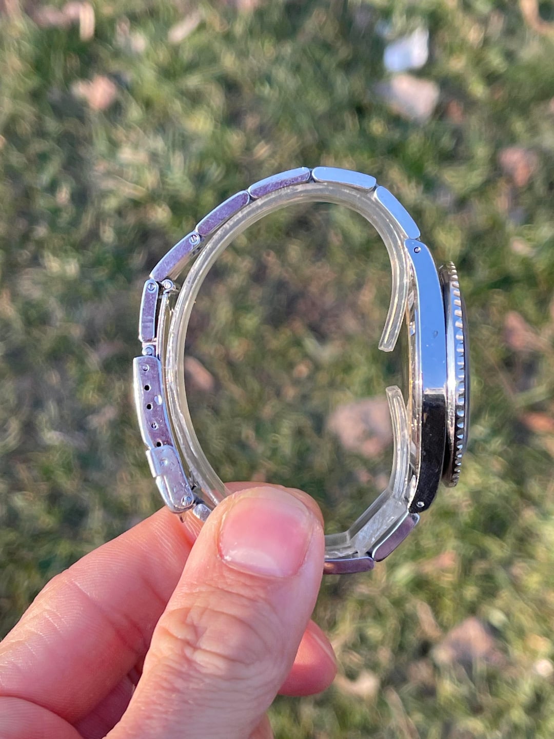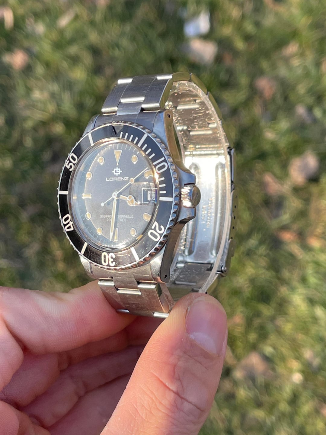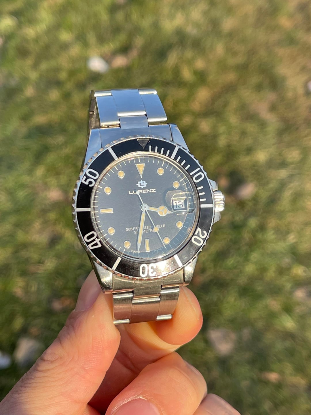 Hey all! Here is for sale a nice vintage diver Lorenz Sub Professionale 12286. Watch is in good condition. For sale is the watch, box, paper wallet with instructions and guarantee booklet. Case measures 40mm without the crown and 44mm with crown. Case is in good condition, it has signs of wear but no major dings or scratches. Caseback has Lorenz logo, 12286 reference number and even a factory sticker still intact. Bezel is aluminum black with silver arabic numerals, lume pip is missing. Crown is screw down, has Lorenz logo. Dial is matte black, it has Lorenz logo, Sub Professionelle 200m, date window at 3 o’clock and T Swiss Made T at the bottom. Lume on round hourmarkers matches the lume on hands, please check the lumeshot in Imgur gallery. Crystal is acrylic with date magnification, has no blemishes. Movement is quartz ETA caliber, fresh battery installed, you can see running hands on video in Imgur gallery. The watch will be shipped with NO battery according to new EU shipping restrictions on lithium batteries. Bracelet is in great condition, it is 20mm at the end links and has diver extension. Bracelet is tight and fully linked. Watch looks cool due to its vintage classic diver design which reminds a Rolex Submariner models and of course full set makes it even better. Album: https://imgur.com/a/Uq2cOtG Timestamp: https://imgur.com/a/Uq2cOtG#Hd7U5zP Price is $250 through PayPal Friends and Family. Standard International shipping is included in price. I ship international. I’ve sold a couple watches here, so you can check my feedback on r/WatchExchangeFeedback I am not interested in trades.