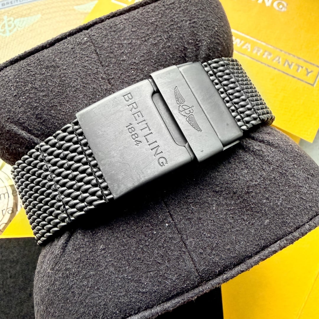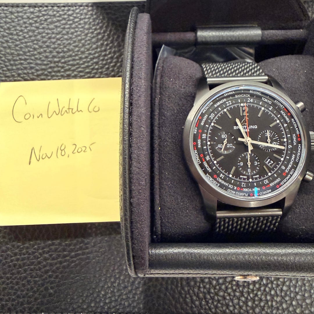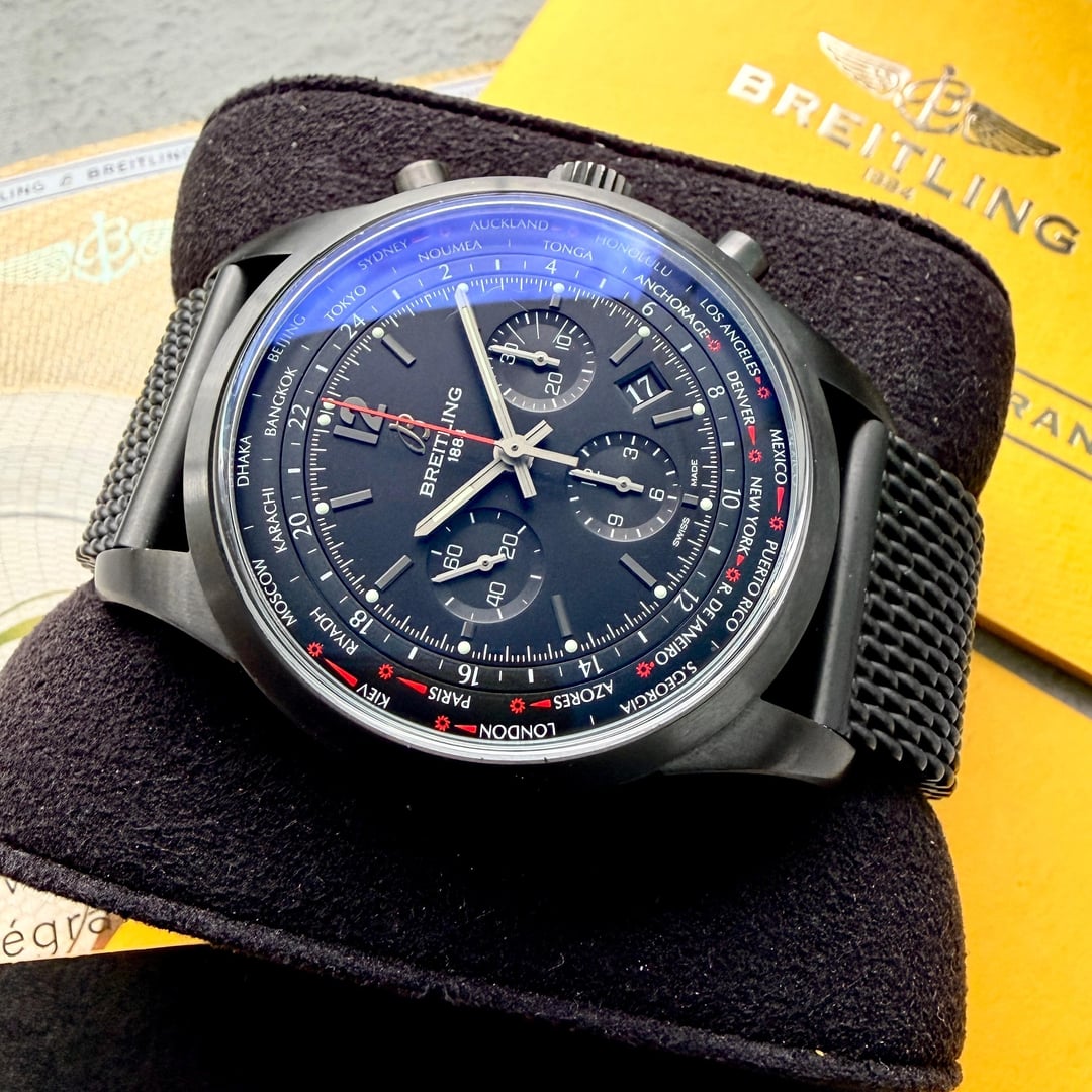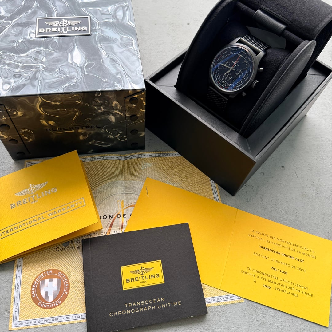 This Breitling Transocean Unitime Pilot, reference MB0510, is an extraordinary example of modern Breitling engineering and style, offered here in a striking full black-on-black configuration that commands attention on the wrist. Limited to just 1,000 pieces worldwide, this being number 749, it carries a level of exclusivity that sets it apart from standard production models. The black dial is truly captivating, offering a rich, multidimensional look that beautifully complements the DLC-coated case and matching black mesh strap. Its world-time functionality, powered by Breitling’s impressive in-house movement, makes it as practical as it is visually compelling. This is the kind of watch that inevitably sparks the question, *“What is that?”* each time it’s worn, thanks to its bold presence and technical sophistication. Complete with its original box, warranty card, and limited-edition status, this Transocean Unitime Pilot is an exceptional opportunity for a collector or enthusiast seeking a distinctive Breitling with global functionality and modern aesthetics. THE DETAILS * Case: 46mm Black Ceramic case which in attractive condition, showing light signs of previous wear * Dial/Hands: Original black dial which is perfect in every way. Hands are as attractive as they left the factory. * Bracelet/Strap: Original black strap with original deployment buckle showing honest signs of light wear * Caseback: Factory caseback showing honest signs of wear * Movement: IWC automatic movement which is currently running a -10 seconds per day * Crystal: Original sapphire crystal free from any marks or scuffs * Accessories: This watch come with everything you see in the photos including the original box, warranty card, booklets and everything else seen in the photos Available for sale US5350