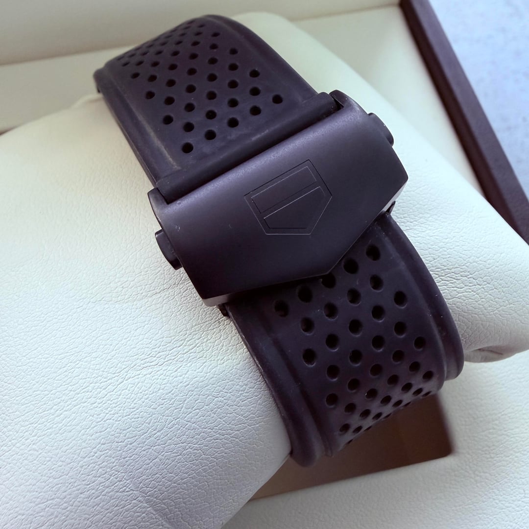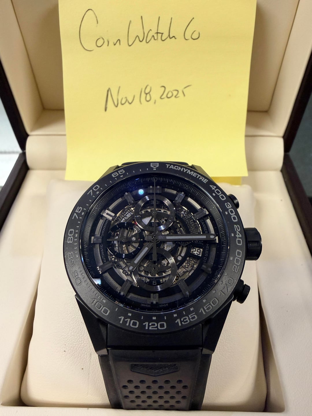 This TAG Heuer Carrera Calibre, reference CAR2A91, is a bold and modern statement piece, presented in a striking full black-on-black configuration that instantly sets it apart. Paired with a comfortable and sporty black rubber strap, the watch exudes contemporary performance and urban sophistication. Its open-worked skeleton dial is truly captivating in person, an intricate display of depth, movement, and mechanical architecture that draws the eye and invites a closer look. The cutaway design allows the wearer to appreciate the heartbeat of the movement beneath, creating a dynamic visual effect that is sure to spark the question, *“What watch is that?”* every time it’s on your wrist. Offered complete with its original box and warranty card, this Carrera delivers both impressive presence and full provenance. For anyone seeking a modern TAG Heuer with strong design, technical intrigue, and undeniable wrist appeal, this piece stands out as an exceptional choice. THE DETAILS * Case: 45mm Black Ceramic case which in attractive condition, showing light signs of previous wear * Dial/Hands: Original dial which is perfect in every way. Hands are as attractive as they left the factory. * Bracelet/Strap: Original black rubber strap with original deployment buckle showing honest signs of light wear * Caseback: Factory caseback with a sapphire back allowing to view the beautiful movement * Movement: IWC automatic movement which is currently running a -10 seconds per day * Crystal: Original sapphire crystal free from any marks or scuffs * Accessories: This watch come with everything you see in the photos including the original box, warranty card, booklets and everything else seen in the photos Available for sale 2590