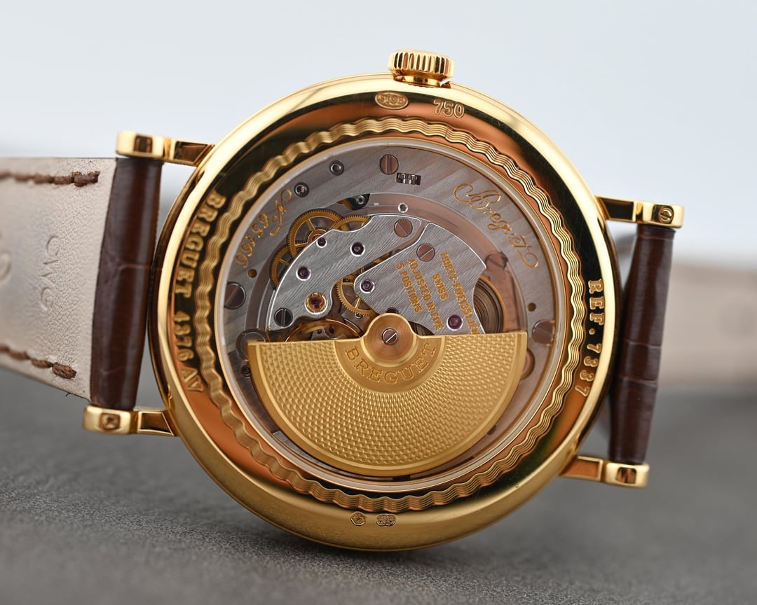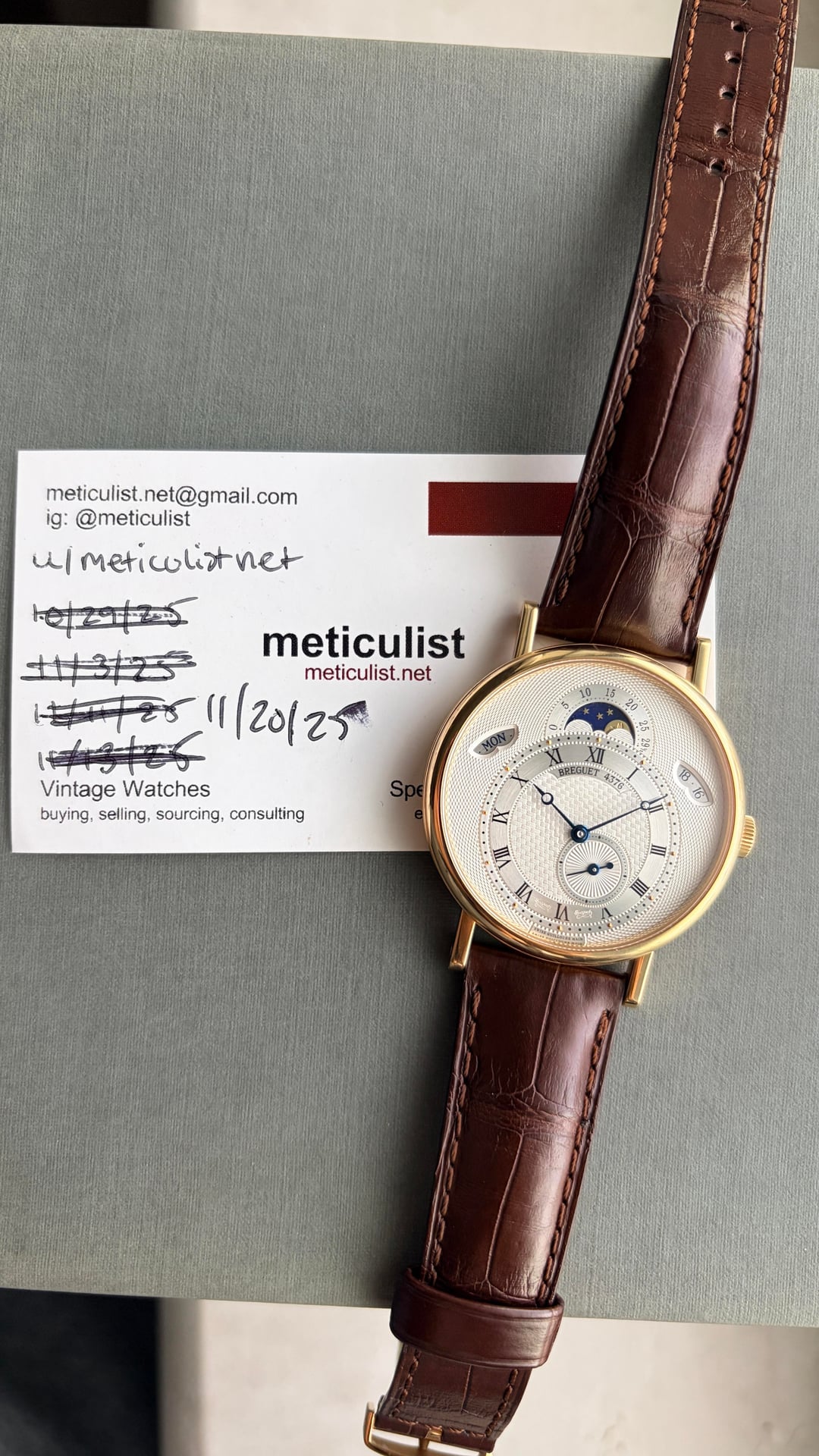 The Breguet Classique “Calendrier” or “Day Date Moonphase” reference 7337BA/1E/9V6 is masterful update and modernization to one of my favorite all time watches, the reference 3330, which is turn the wristwatch adaption from an original Abraham Louis Breguet pocket watch design from the 1800’s. In my opinion, the dial layout is, or has to be, the most clean, elegant, aesthetically pleasing, and symmetrical display of the day, date, moonphase, and, of course, time. The reference 7337 is distinguished by a subtle and intentional disruption to that symmetry in the slight offset of the subsidiary seconds dial, which adds a little extra Breguet quirk and charm. Otherwise, the 7337 builds on the reference 3330 / 3337 with not just one, but four(!) different hand or traditionally applied guilloche patterns on the dial, while still maintaining a beautiful balance and symmetry to the dial that I feel is lost in the most recent versions that have oversized day and date apertures that are drooped down the sides of the dial and set much lower. The current release also clutters the dial with additional text and only features one guilloche pattern, while utilizing the same, wonderful, 502.3 QSE1 movement at a $55,600 price tag. A true display of old-school craftsmanship inside and out, the 7337 features modern updates such as the silicon hairspring and 45-hour power reserve from the beautifully finished Fredric Piguet caliber 71 base. It’s truly the modern proportioned take on a perfect design. **Case:** The 39 x 47 x 10 mm yellow gold case appears to be unpolished and in very good condition, exhibiting light wear and surface scratches to the polished surfaces as shown in the photographs. **Dial:** The silvered, solid gold dial is a true work of art featuring four different traditionally applied guilloche patterns, the classic radially brushed hour and minutes tracks, and always excellent heat blued Breuget hands. I particularly love the soleil guilloche in the second subdial and the applied gold nipples or cabochons to mark the hours. This particular dial is potentially unique as it is missing the “dot” or fifth-second marker on the subsidiary second’s track. For the nuanced collectors in particular, this may be a unique “error dial” that is otherwise flawless and free of any imperfection. The watch was originally purchased from Watchbox and can be seen on [**Tim Mosso’s watch review here**](https://youtu.be/69nuB3eiztk?si=mVsQKnaM0X9dhFMa). **Movement:** The caliber 502.3 QSE1 is a F. Piguet caliber 71 derived ultra-thin automatic winding movement with an offset winding rotor. It is beautifully finished with cotes de Geneve, perlage on the base plate, polished counter sinks and screw heads, and applied anglage. The winding rotor features the same hand applied guilloche pattern as the outer portion of the dial. The watch is winding, setting, and running well at approximately +2 s/d, averaged across six positions. **Strap:** The watch is presented on a brown Breguet signed alligator strap with matching three-blade deployant clasp. **Includes:** Outer box, inner wooden presentation box, guarantee booklet dated March 6, 2011, boutique booklet, manual, registration booklet, serial matching leather hang tag, and gold calendar corrector, a true full set. Price: $22,000 including fully insured shipping from Phoenix, AZ to a FedEx office location or commercial address within the continental US, international shipping available at cost based on location. Payment by ACH or wire, no trades please. I have all positive references here, [Chrono24](https://www.chrono24.com/dealer/meticulist/index.htm), forums, and [Instagram (@)meticulist](http://instagram.com/meticulist) all available watches can be found at [meticulist.net](http://meticulist.net) Thanks mods for the space.