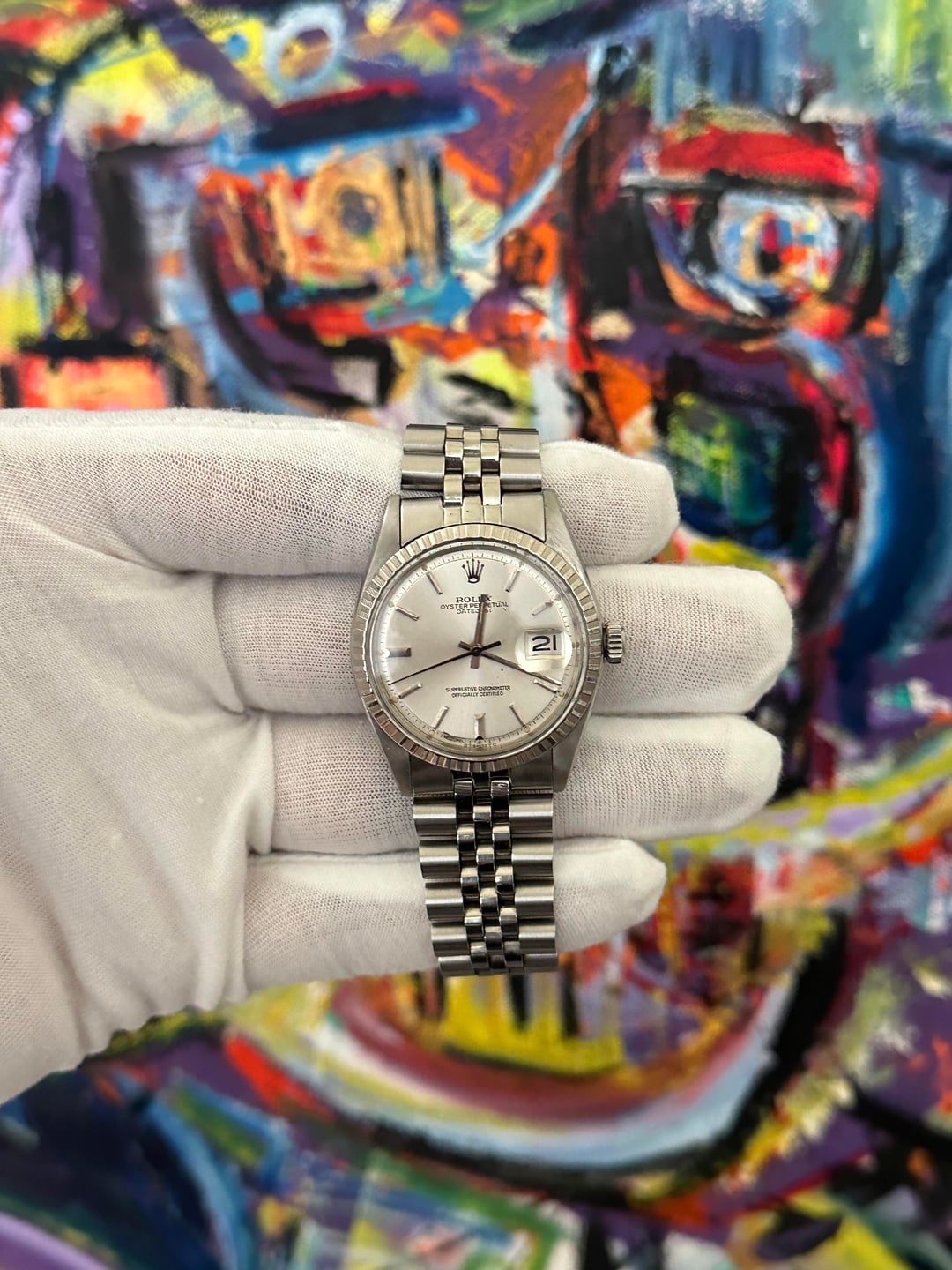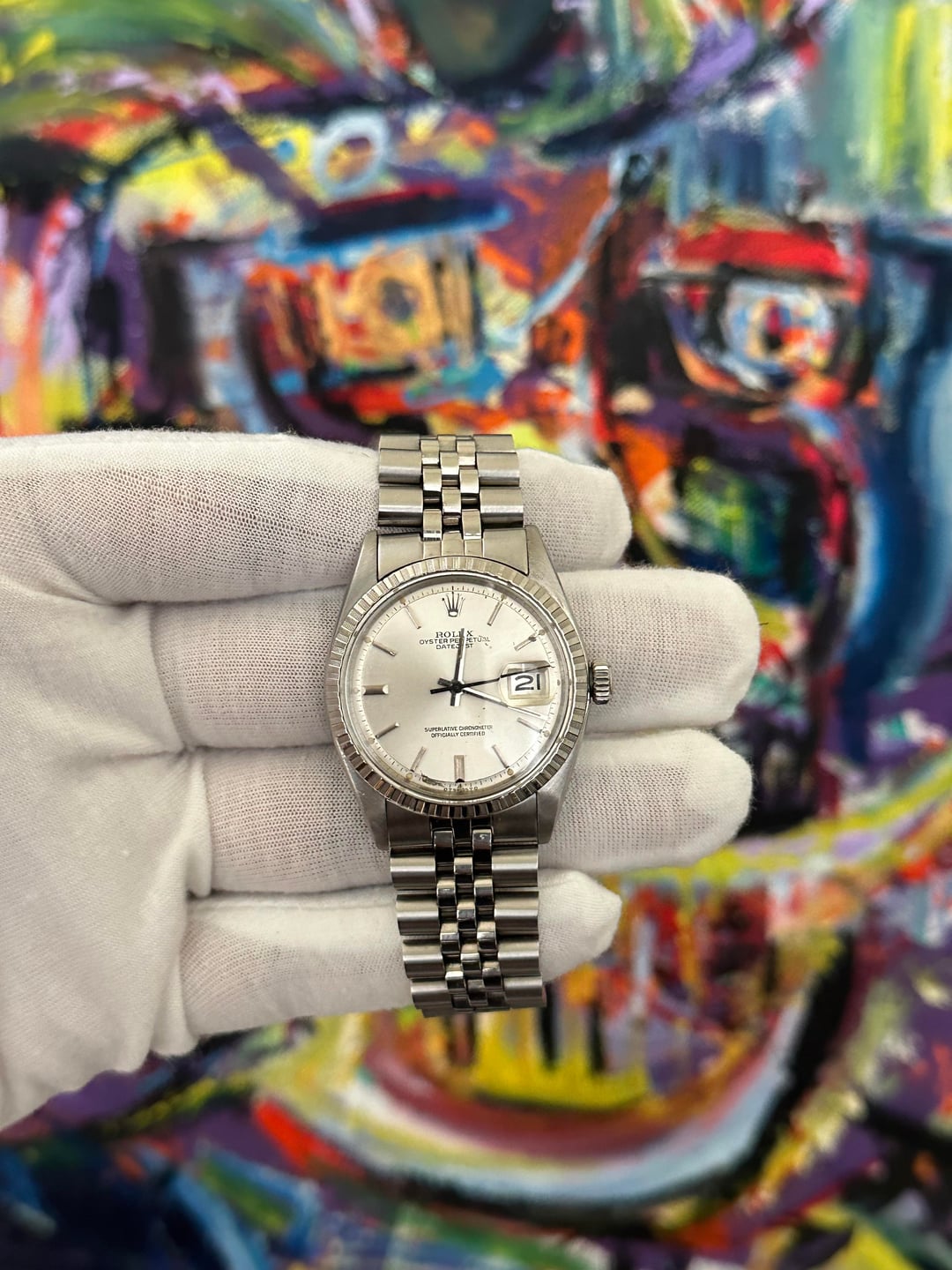 | Rolex Datejust Mens 1603 Stainless Steel Watch Engine-Turned Bezel Silver Dial beckertime (23907) |