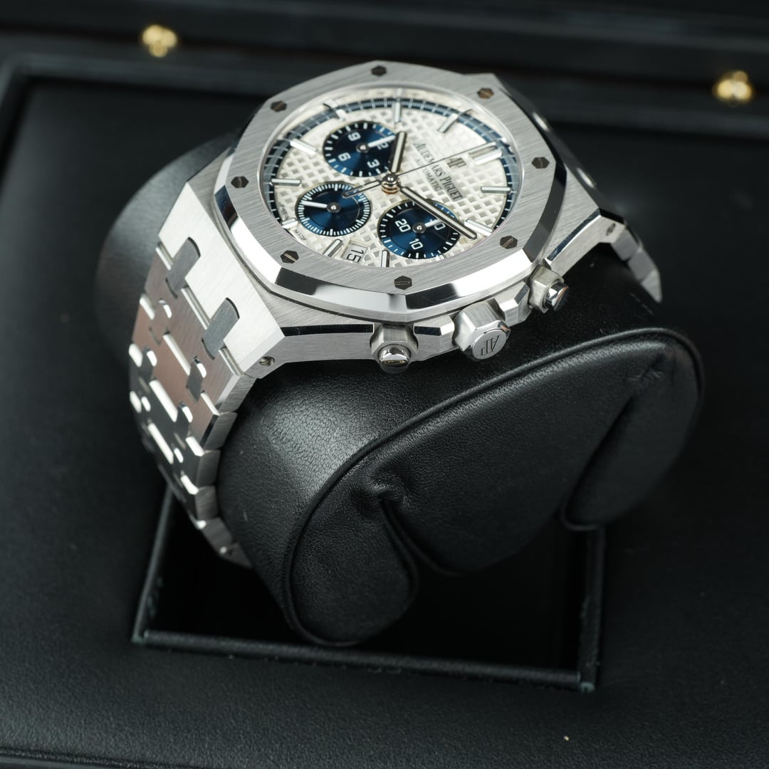 2020 Audemars Piguet Royal Oak Chrono Silver Blue Panda 38mm Steel 26315ST Complete Timestamp: [https://imgur.com/Q242lud](https://imgur.com/Q242lud) The Audemars Piguet Royal Oak Chronograph 38mm (Ref. 26315ST.OO.1256ST.01) is a masterpiece that blends timeless design with modern elegance. The striking silver-toned “Grande Tapisserie” dial is adorned with contrasting blue sub-dials and luminescent hands, offering both functionality and aesthetic appeal. Powered by the reliable self-winding Caliber 2385, this chronograph boasts a 40-hour power reserve and is water-resistant up to 50 meters, ensuring durability and precision. Comes as a complete set with Inner/Outer box, booklets, and warranty card. This timepiece is overall in mint condition. Please look at my pictures as I like to fully represent the exact condition of the watch through my photography. **Offered at $54,999 shipped in US or OBO.** Payments accepted: Wire or Direct Bank Transfer (Bank of America). Shipping is always FedEx/UPS overnight, fully insured. I am an avid enthusiast and collector and am not affiliated with any watch brand I post. **Always open to trades or purchases! Looking for Audemars Piguet, Rolex, Patek Philippe, FP Journe, Vacheron Constantin, and other luxury brands.** I guarantee every watch I sell to be 100% authentic. Follow me on IG: JJ\_Timepiece\_Co Call or text (941) 800-3931