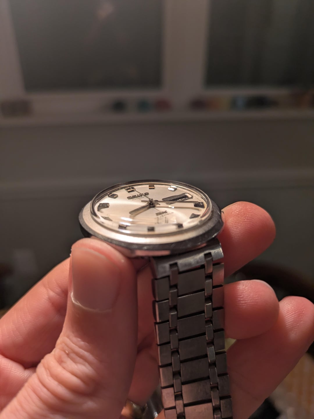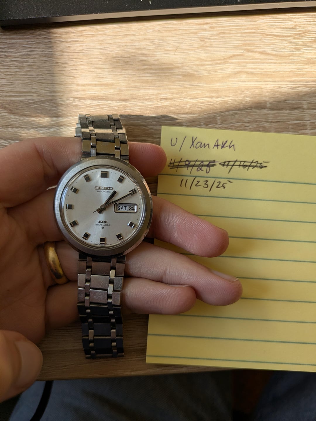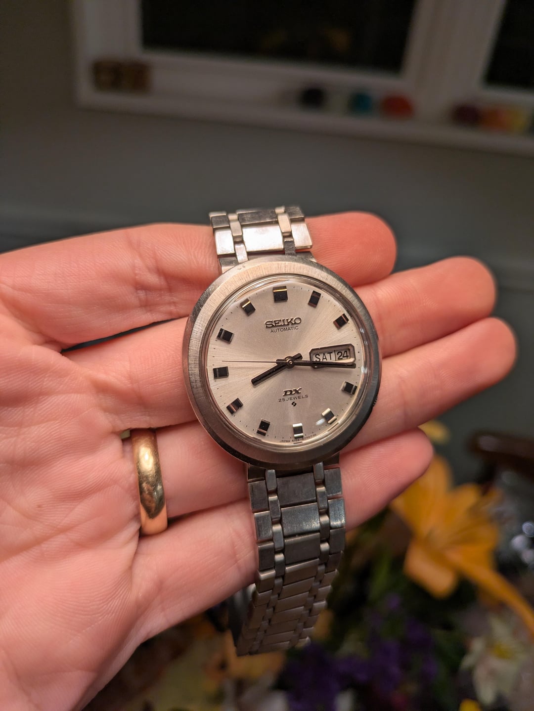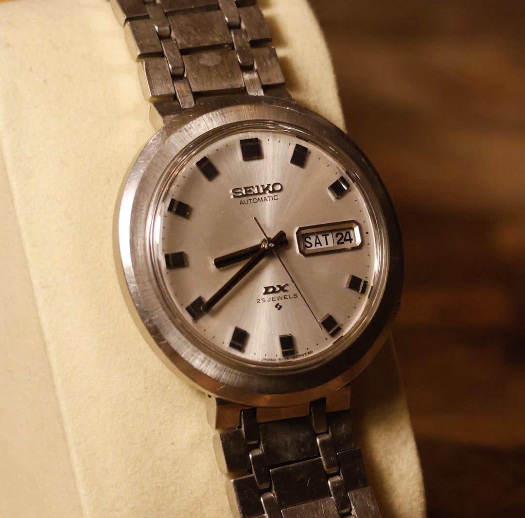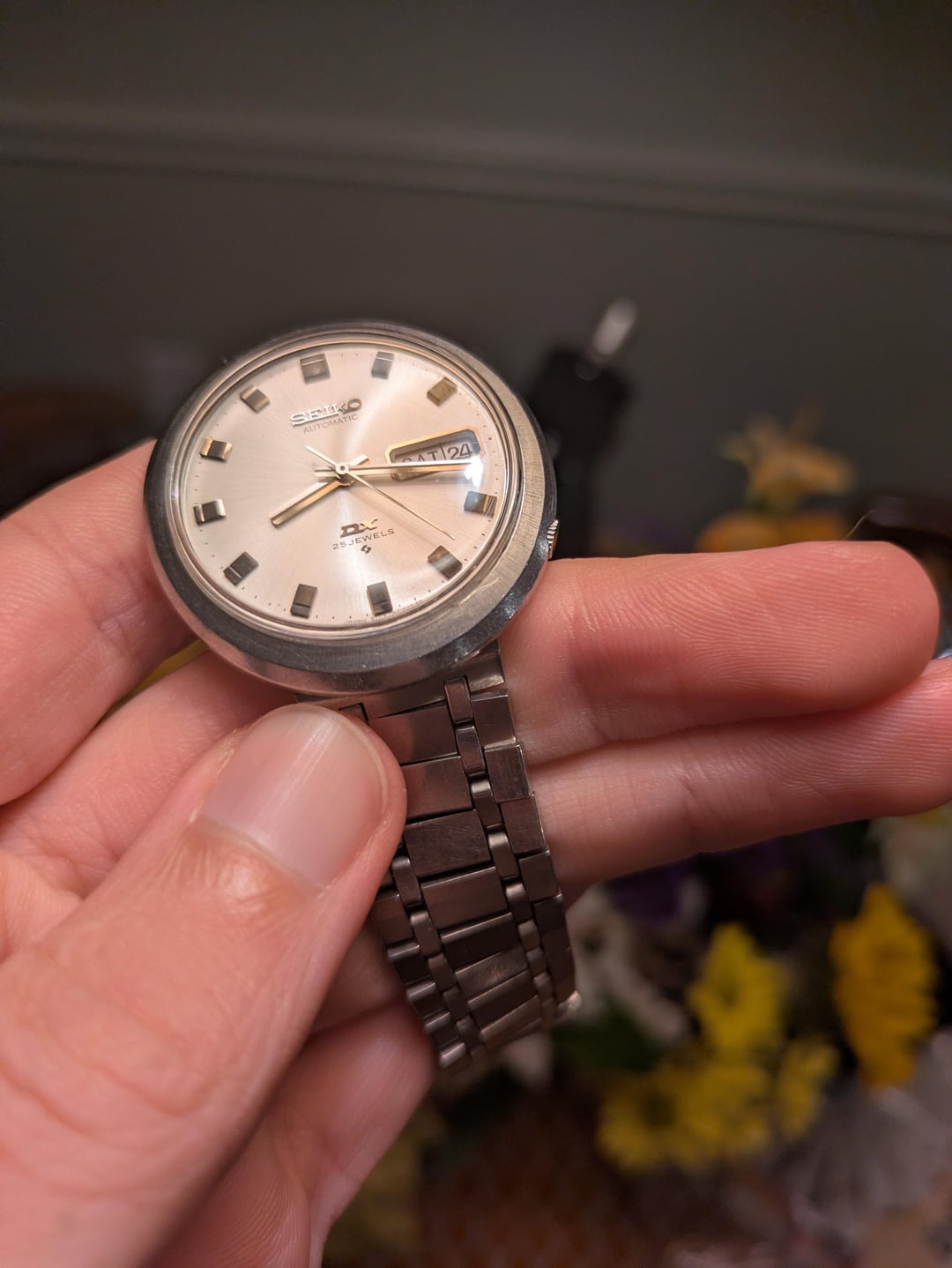 Up for sale today is the funky-yet-elegant **Seiko DX 6106-8070** from 1968. The DX range was used by Seiko to designate watches originally in the "5" line but with a higher quality finishing. This 6106-8070 features a silver sunburst dial whose sunburst continues out through the case for a unique look, as well as a slightly oblong/ovular case. Another fun feature is the quick-set date activated by pushing in the crown (which sits nearly flush with the case). All parts are original (including the bracelet), and the watch was given a complete overhaul service (\~$400) by the good folks at [Time Zone](https://www.timezonecostamesa.com/) in 2024 (service receipt will be shipped with the watch). Current accuracy is +/-10s per day by my daily record, but I have not put it on a timegrapher. **Seiko DX 6106-8070** *Produced*: October, 1968 *Movement*: Seiko 6106 (day/date, hacking, quick-set date) *Case*: \~36mm *Bracelet*: 18mm (original, currently sized for my 6.5" wrist, with extra links included) *Crystal*: Domed Acrylic (original, polished) *Defects/Signs of Age*: In fantastic shape for being almost 60 years old, the bracelet has minor scuffs while the case has a few minor dings and scratches (please see photos and/or DM me for further details). I have never held another 8070 case, so I am only guessing at this part, but one of the spring bars does not depress and the link does not move - I do not know whether this means it is rusted, but the folks at Time Zone asked me if I wanted to force it open and I said no. As you can see from the photos, this does not affect the comfort or look of the watch, especially since the "notched" style of the bracelet means that this watch is essentially always worn with the original bracelet. *Price*: **$250** OBO, PayPal F&F (includes tracked USPS shipping within CONUS) - also available for local pickup in DMV/MD