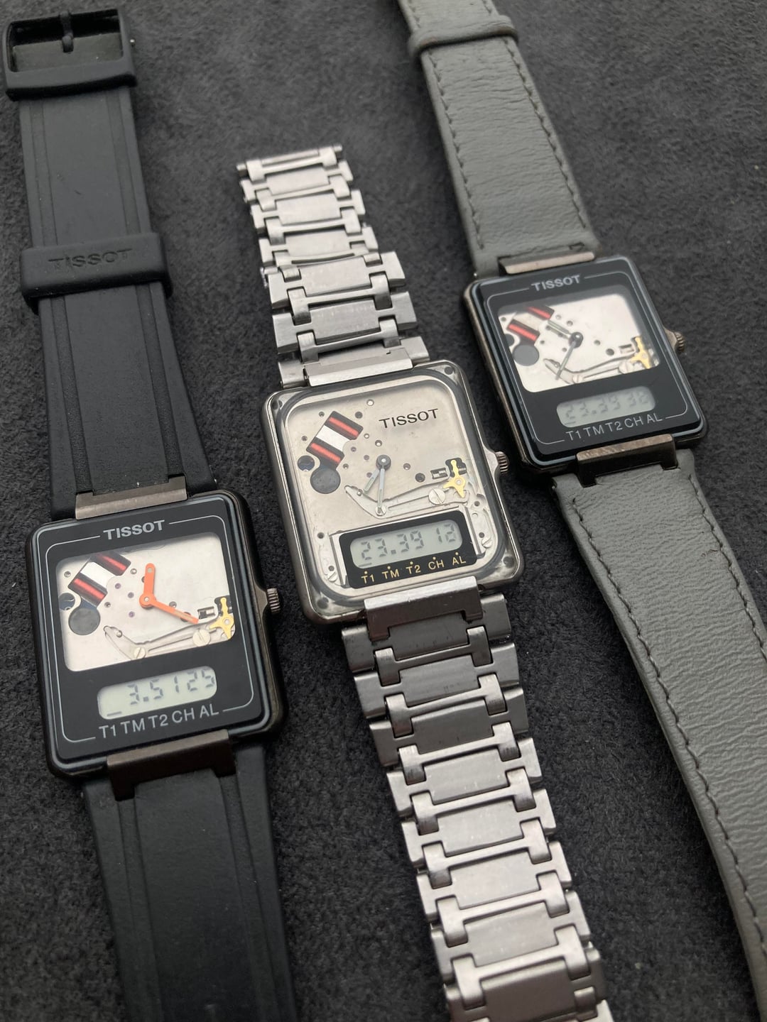 Selling these beautiful late 19980s or early 1990s Vintage Tissot Two Timers. **All watches are in fully functional condition, will get a fresh battery and prices are net to me. All watches are true vintage with ranging levels of condition.** TIMESTAMP: [https://imgur.com/a/PDcuJjP](https://imgur.com/a/PDcuJjP) Worldwide shipping available at buyers cost. Payment via Wire, Wise or PayPal G&S (+fees) for established users. \#1 BOX & PAPERS Gunmetal Two Timer Skeleton with a Tissot printed crystal, a black rubber strap and signal orange hands. Great condition! Asking: 250€ \#2 Silver Two Timer Skeleton with a Tissot printed ghost crystal, silver metal bracelet and grey and white hands. Great condition. Asking: 280€ \#3 Shiny Gunmetal Two Timer Skeleton with a Tissot printed crystal, a grey leather strap and black and grey hands. The Skeleton dial is shiny silver, the condition is great. Asking: 230€ \#4 Gold Two Timer Skeleton with a Tissot printed crystal, a goldfish rubber strap and gold hands. The rubber strap is a little stiff due to age but works fine, the condition is good with minor marks. Asking: 220€ \#5 Silver Two Timer Skeleton with a Tissot printed crystal, silver metal bracelet and white hands. Condition is good with some visible marks. Asking: 250€ \#6 Gunmetal Two Timer Skeleton with a Tissot printed crystal, a black leather strap and black and grey hands. Some visible markings on crystal and the backside of the case. Asking: 210€ \#7 Silver Two Timer Skeleton with a Tissot printed crystal, a grey leather strap and white hands. Condition is great, only the crystal has very small markings. Asking: 220€ \#8 Gunmetal Two Timer Skeleton with a Tissot printed crystal, circular window, a black leather strap and silver and black hands. Condition is great, only the case has some markings on the back. Asking: 200€ \#9 Red Two Timer Skeleton with a Tissot printed crystal, circular window, a red leather strap and red and white hands. Condition is great, only the case has some small markings on the back. Asking: 200€ \#10 Silver Two Timer Skeleton with a Tissot printed crystal, circular window, a grey leather strap and white hands. Condition is great. Asking: 200€ **BUNDLE #8, #9 & #10 All three watches with circular windows can be bought for the price of two, so 400€** \#11 Gunmetal Two Timer with black and red striped printed crystal, striped dial, a black leather strap and red and white hands + Second red leather strap. Condition is great, but markings on the backside of the case. Asking: 180€ \#12 Gold New Gen Two Timer with brown printed crystal, brown leather strap, and gold hands. Great condition. Asking 130€ \#13 Grey Two Timer with a printed crystal, a creme dial, a black rubber strap and silver hands. Great condition. Asking: 100€