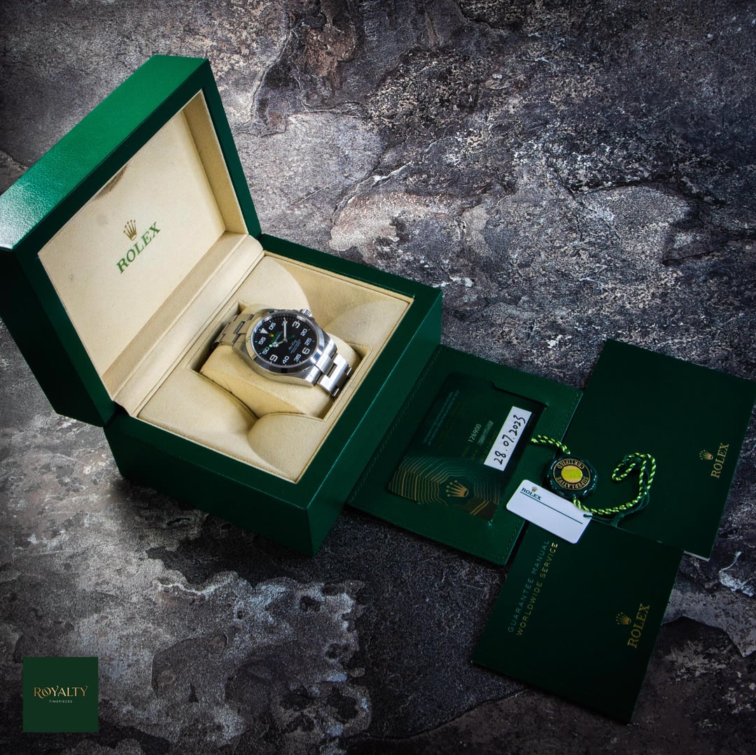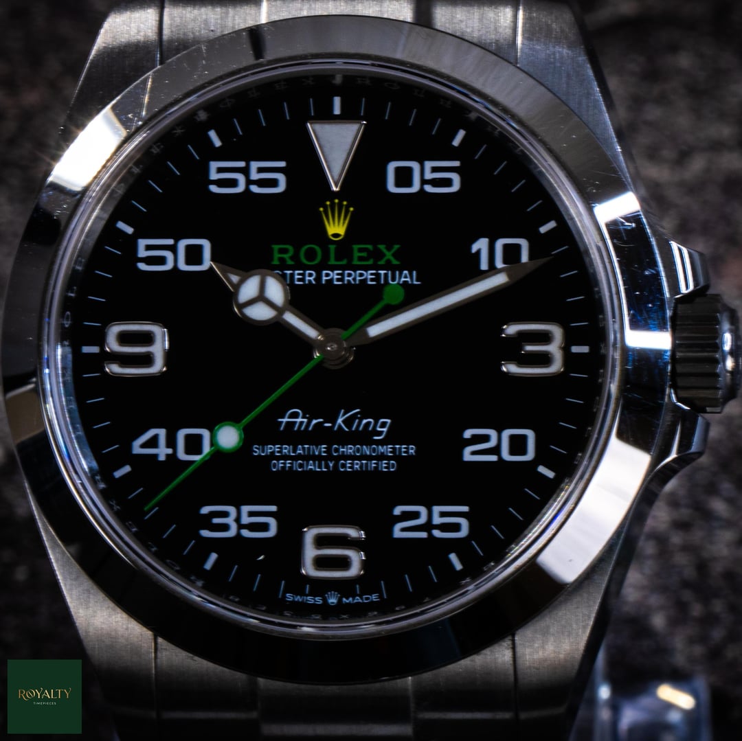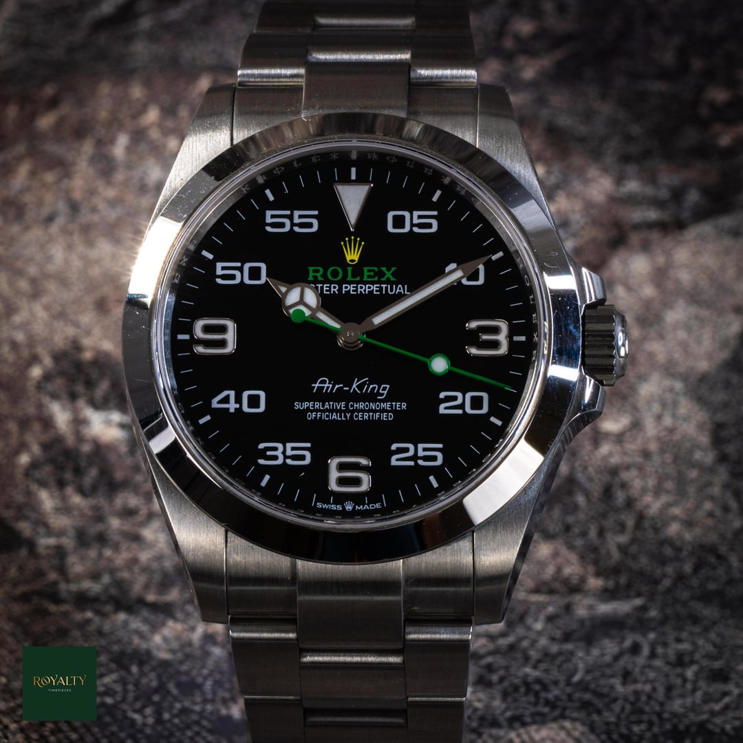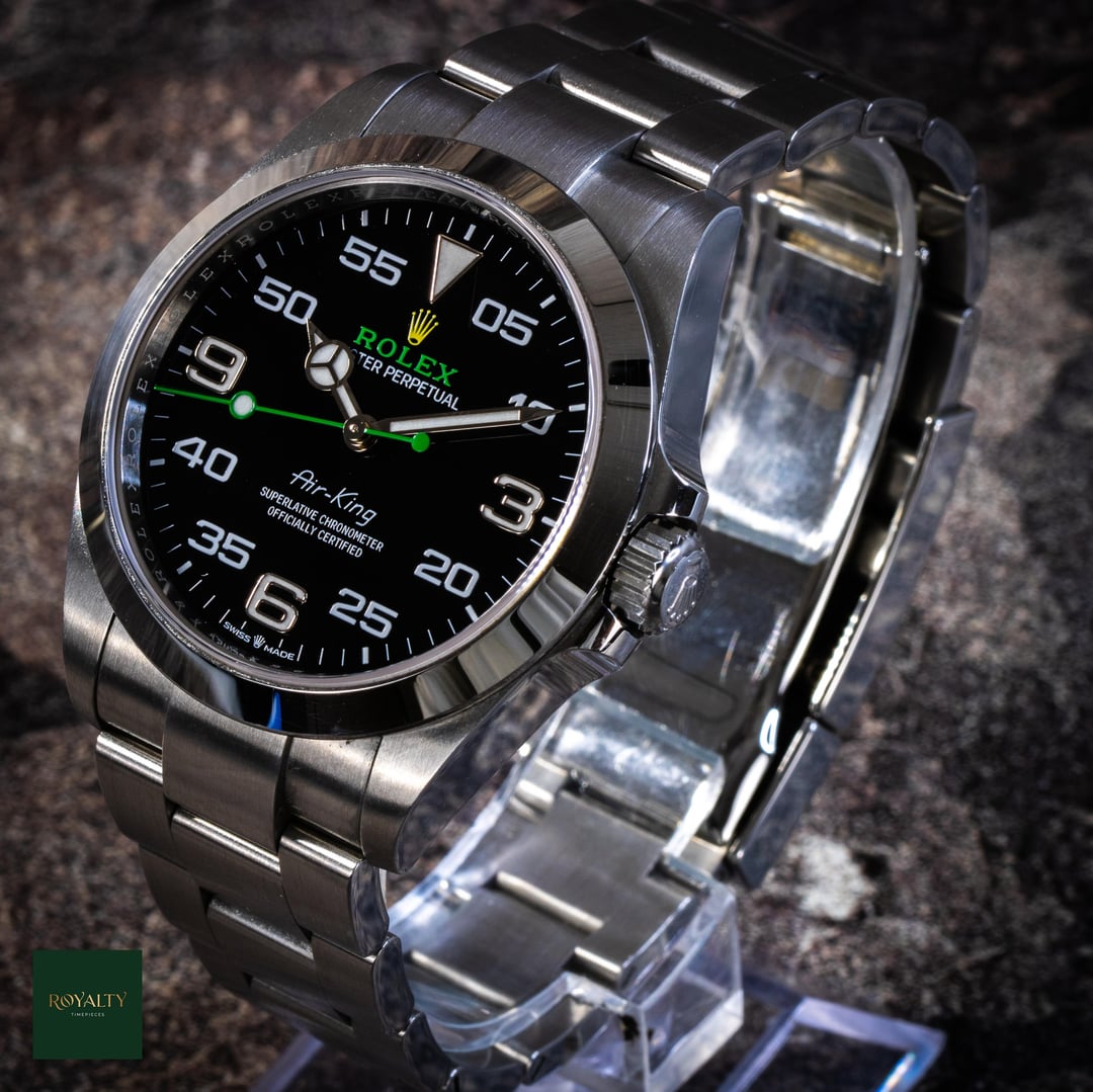 Rolex Airking 126900 Case: 40mm Condition: This timepiece is in **very good condition**, presenting as an honest, original example. It shows **light signs of wear on the case and bezel**, which are only visible under strong lighting. Crucially for the collector market, this watch has **never been polished or altered** in any way. The factory lines, chamfers, and brushed finishes remain razor-sharp and exactly as they left Geneva. It is a perfect candidate for daily wear or for a collector who prioritizes original case geometry over a temporary shine. Accessories: This offering is a **Complete Collector Set**, distinguishing it from standard listings. It includes: * Original **Rolex Double Box** (Inner Green Box and Outer Beige Box). * **Warranty Card dated 2023** (Warranty valid until 2028). * **Instruction Manuals/Booklets**. * **Green Warranty Hangtag** (Superlative Chronometer). * **White Serial Tag** (Often discarded, but present here for the complete package). * The watch comes mounted on its original **Rolex Oyster Bracelet**. The Rolex Air-King pays tribute to the pioneers of flight and the Oyster’s role in the epic story of aviation. The modern Reference 126900 represents a significant evolution for the model, introducing a completely redesigned case with crown guards and a straight-sided, professional profile. With its distinctive black dial featuring the "05" minute marker for perfect symmetry and the rare green and yellow Rolex logo, this timepiece is the only Rolex in the catalog that blends navigational instrument heritage with a touch of playful color. Powered by the cutting-edge Calibre 3230, it is a robust, legible, and historically significant tool watch. $7️⃣9️⃣5️⃣0️⃣ + 🏷️ MSRP: \~7.75k Shipping available to anywhere in CONUS. Shop with confidence, many references available and authenticity guaranteed! NY residents subject to sales tax without resale certificate IG: royalty.timepieces Timestamp: [https://imgur.com/jLuMUHc](https://imgur.com/jLuMUHc)