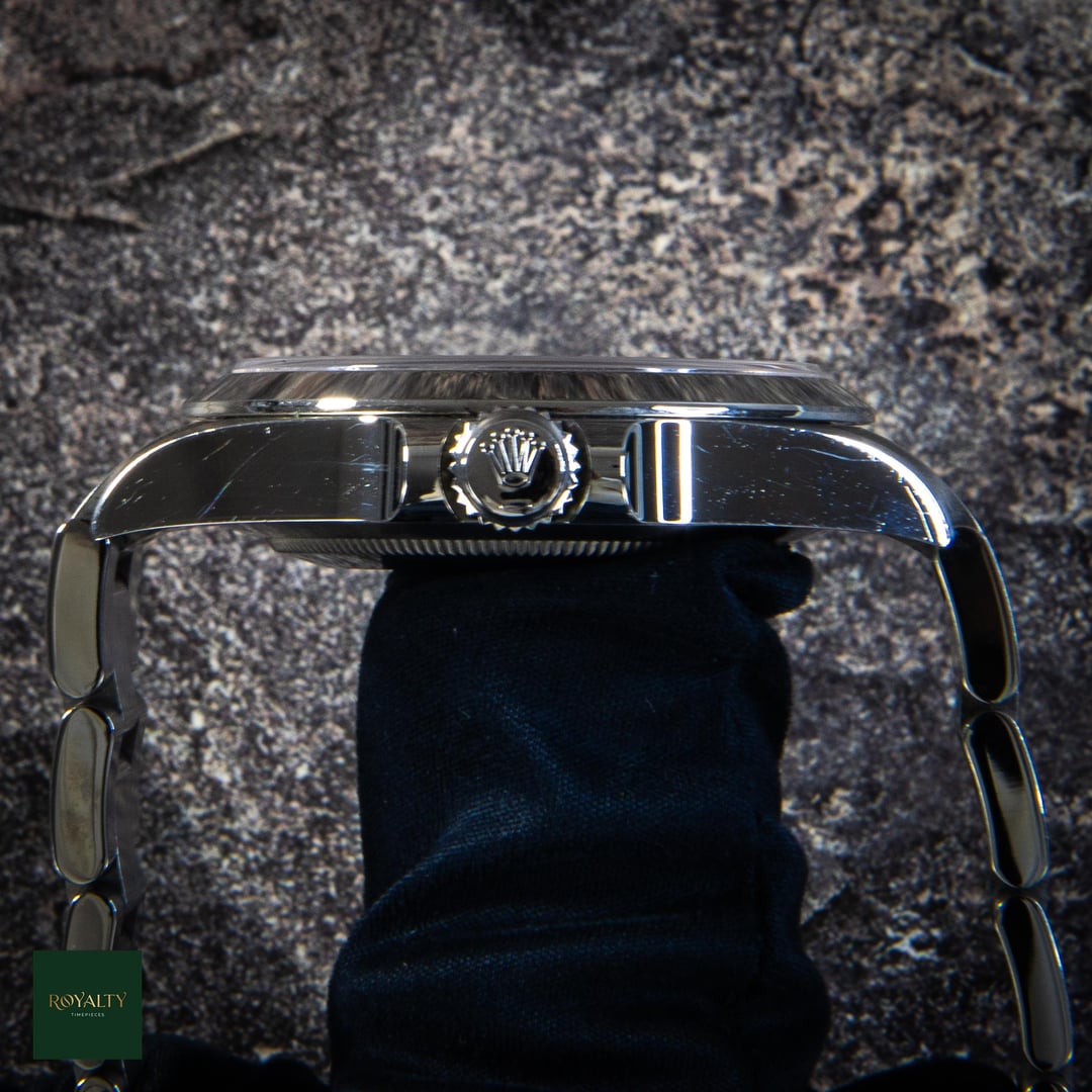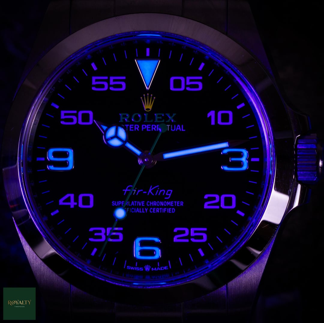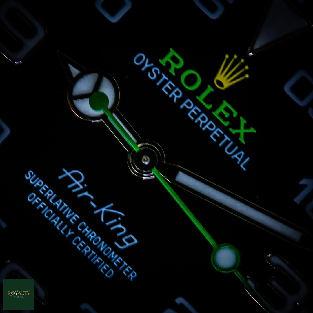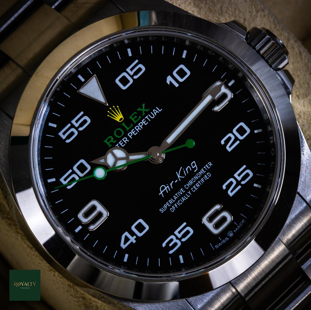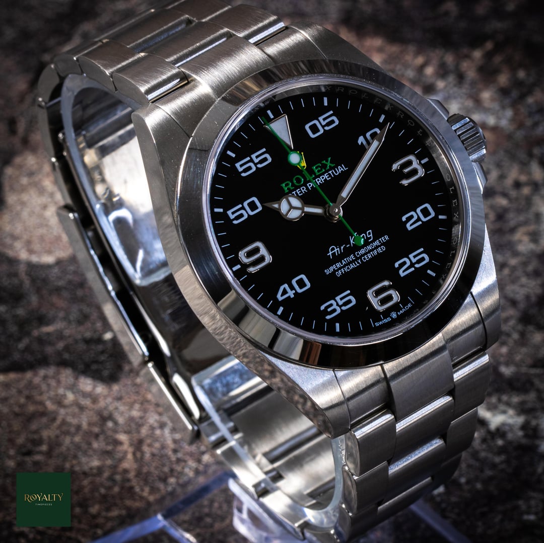 Rolex Airking 126900 Case: 40mm Condition: This timepiece is in **very good condition**, presenting as an honest, original example. It shows **light signs of wear on the case and bezel**, which are only visible under strong lighting. Crucially for the collector market, this watch has **never been polished or altered** in any way. The factory lines, chamfers, and brushed finishes remain razor-sharp and exactly as they left Geneva. It is a perfect candidate for daily wear or for a collector who prioritizes original case geometry over a temporary shine. Accessories: This offering is a **Complete Collector Set**, distinguishing it from standard listings. It includes: * Original **Rolex Double Box** (Inner Green Box and Outer Beige Box). * **Warranty Card dated 2023** (Warranty valid until 2028). * **Instruction Manuals/Booklets**. * **Green Warranty Hangtag** (Superlative Chronometer). * **White Serial Tag** (Often discarded, but present here for the complete package). * The watch comes mounted on its original **Rolex Oyster Bracelet**. The Rolex Air-King pays tribute to the pioneers of flight and the Oyster’s role in the epic story of aviation. The modern Reference 126900 represents a significant evolution for the model, introducing a completely redesigned case with crown guards and a straight-sided, professional profile. With its distinctive black dial featuring the "05" minute marker for perfect symmetry and the rare green and yellow Rolex logo, this timepiece is the only Rolex in the catalog that blends navigational instrument heritage with a touch of playful color. Powered by the cutting-edge Calibre 3230, it is a robust, legible, and historically significant tool watch. $7️⃣9️⃣5️⃣0️⃣ + 🏷️ MSRP: \~7.75k Shipping available to anywhere in CONUS. Shop with confidence, many references available and authenticity guaranteed! NY residents subject to sales tax without resale certificate IG: royalty.timepieces Timestamp: [https://imgur.com/jLuMUHc](https://imgur.com/jLuMUHc)
