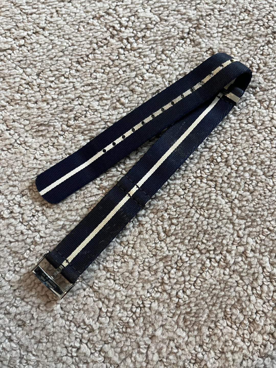 Up for sale is an Omega Nato Strap - 20mm - Blue + White Stripe Strap is in good condition with no tears, rips etc. Minor, if any, hairlines on clasp and strap guides. Includes strap only; no spring bars. $105 plus shipping Thanks!