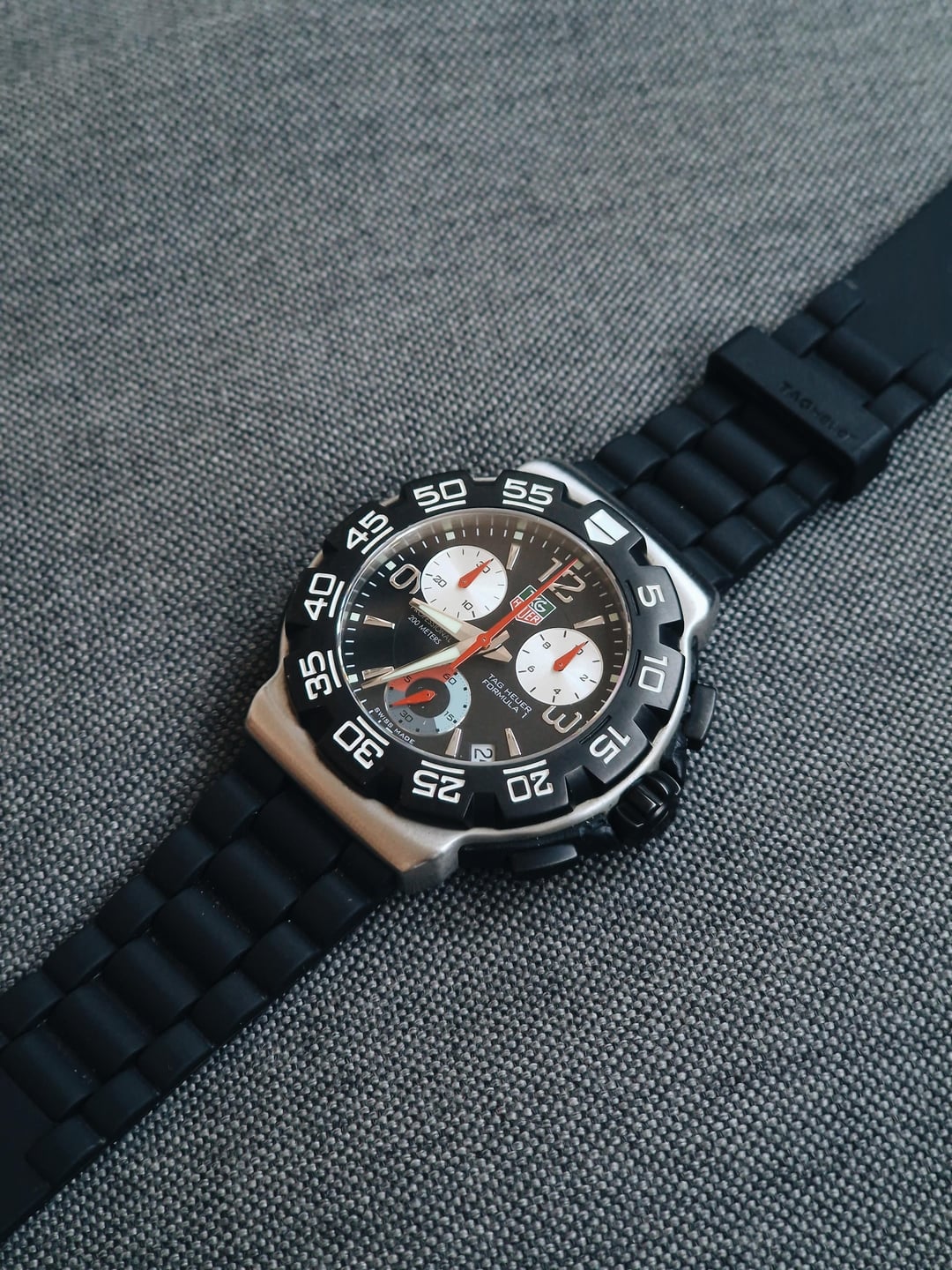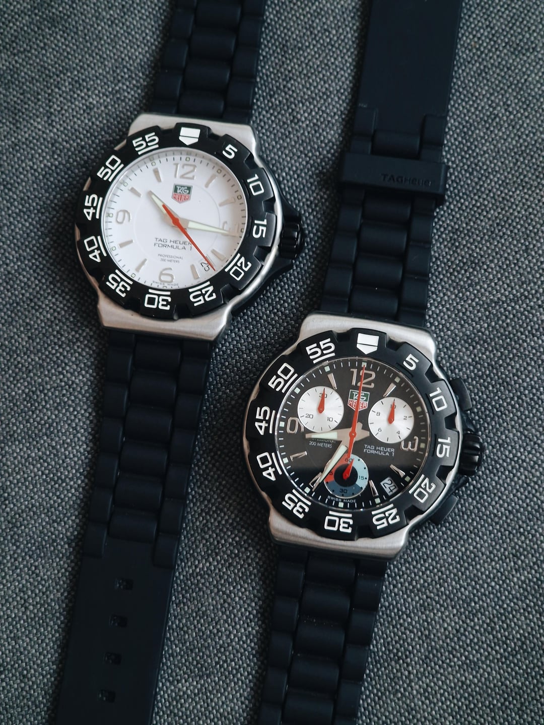 **1. TAG Heuer Formula 1 Ref. WAC1111-0** This is classic Formula 1 in its purest form – clean white dial, legible, and designed to take a beating. It’s the straightforward, bulletproof quartz sports watch TAG built its modern reputation on: tough case, zero nonsense. It’s the modern interpretation of the original ’80s Formula 1. Besides being light, it’s fun and unmistakably TAG. If you’re looking for a daily watch that can handle anything without trying too hard, this is exactly it. **Condition:** Very good. The watch only has a few hairline scratches on the side of the case, bezel and cashback. The crystal is spotless. The rubber strap has minor usage markings. Please see the pictures for full condition and clarity. **Case Size:** 41 x 47.6mm **Water Resistance:** 20 ATM (200M). **Movement:** ETA F06.111, quartz with 3 jewels, date at three with quickset. **Strap:** Original black rubber strap with signed buckle, 20mm width. **Box/Papers:** None **2. TAG Heuer Formula 1 Chronograph Ref. CAC1110-0** This TAG Formula 1 takes the familiar F1 silhouette and adds the sharp, instrument panel feel of early 2000s quartz chronographs. It features a black dial, oversized pushers that give it a sportier look, and a reliable quartz movement. It’s the kind of chrono built for real-life use – timing laps, boiling an egg, you name it. Solid wrist presence, great legibility, and the rugged feel the Formula 1 has always nailed. One of the best watches money can buy for less than $1,000. **Condition:** Good. The rubber sides of the case have some damage, which is common with these models. The rest of the case and the bezel are in impeccable condition. The crystal is spotless. The rubber strap has very minor usage markings. Please see the pictures for full condition and clarity. **Case Size:** 41 x 47.6mm **Water Resistance:** 20 ATM (200M). **Movement:** ETA G10.711, quartz with 4 jewels, 30-minute chronograph function, and date at 4:30. **Strap:** Original black rubber strap with signed buckle, 20mm width. **Box/Papers:** None Both watches come with a 2-year mechanical warranty on movement and timekeeping. This warranty does not cover water damage, accidents, or negligence. Water resistance is not guaranteed, unless pressure tested by a professional before use, as it is an older timepiece. **Price:** Asking $1,100 Please add $35 for worldwide shipping. Payment methods include Wise, ACH transfer, Revolut, Bitcoin (On-Chain or Lightning), or PayPal G&S for buyers with solid references. Add +7.5% for currency conversion fees on the latter. Portugal has suspended all local post shipments to the US, but I can still ship with UPS ($100). US buyers may have to pay a 15% tariff on arrival. Established seller with over 220 transactions – buy with confidence! Make sure to follow me on Instagram (@daily.worn) to check out the newest additions. Happy to answer serious inquiries. No trades, no lowballs. [F1 White Dial Pictures](https://imgur.com/a/Dm6IkFj) [F1 Chronograph Pictures](https://imgur.com/a/lquIChP) [Timestamp](https://imgur.com/a/EW1Rx8o)