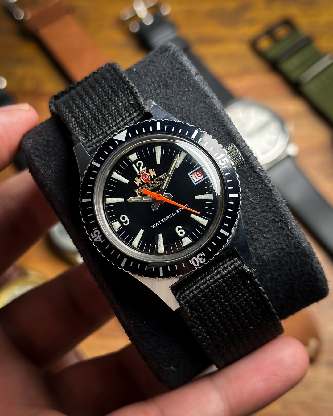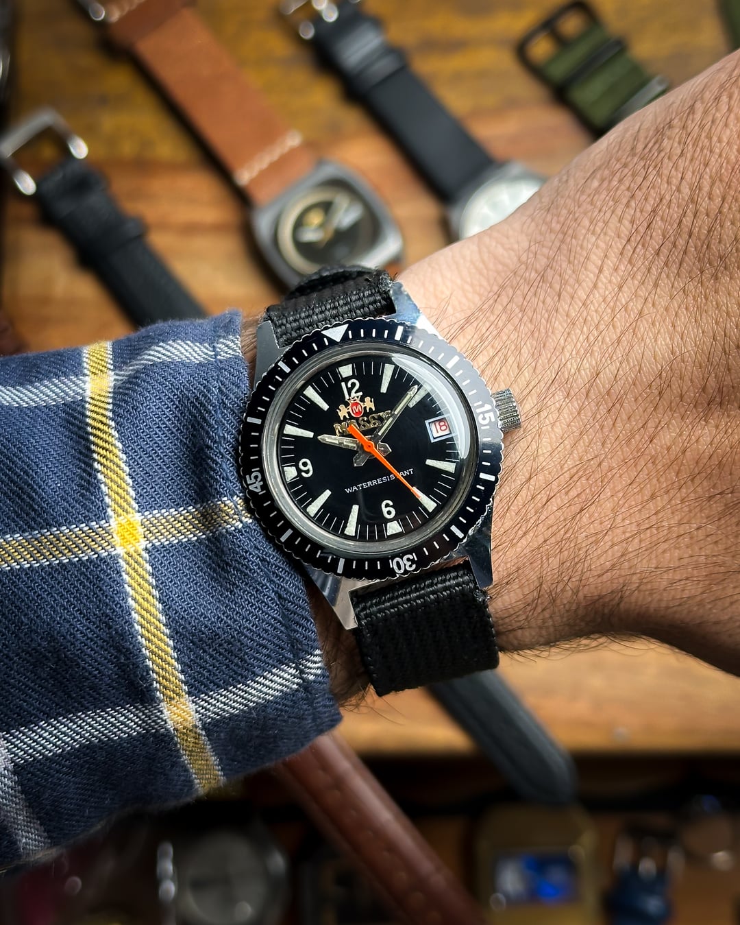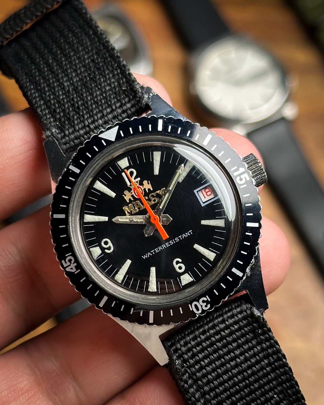 [Timestamp](https://postimg.cc/hXzHTtmB) Hey Watchexchange! This is the **Deep Orange Tango**—a nickname we gave this charming, manual-winding Swiss timepiece to celebrate its bold black dial contrasted sharply by the high-visibility orange second hand and red date wheel, a vibrant color combination reminiscent of the Tango. This watch stands out with its classic 1970s **"skin diver" aesthetic**, unidirectional bezel, and reliable movement, making it an excellent and affordable entry into vintage diving watches with real character. As a brand focused on the mass market, **Massy** was one of many smaller Swiss companies during the 60s and 70s that specialized in **inexpensive** but reliable tool watches. Massy often sourced robust mechanical movements to produce fun, distinctive diver styles like this one. While detailed historical records are sparse, this watch represents a great piece of affordable vintage Swiss watchmaking that retains the bold style of the era. Up front, the dial is the star: a deep, **flat black color** that is reflective yet incredibly legible. The dial features crisp **lume indices** and bold Arabic numerals at 12, 6, and 9, giving it a classic military look. The lumed hands are highly visible. The highlight is the **bright orange second hand**, which delivers the perfect visual **"pop"** against the dark dial. (Note: The second hand is non-luminous; in lume shot, it may appear to glow, because it's taken under UV light). A functional date window at 3 o'clock displays **red numbers**. The watch features a classic 1970s diver case with a unidirectional rotating bezel that has a clean black insert. As a hand-wound mechanical watch, it has a beautiful, audible ticking sound. It’s paired with a durable black two-piece NATO-style strap that complements the bezel and dial perfectly, ready for everyday wear. # 🔹 Dimensions * **Case Diameter: 34mm** (without crown) * **Lug-to-Lug: 43mm** * **Thickness: 11mm** * **Lug Width: 16mm** 💵 **Price: $135 shipped** 🚢 **Shipping: UPS (Worldwide)** 📦 **Payment: PayPal F&F** or G&S (**+4.5% fee by buyer**) or **bank wire** (US banks accepted) 📩 DM me for more pics or a custom timestamp. If you’re after a bold, authentically 70s Swiss mechanical diverwith a great ticking sound and that signature orange pop, this Massy delivers beautifully. Follow my Instagram **(link in bio)** and Reddit profile for more vintage drops and upcoming listings.