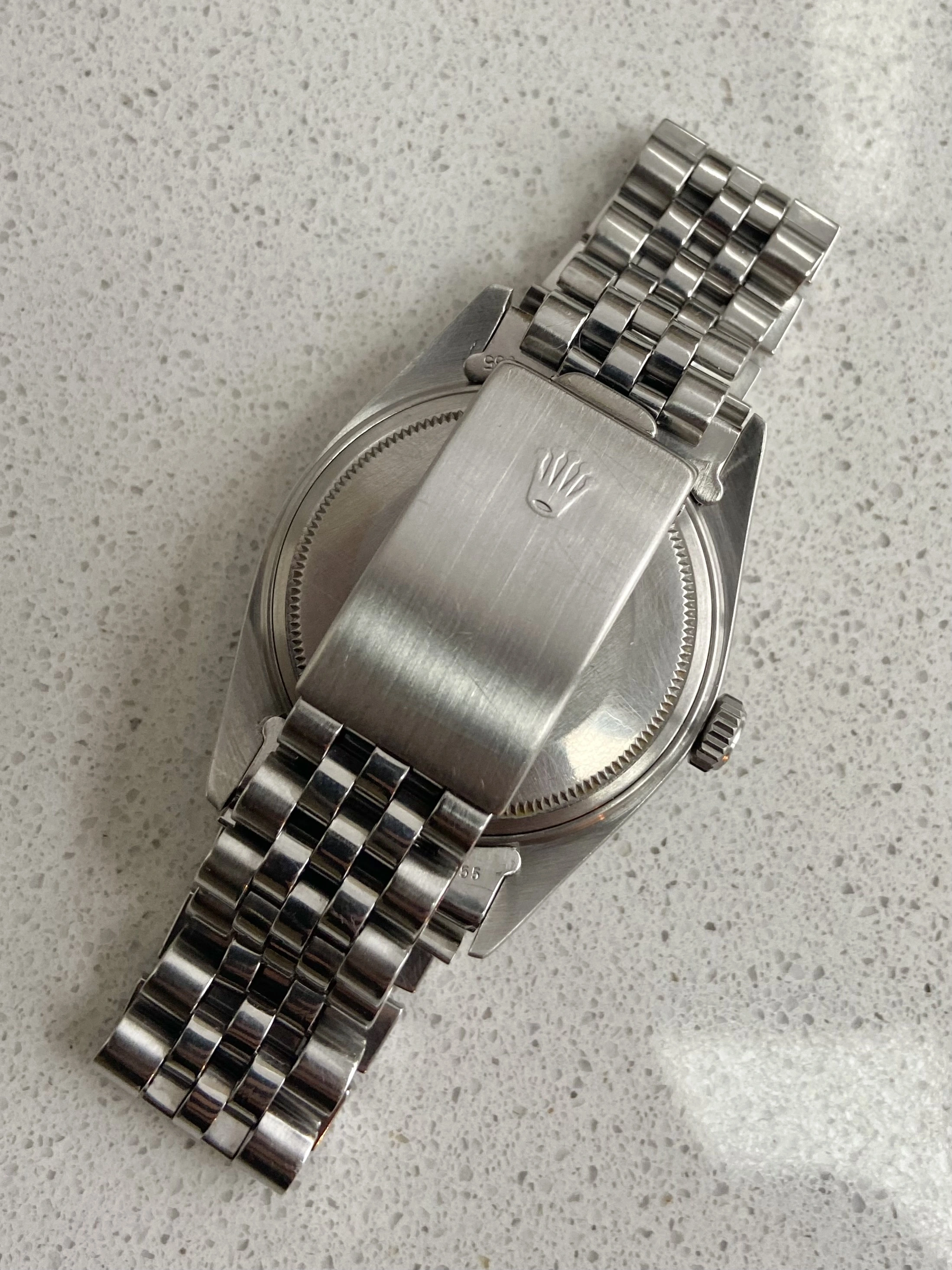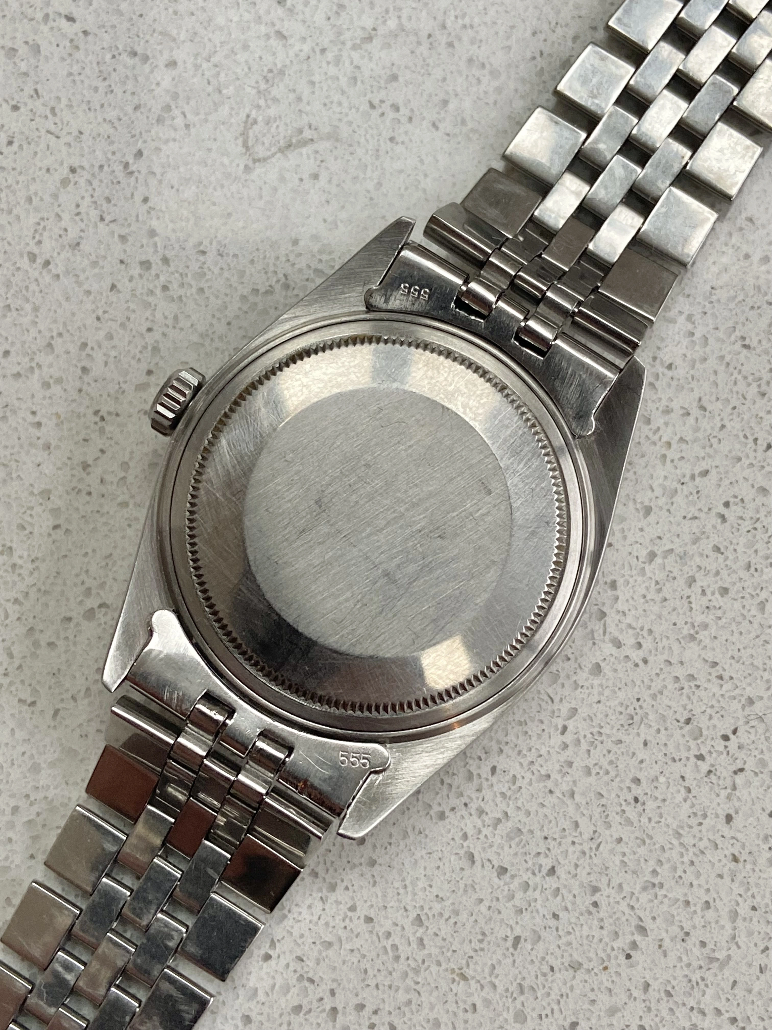 The 36mm 1603 stainless steel case with engine turned bezel is in good condition, nice and thick with no damage or corrosion and has been previously polished by Rolex.