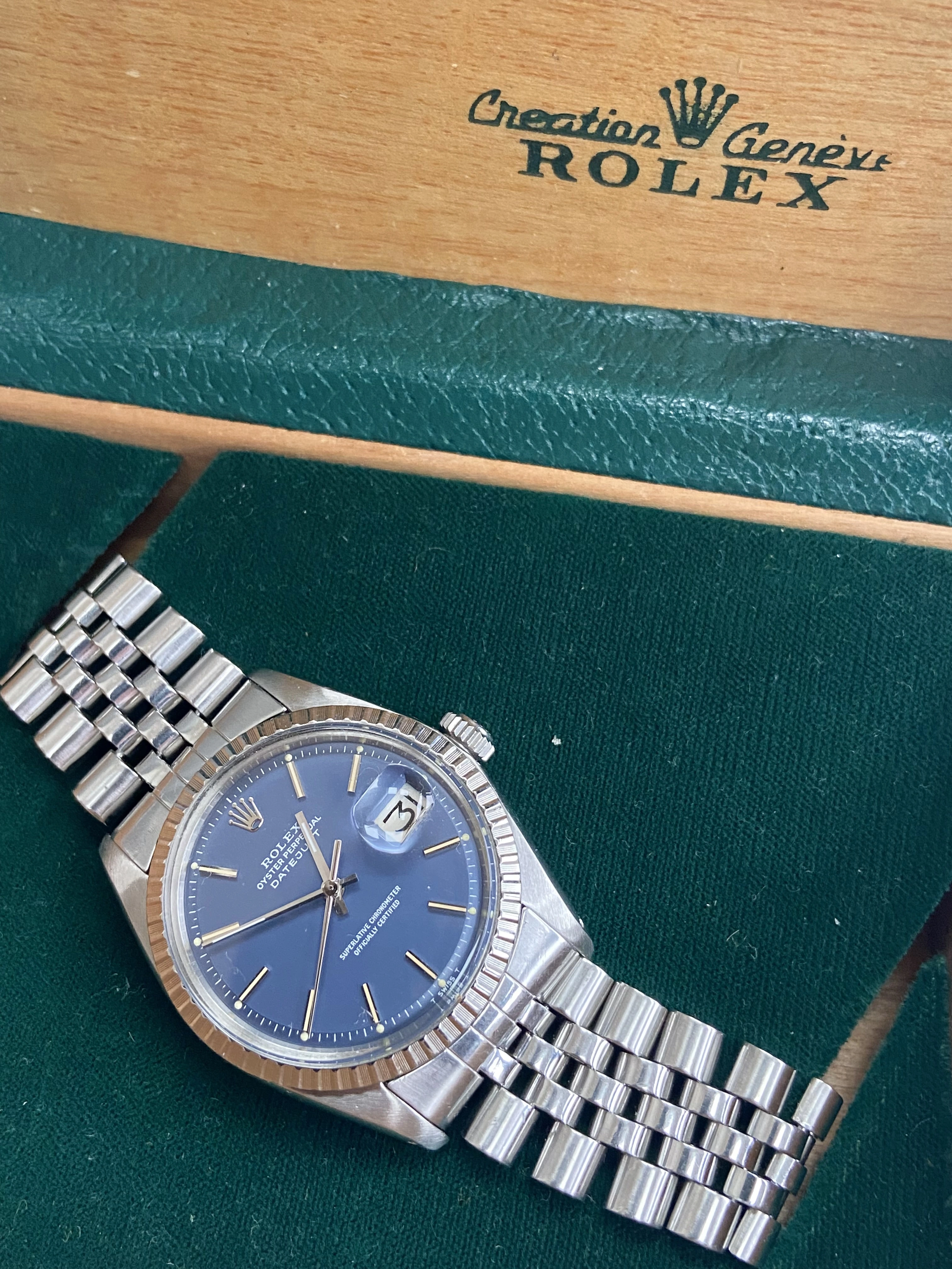 Offering for sale a vintage 1970’s Rolex DateJust 1603 with blue pie pan type dial. I’ve had a 16030 blue dial datejust before but this blue is nicer, less saturated and more of a pastel blue. Comes with its original coffin style Rolex box and service cards showing it was fully serviced by Rolex in 2011 and 2017.
