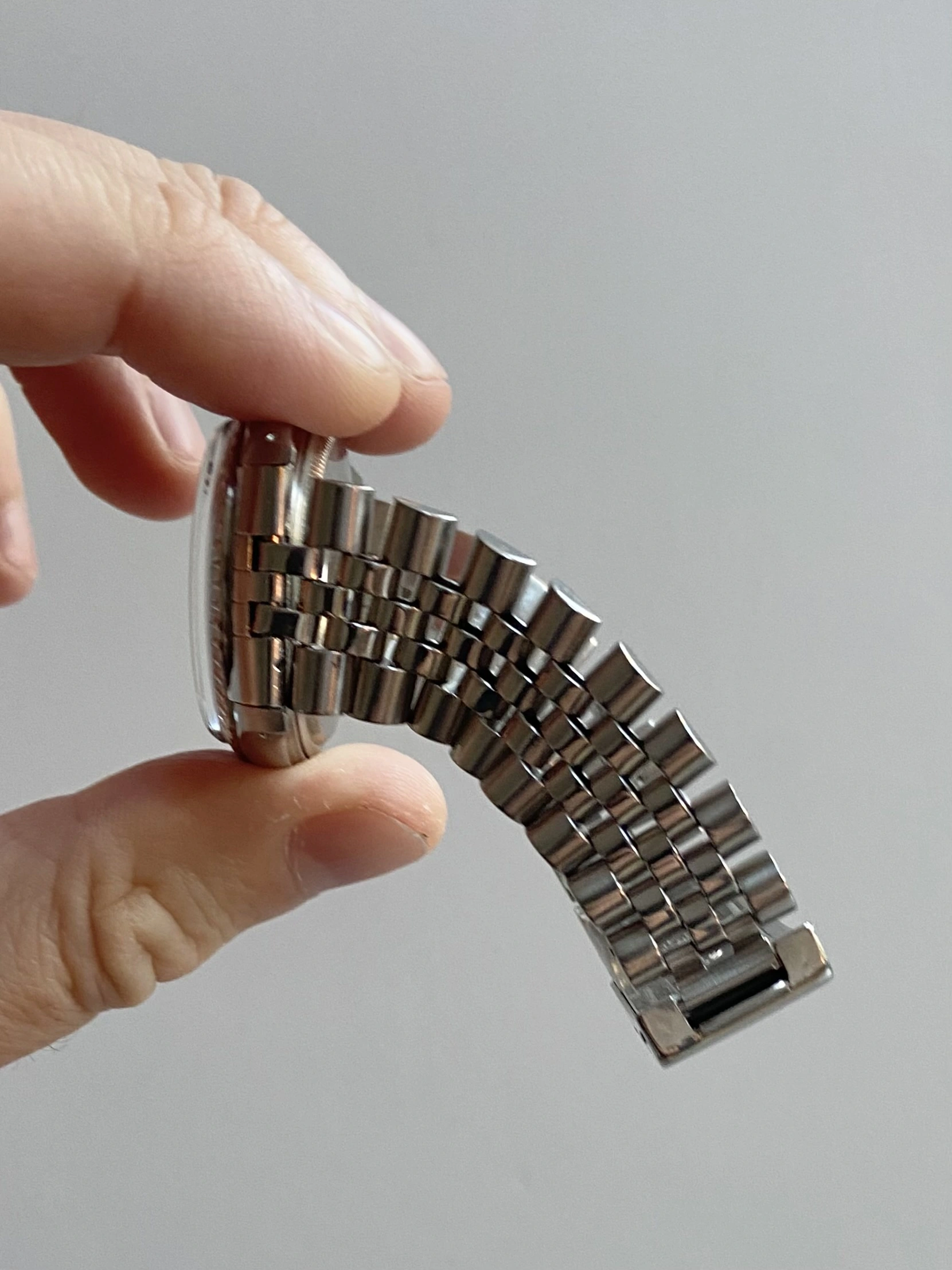 The bracelet is a genuine Rolex jubilee, ref 62510H dated 1985. It does have some stretch as is common for a vintage bracelet, but perfectly wearable.