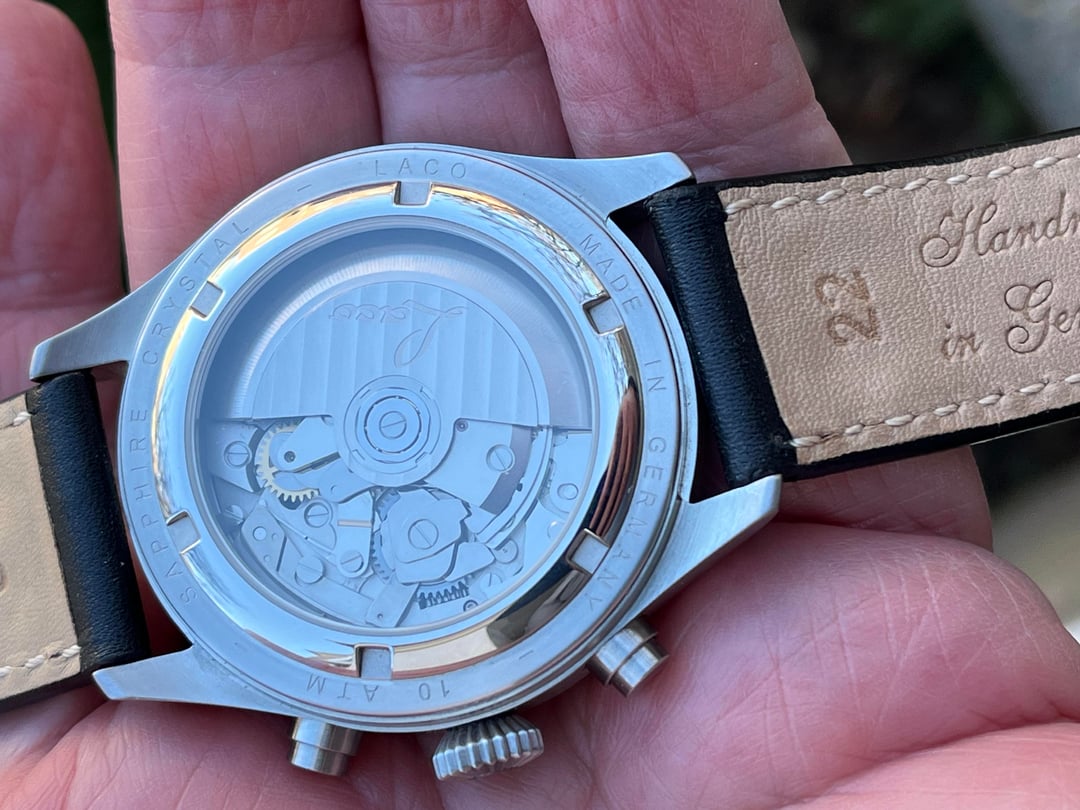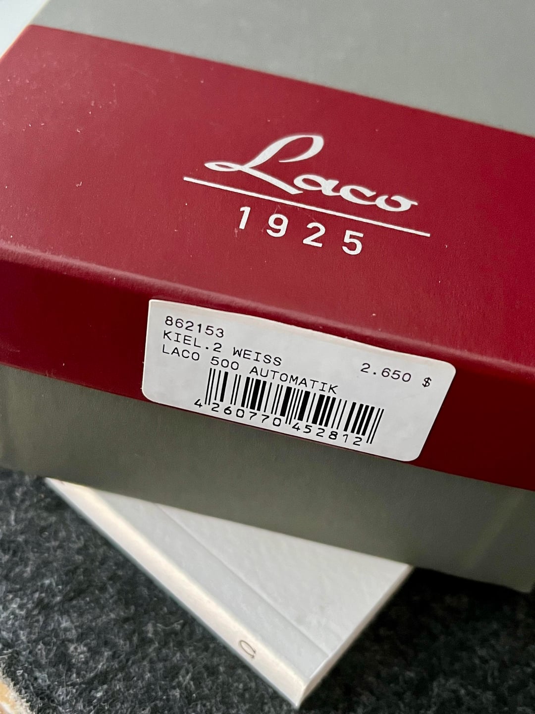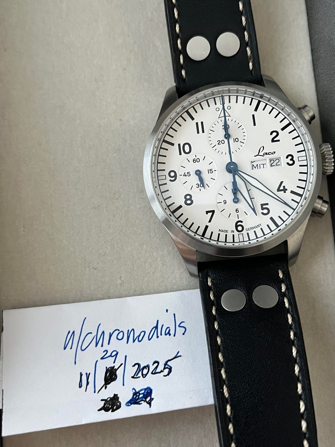 Beautiful watch - IWC Vibes - Near mint - Strap appears unworn. See my video, pics, and website links. A couple of Base specifics within Laco options - Movement - Laco 500 (Elabore’ Sellita SW 500). German day display (standard). Still under factory warranty until 03/2026 CompanyWebsite [https://www.laco-watches.com/en/watches/chronographs/kiel-2-weiss?srsltid=AfmBOorNnVyKNyx9c\_2TcfYblp4FaDN3z1bi\_KoLYHadgWyeZyOxHoz0](https://www.laco-watches.com/en/watches/chronographs/kiel-2-weiss?srsltid=AfmBOorNnVyKNyx9c_2TcfYblp4FaDN3z1bi_KoLYHadgWyeZyOxHoz0) My Video [https://imgur.com/a/CRtsrBR](https://imgur.com/a/CRtsrBR) QuickTake [https://monochrome-watches.com/hands-on-the-brutally-honest-laco-kiel-2-chronograph-specs-price/](https://monochrome-watches.com/hands-on-the-brutally-honest-laco-kiel-2-chronograph-specs-price/) $1320 Firm Shipped Conus Payment - Zelle, Venmo, FF, or Wise (1.5% fee) Pics and timestamp in the listing