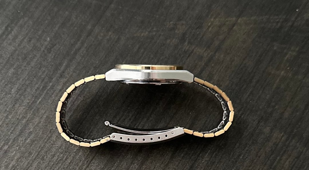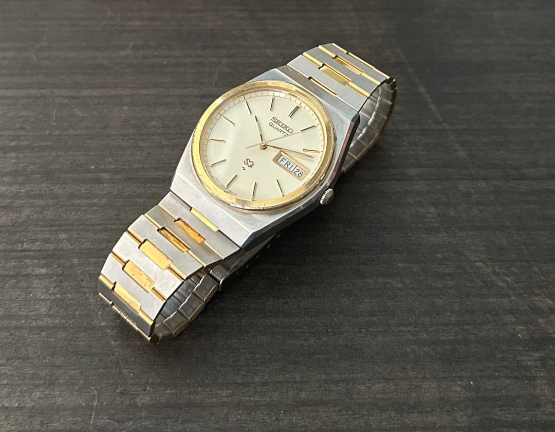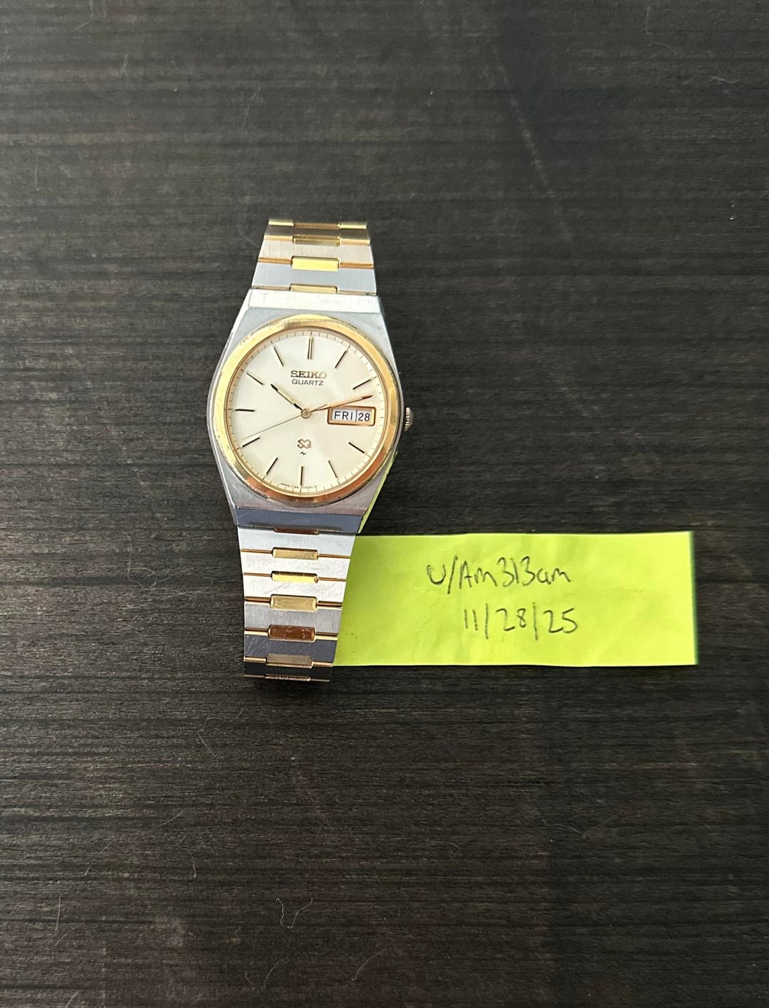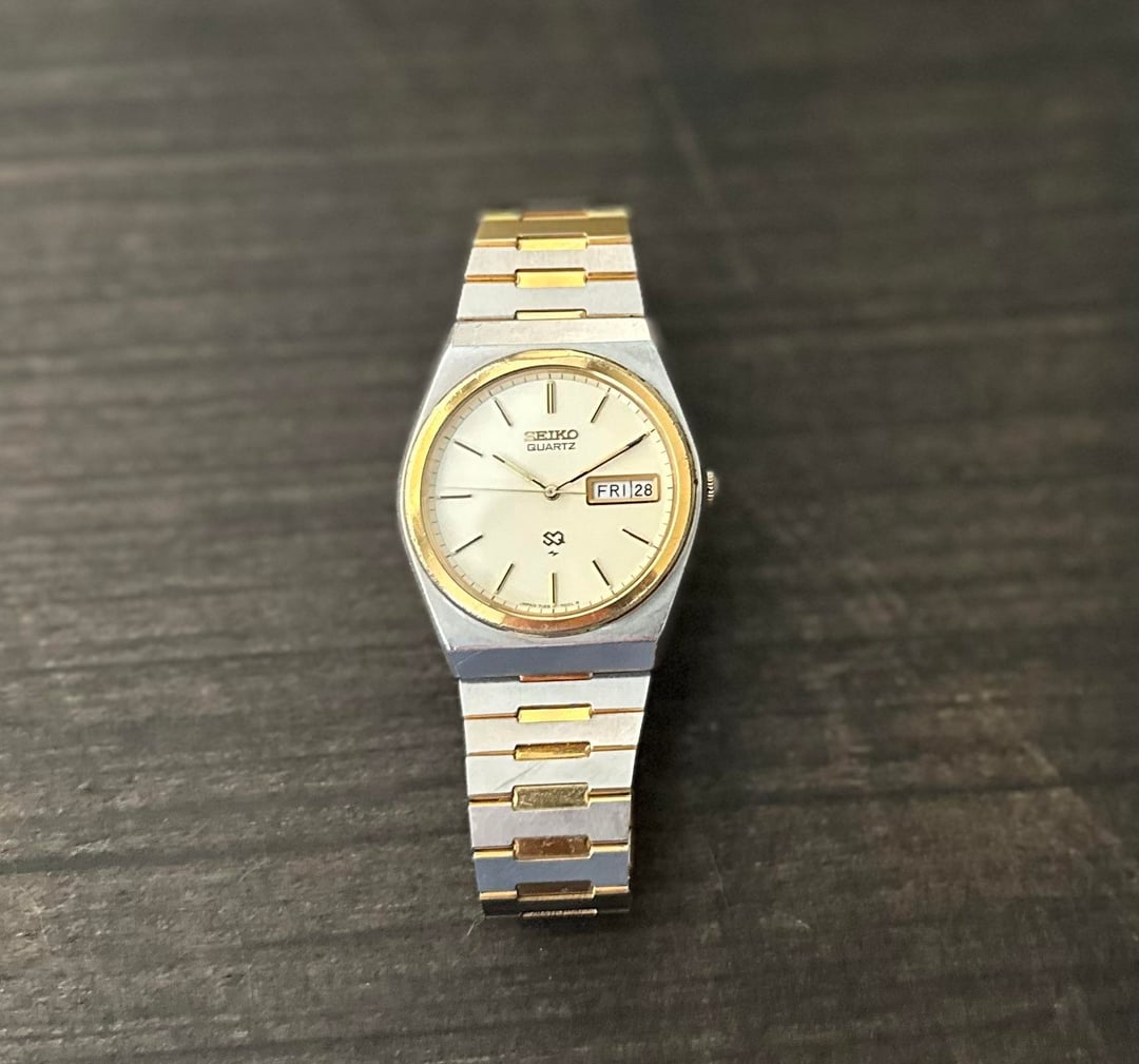 For sale is this awesome vintage Seiko SQ 7126-7000. The 7126 quartz movement features a day/date function and keeps perfect time, and the battery was replaced this month. The dial, hands, and crystal are in perfect condition. The two-tone case and bracelet are in good shape with wear marks typical for its age, as shown in the photos. Case measures 36 mm w/crown and 40 mm lug-to-lug. Crown has a scratch and some wear but is in decent shape. The bracelet is sized for an 8 inch wrist and the clasp has 7 micro adjustment holes. No extra links. Asking $75 which includes CONUS shipping. Prefer Zelle, CashApp, or Venmo. Happy to answer any questions. Thanks for looking!