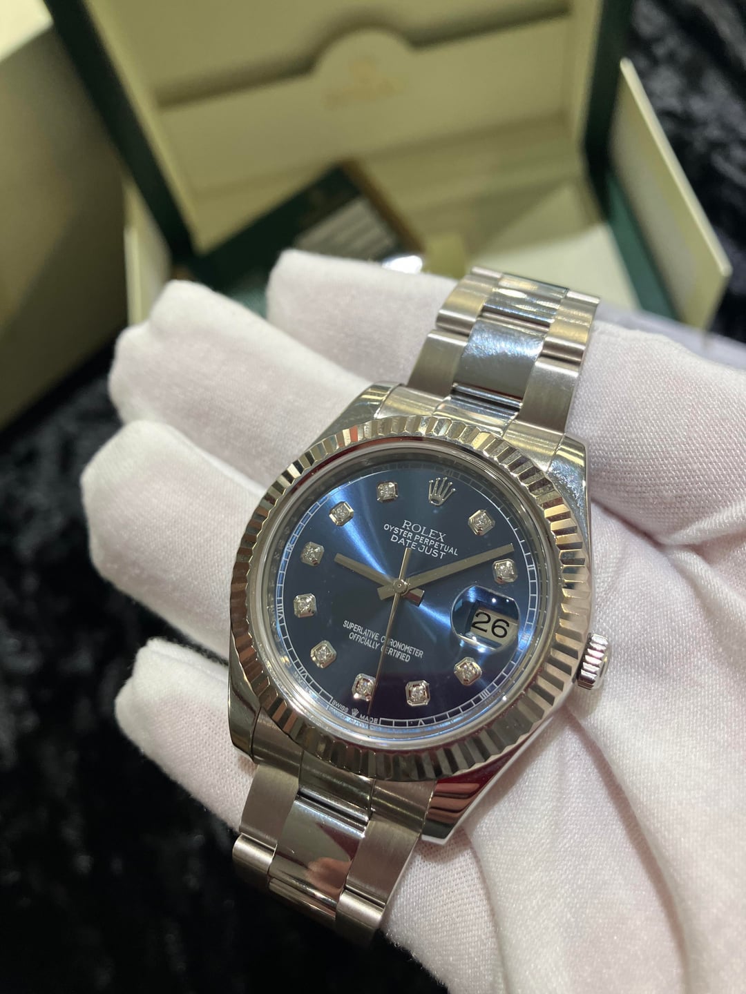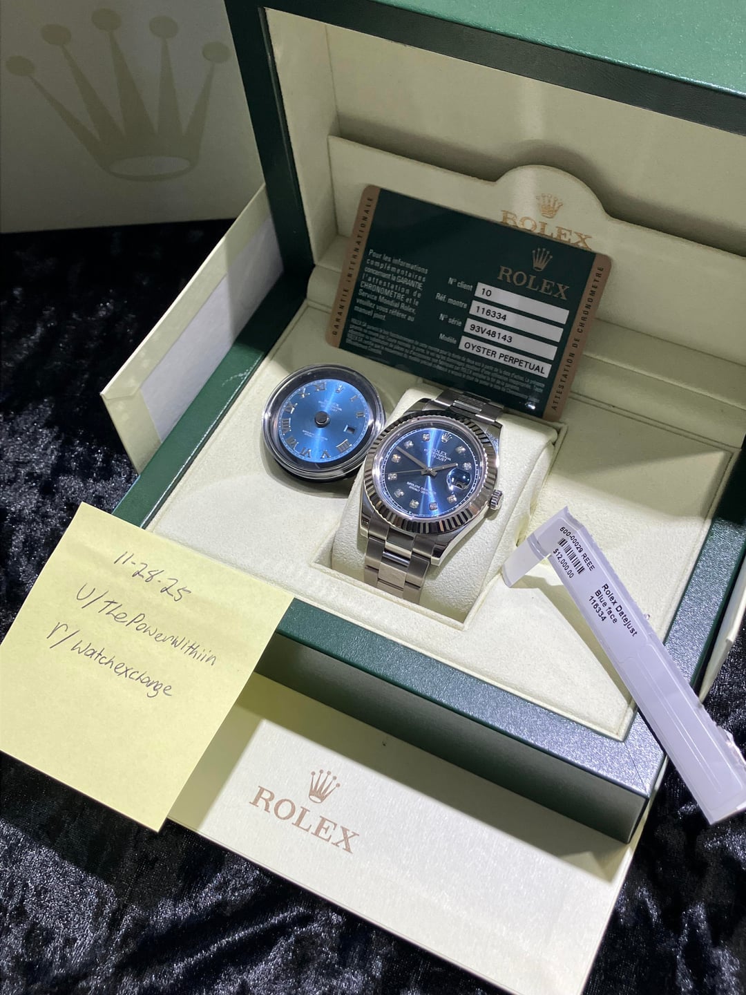 Hello watch exchange, I have a beautiful 116334 Rolex date-just mint condition Blue dial, white gold fluted bezel 41mm the dial that’s in the watch right now is an aftermarket diamond dial and comes with the original Roman numeral blue dial and the bracelet is original -2 links. The clasp on the bottom with the satin finish is aftermarket. Buckle is authentic, but just that piece that is at the bottom of the watch is aftermarket, if you want the original, I can get it through a Rolex parts account, but the price would fluctuate, The watch is a 2012 with card and Rolex box. Insured free shipping in U.S Price- $11,000 Payments- Zelle Timestamp- https://imgur.com/a/E1ksA2H