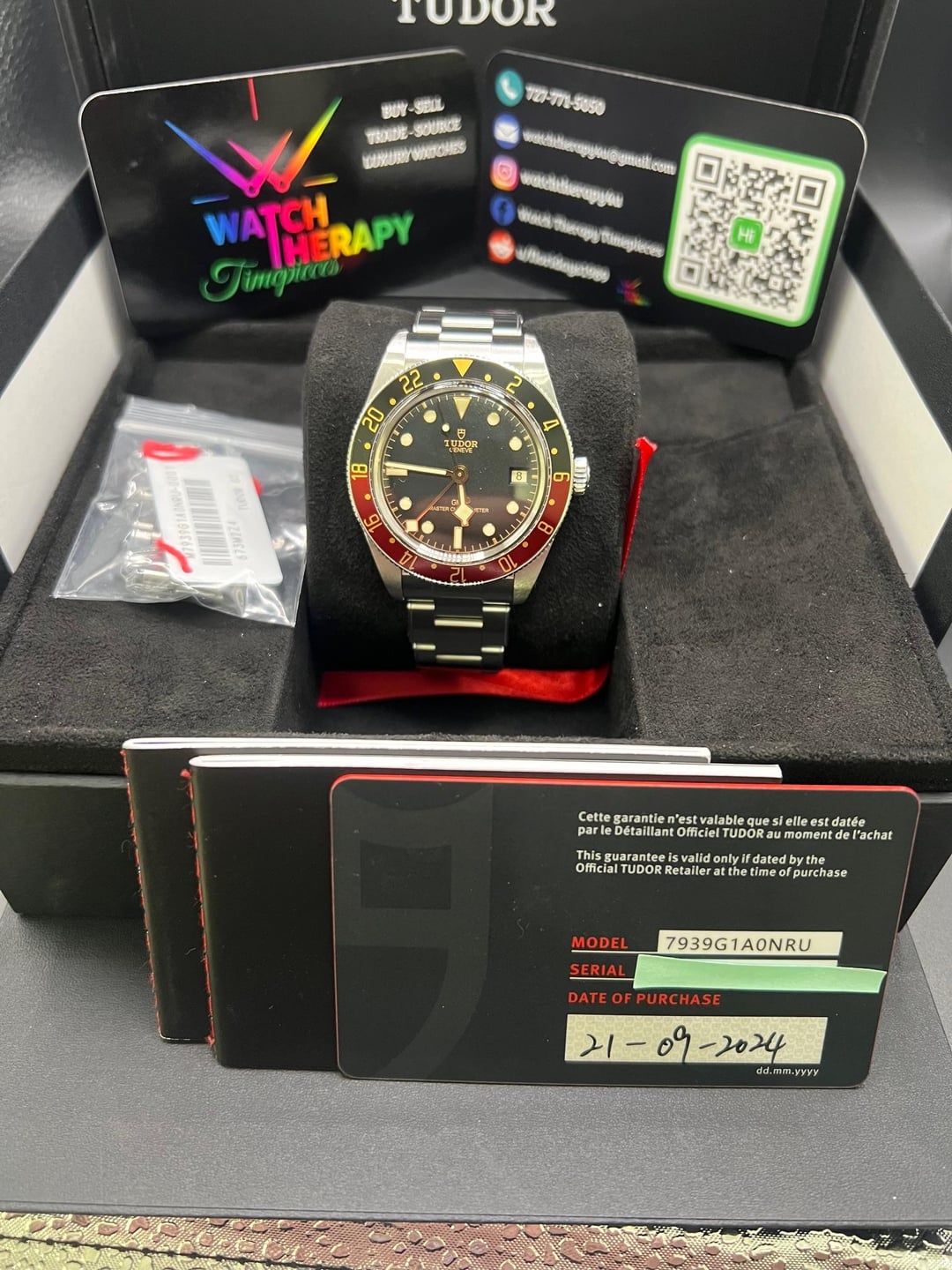 **F/S: 2024 Tudor Black Bay 58 GMT 9/24 7939G1A0NRU “Coke”** **Shipping from Florida!** **Specs:** \* Beautiful black domed gilt dial w/Back and Burgundy Bezel \* Self-winding \* Size 39 SS case w/SS bezel and aluminum bezel \* Three-link SS bracelet with T-fit clasp \* 200M Water Resistance \* 65-hour power reserve \* MT5450-U (COSC-METAS) movement **Includes**: Warranty card 9/24, double boxed, booklets, tag, all links. **Condition:** Excellent pre-owned shape- a few swirl marks on the case, a couple hairlines here and there, but no dents or bytes. Crystal and bezel are clean, **Price: $3949.00** [**+ Insured shipping to your local FedEx for pick-up** ]()**in Con US**. I am also open to a face-to-face public transaction in or around the Tampa Florida Region, within reason. I have many strong and viable references within Reddit and from Buy/Sell/Trade Watch Facebook groups. Always willing to jump on a call or meeting link to show you the watch. Thank you and please reach out if you have any questions or concerns. Florida residents may be subject to sales tax w/o a valid reseller cert. ***No Trades, TY*** **Location**: Tampa Florida **Payment:** Zelle or Wire Timestamp: [https://imgur.com/a/aWpGol0](https://imgur.com/a/aWpGol0) FB: Watch Therapy Timepieces IG: [@watchtherapy4u](https://www.reddit.com/u/watchtherapy4u/)
